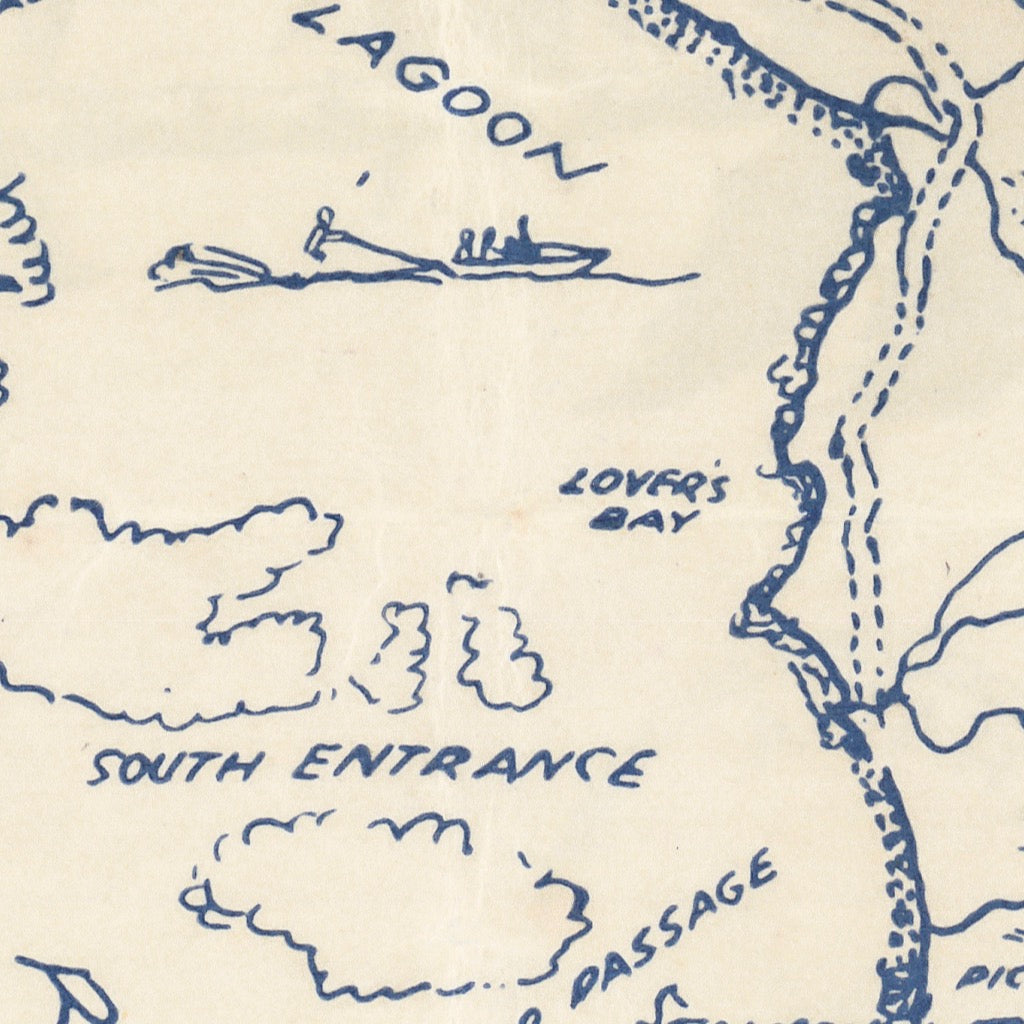 'From the Curio Shop "Palm Grove" Lord Howe Is.' A charming 1960s map showing local features including including surfing, sunbaking and swimming beaches, rock fishing spots, picnic grounds, sea planes, the 'biggest banyan tree on the island', 'Captain Cooks goats' and 'buried treasure' (Georges Bay), as well as shops and services.