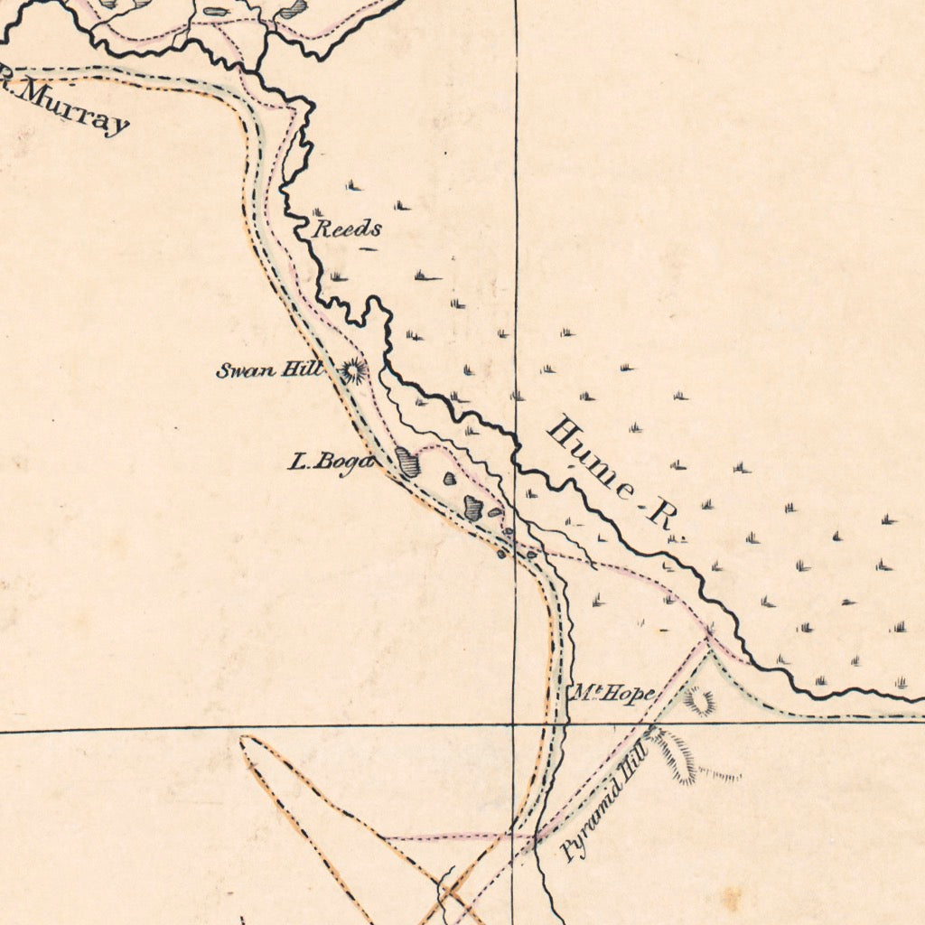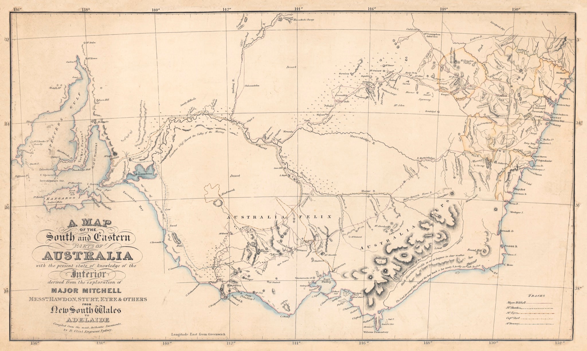 A great explorers map of southeastern Australia before 'Victoria' was gazetted from NSW, and referred to by Thomas Mitchell as 'Australia Felix'. The map features exploratory tracks of Mitchell (1836), Hawdon (1838), Eyre (1838-1839), Capt.n Sturt (1838), and Bonney (1839).