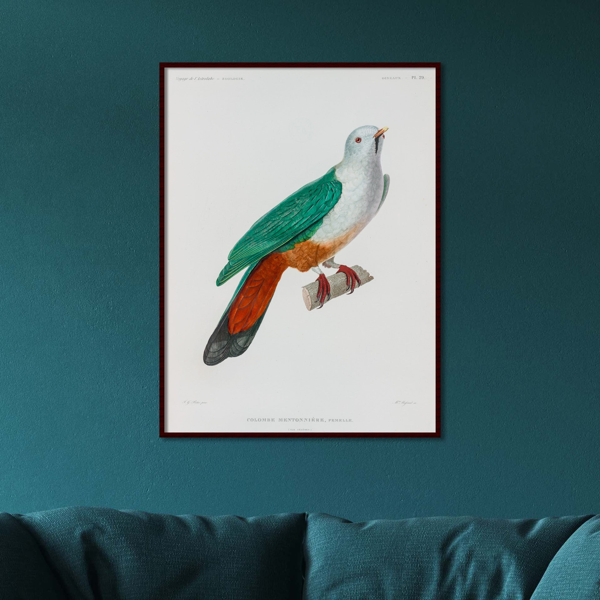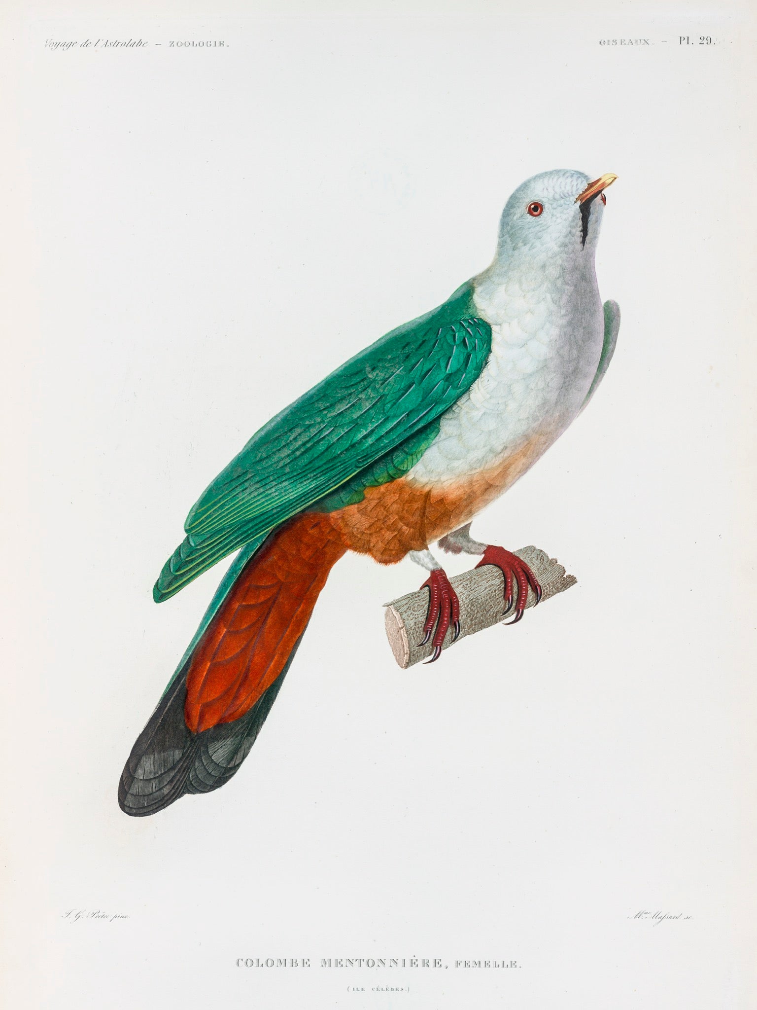 From Dumont D'Urville's Voyage of the Astrolabe 1826-1829. .Comte Jules Dumont d’Urville sailed to Sydney, Hobart and large parts of the Australian coast as part of a lavish expedition of scientific discovery in the Australia-Pacific region, including New Zealand and the East Indies. The scientific illustrations are extraordinarily fine. The account of the Voyage of the Astrolabe was published in 1835. The principal artist was Louis Auguste de Sainson (1800-1887)...(Columbe) Pitolope mentonnierre, female - Fruit Dove, Celebes..(‘Voyage de la corvette l’Astrolabe exécuté par ordre du roi: pendant les années 1826-1827-1828-1829’)