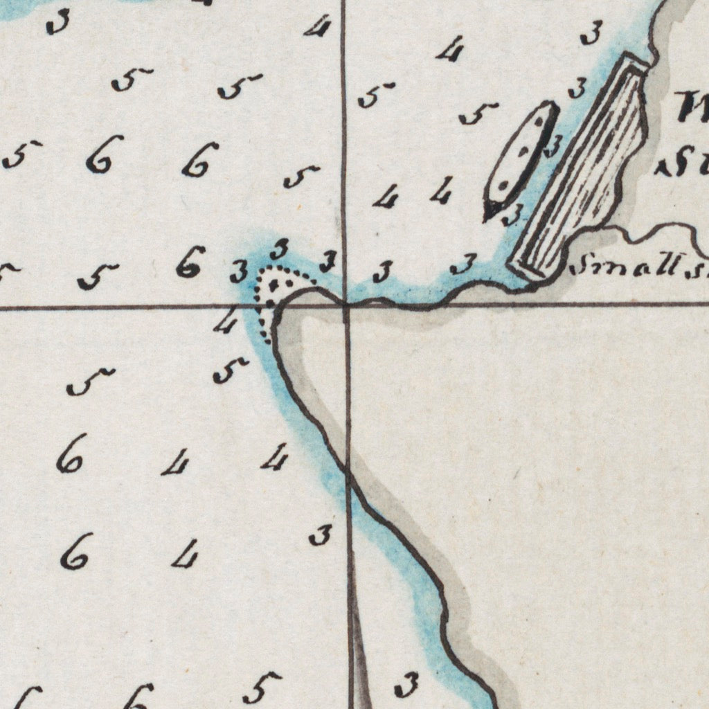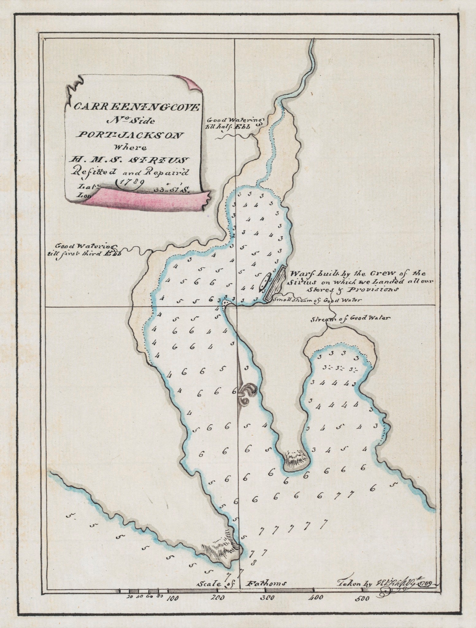 A fine map showing the origins of European settlement in Mosman Bay, where the First Fleet vessel the HMS Sirius was careened, 'repaired and refitted', in 1789. The sheltered deep water anchorage and nearby freshwater creeks made a first-rate site for a wharf, and later a base for whaling ships.