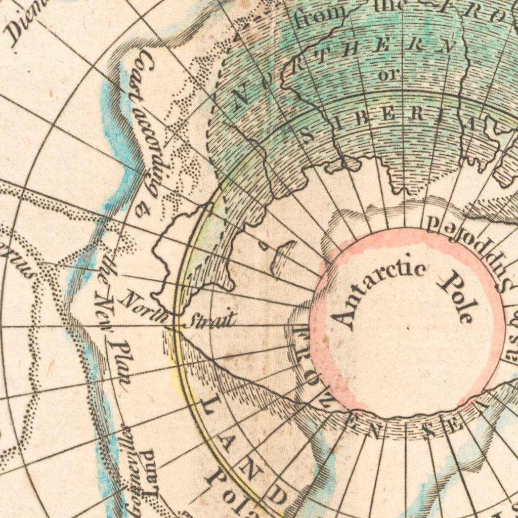 'According to the New Hypothesis of Mr Buache. From the Memoirs of the Royal Academy at Paris.' An English publication of a .early representation of Australia as New Holland with speculative east coast before Cook sighted it a century after this map was published. Map refers to the Southern Continent, with NSW called Holy Ghost Land. NT is Diemans Land. A beautiful early map of the South Pole.
