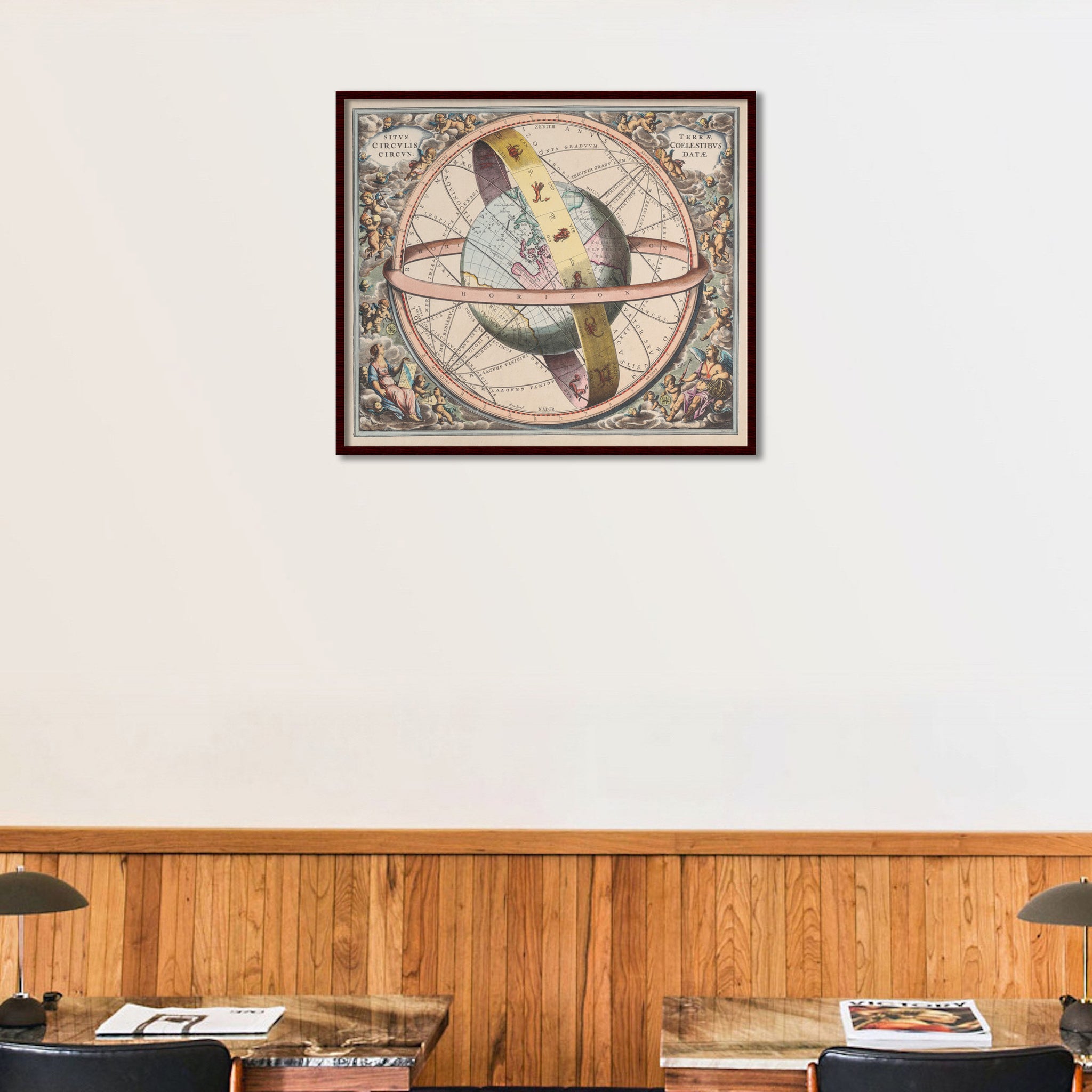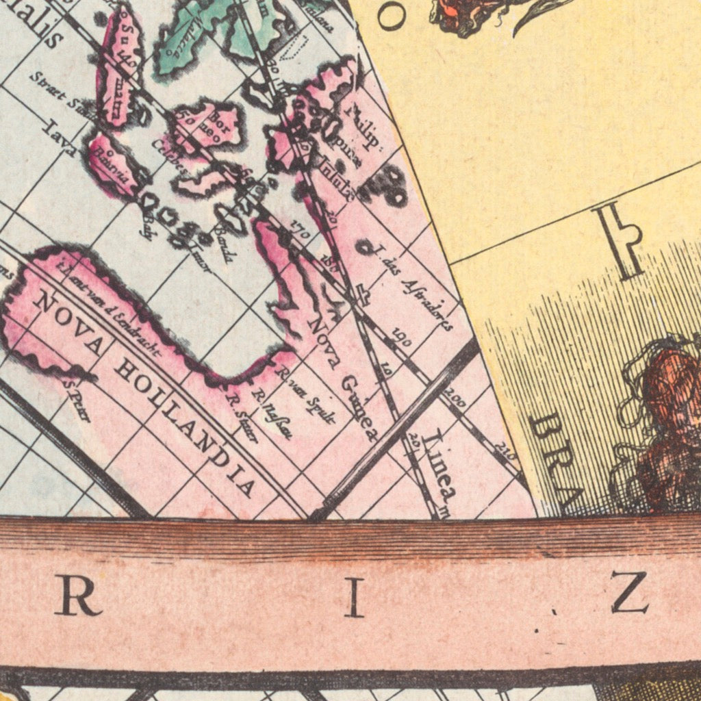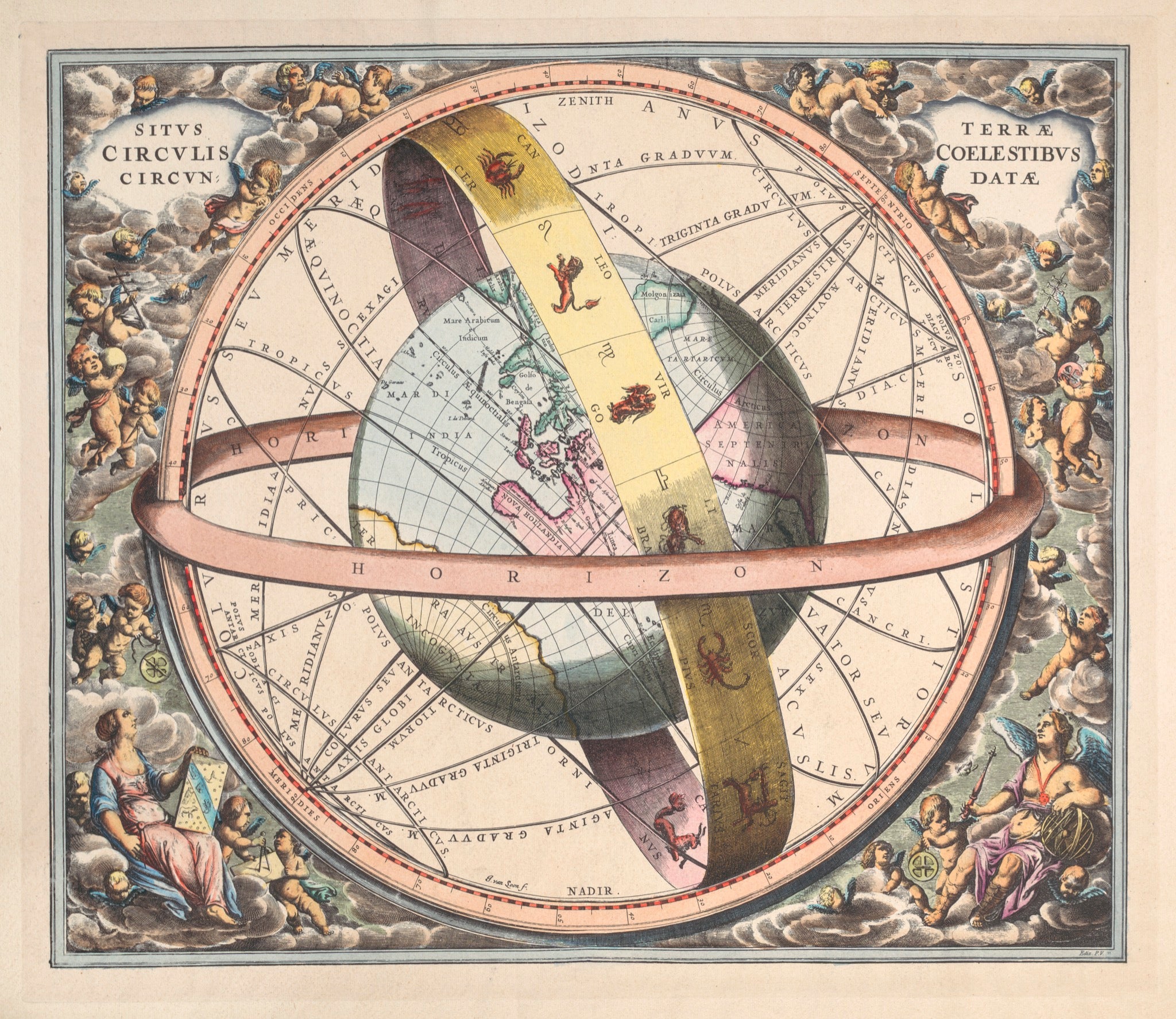 ‘Earth surrounded by the Heavens’, 1660, by Andreas Cellarius.(National Library of Australia)..Superb world map and star chart from the Celestial Atlas of Universal Harmony (Atlas coelestis; seu Harmonia Macrocosmica), considered by many to be the most beautiful celestial atlas ever published. The map shows the (pre-Copernican) Ptolemaic universe, with the earth fixed at the centre with the stars represented by a ribbon of zodiac rotating east to west. Winged figures are depicted carrying astronomical and cartographical instruments (yes, cartographers dwell with angels!)...The first traces of Australia (‘Nova Hollandia’) are shown with the northwest coast emerging from the East Indies and joined to New Guinea at Cape York. This was the extent of the known world - celestial and terrestrial in mid 17th Century. Indeed, European scientists knew more about the stars than the antipodes at this time...Original Title: ‘Situs terrae circulis coelestibus circundatae’, engraved by J. Van Loon.