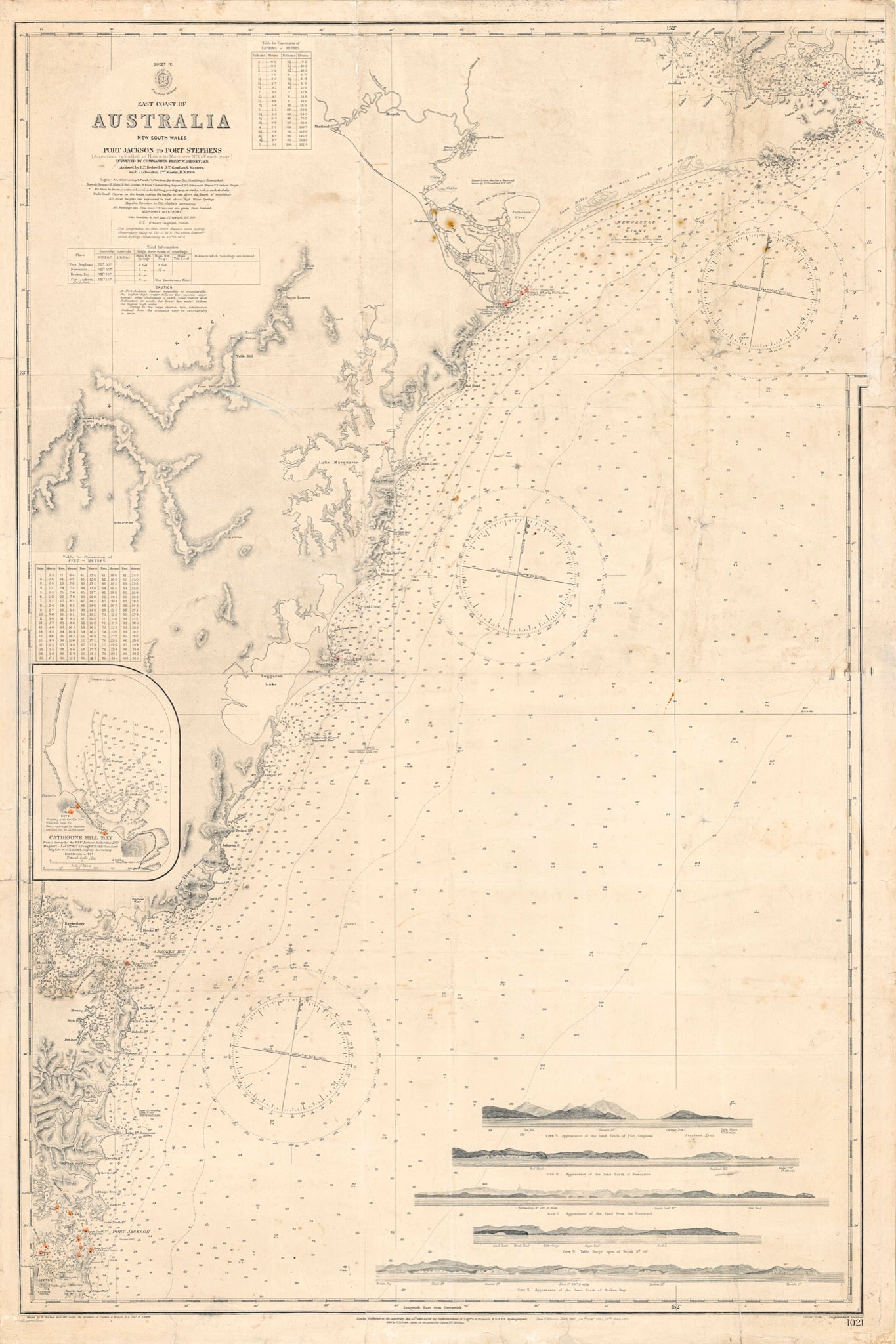 British Admiralty hydrographic chart, with updates from 1866-1921. Includes inset map of Catherine Hill Bay and five coastal profiles.