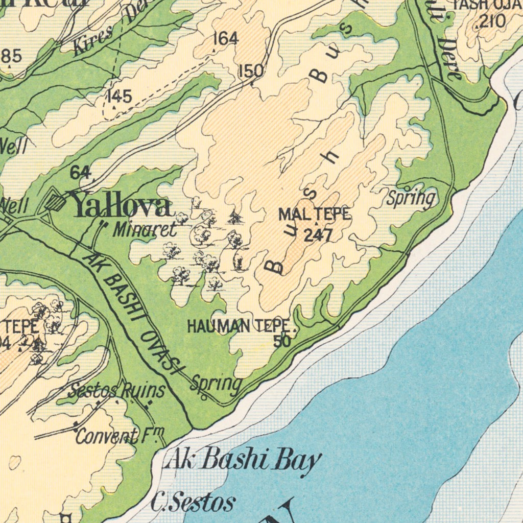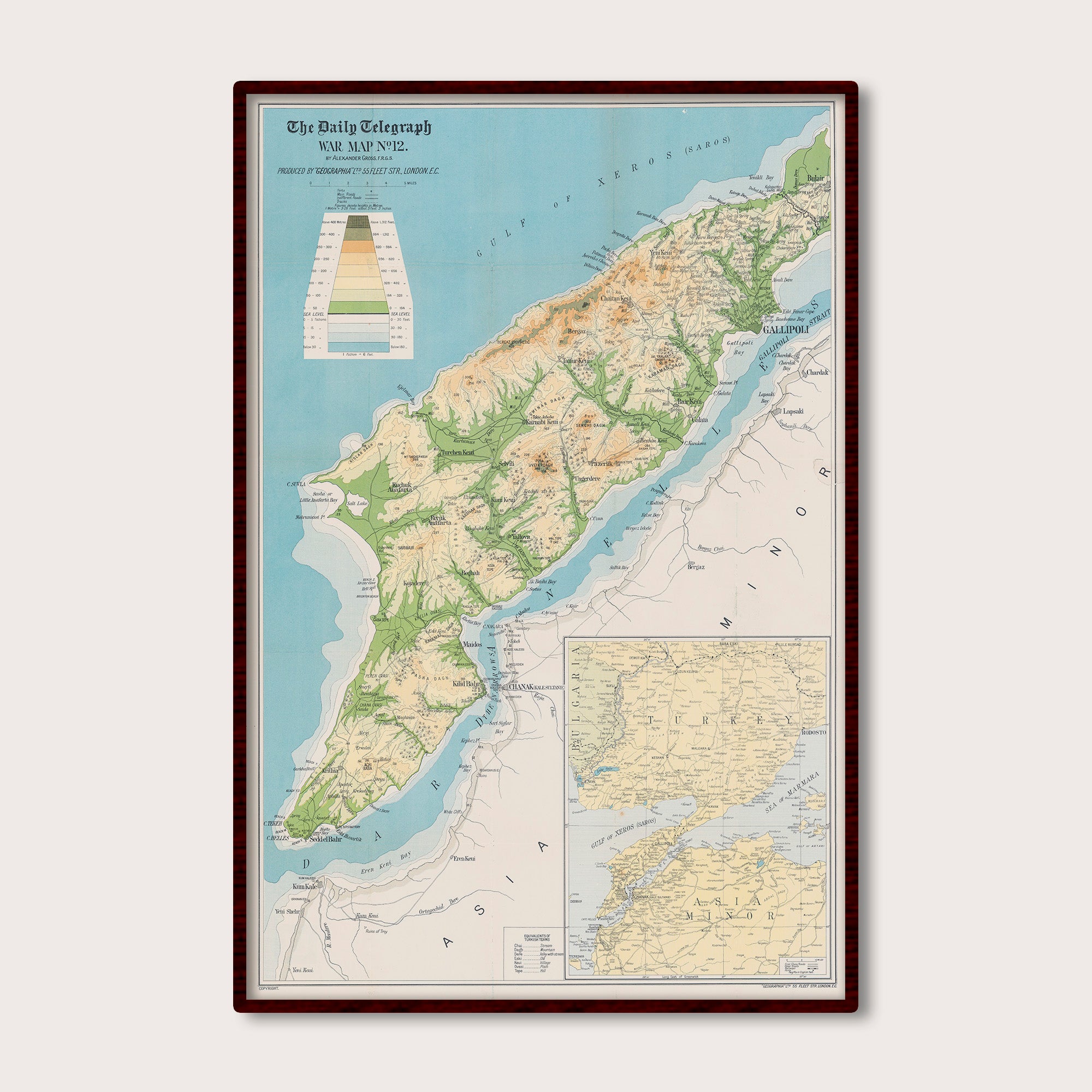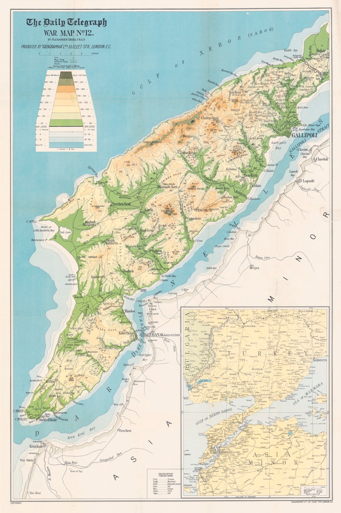 Map of Gallipoli Peninsula, Turkey, showing forts, roads and tracks. Elevations and spot heights shown. "...contains more information than any existing map of the same area".