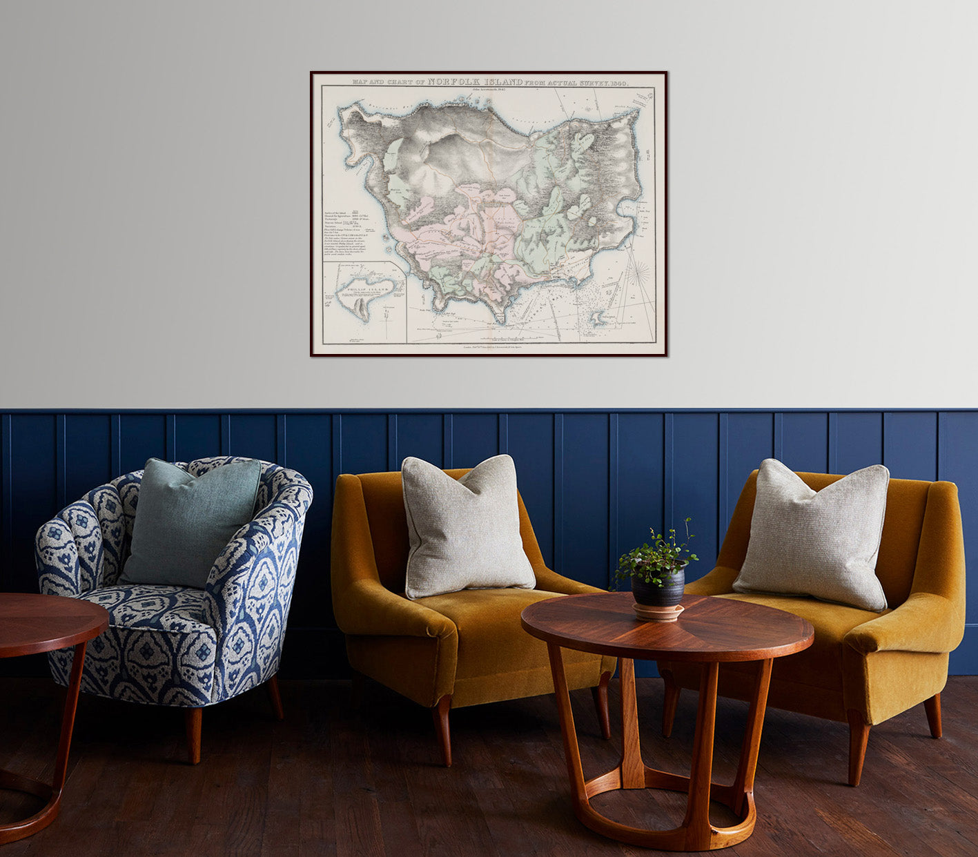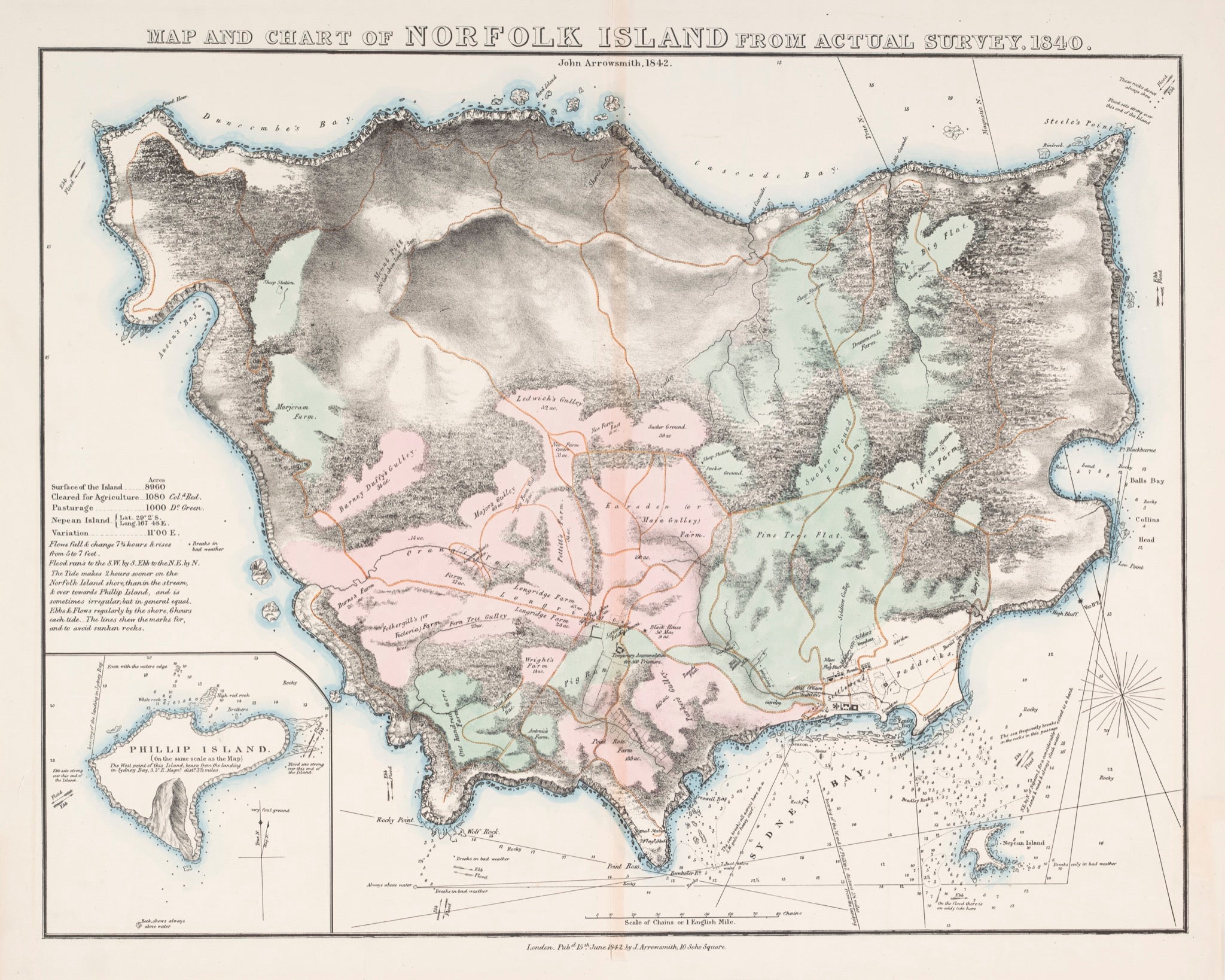 Map of Norfolk Island, from the time of the second penal settlement 1825–1855. The first (colonial) settlement 1788-1814 had proved to be unviable, was abandoned, and many of the settlers and convicts transferred Van Diemens Land. The map shows the great Norfolk Island pine forests, which once grew to the waters edge, cleared for farms. The rugged character of the coast and the lack of good anchorage is evident. Phillip Island, the last refuge of the wild Norfolk Island Kakas, is shown inset.