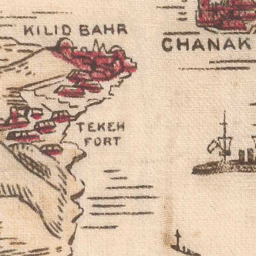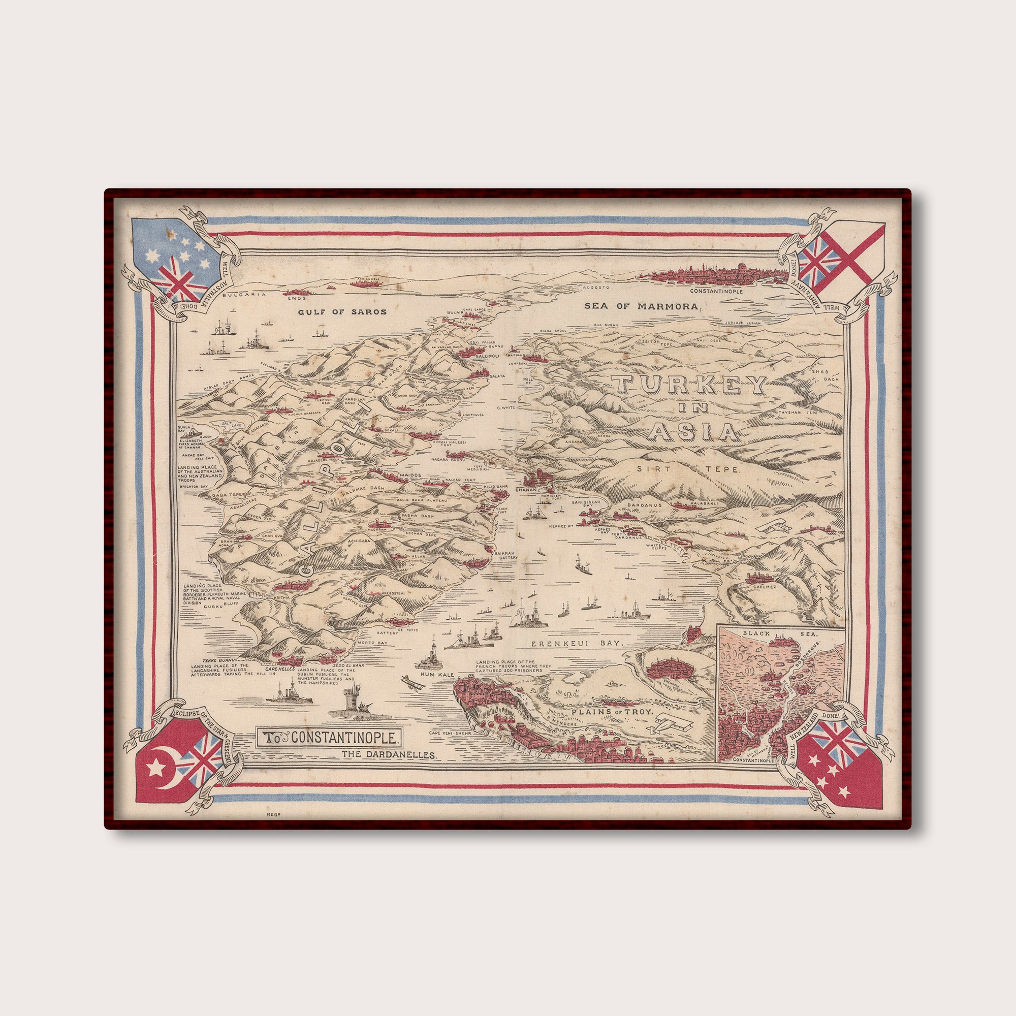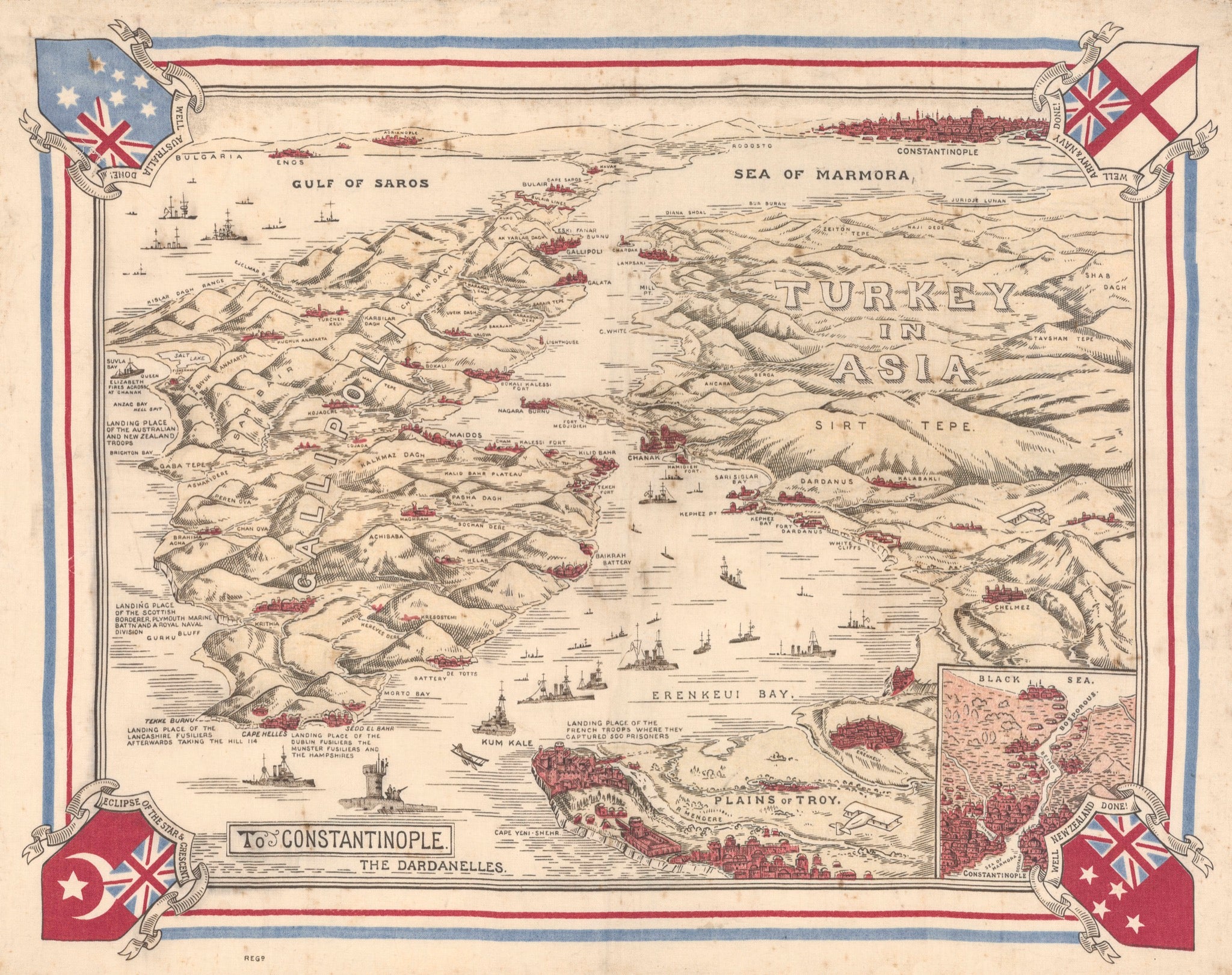 Pictorial World War One map showing significant towns and mountains, landing places of different Allied units on the Gallipoli Peninsula and Plains of Troy, and battle ships in the Dardanelles Strait and the Gulf of Saros, with Constantinople beyond. Includes shields at four corners of map (from top left corner) - the Australian flag with the words "Australia well done!", the British white ensign with "Army and navy well done!", the New Zealand flag with "New Zealand well done!", and the Union Jack over the Turkish flag with the words "Eclipse of the star and crescent".