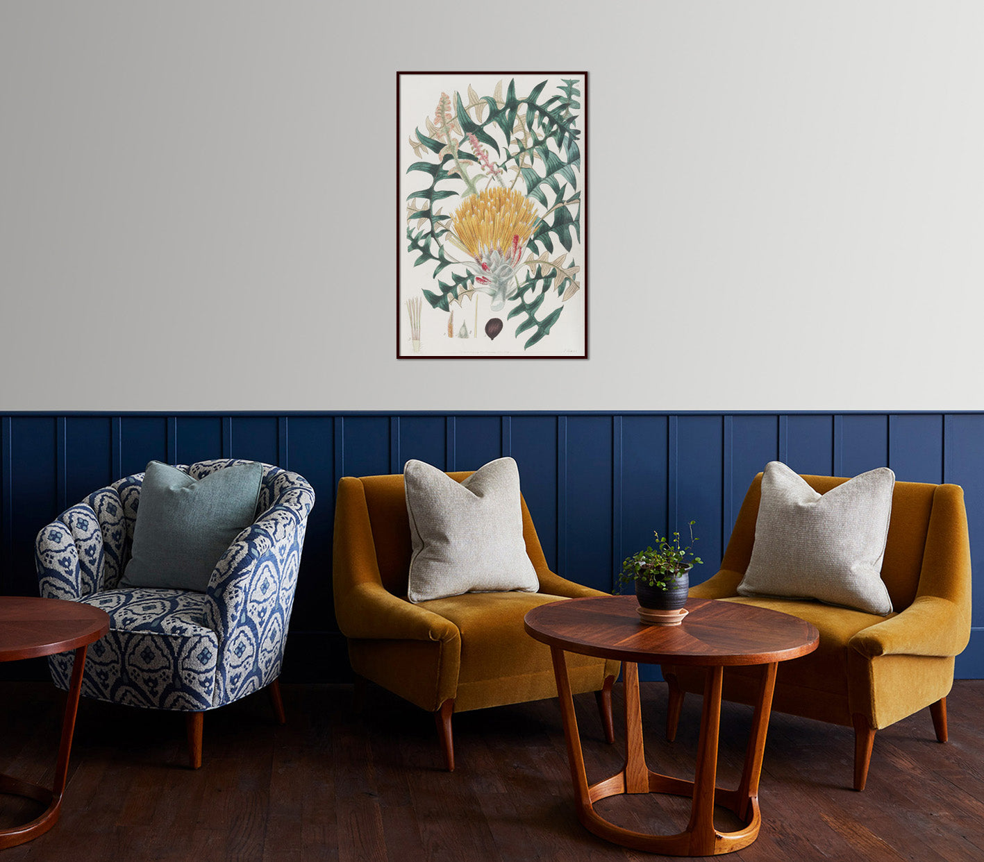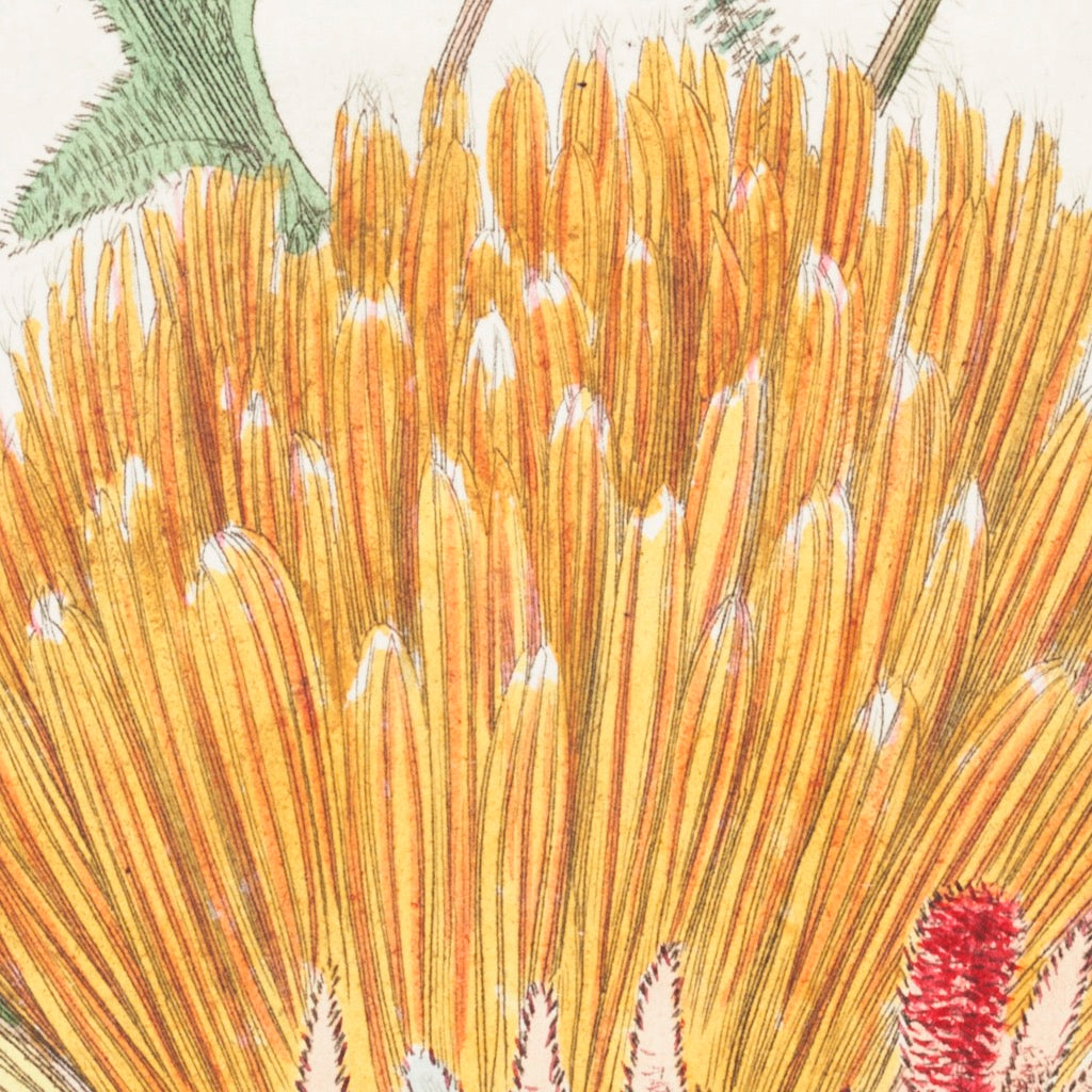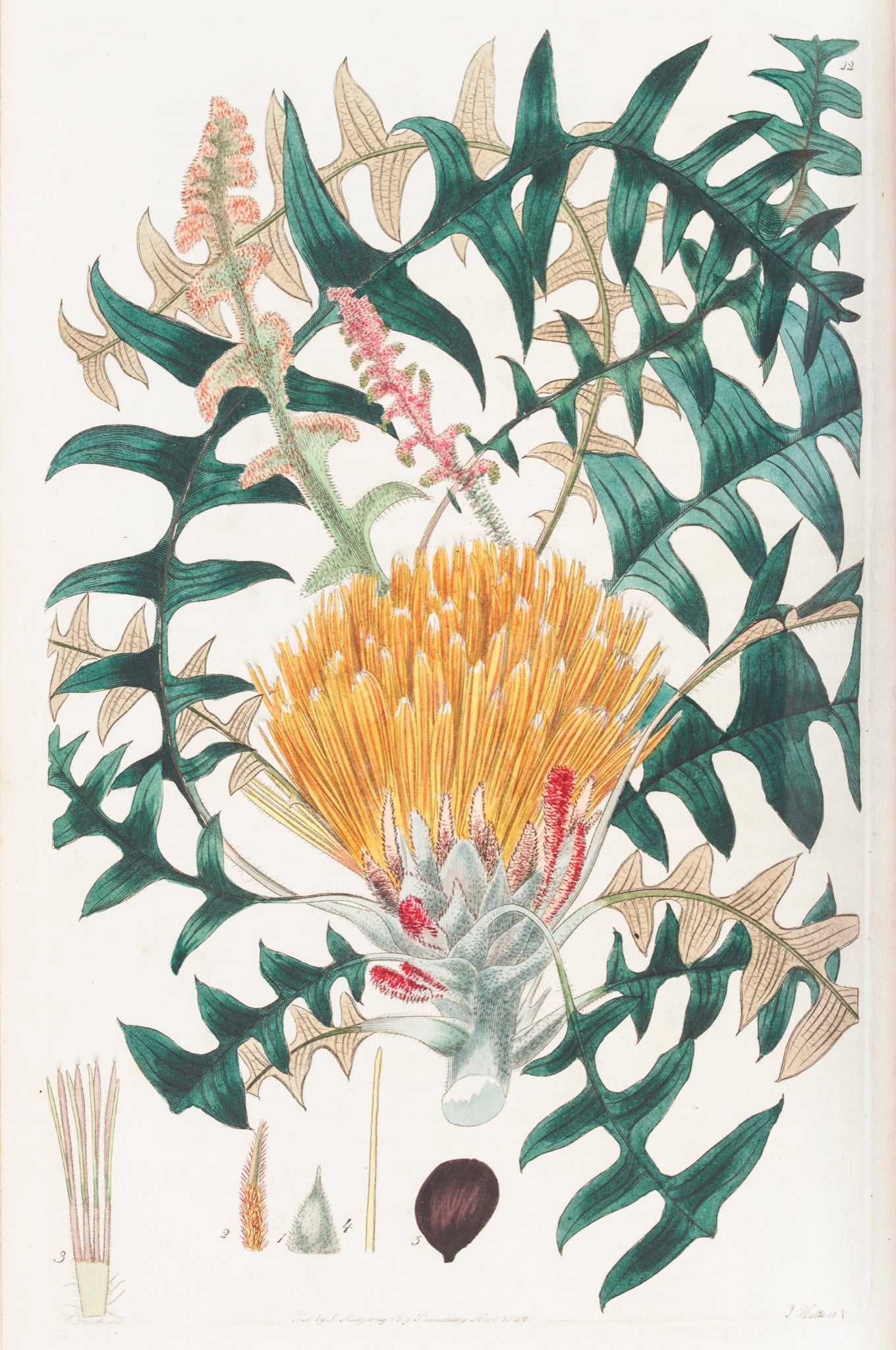 Native to southwestern Australia. Common names include The Tangled Honeypot. Scientific name: Banksia alliacea...Published in 'Flora Australasica, or a selection of handsome, or curious plants, natives of New Holland. ' (1827-1828) by Robert Sweet & James Ridgeway; the drawings by E.D. Smith.