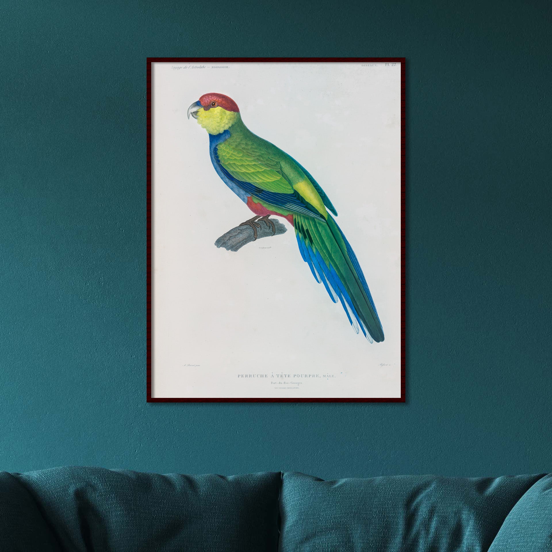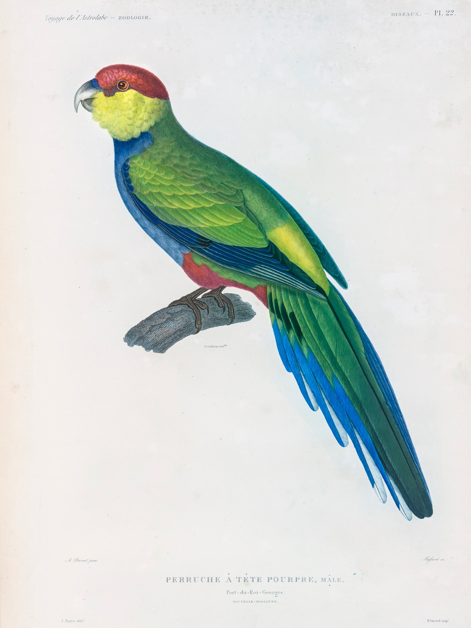Red-capped Parrot, native to southwest Australia, recorded at King Georges Sound, WA, in Dumont D'Urville's Voyage of the Astrolabe 1826-1829. .Comte Jules Dumont d’Urville sailed to Sydney, Hobart and large parts of the Australian coast as part of a lavish expedition of scientific discovery in the Australia-Pacific region, including New Zealand and the East Indies. The scientific illustrations are extraordinarily fine. The account of the Voyage of the Astrolabe was published in 1835. The principal artist was Louis Auguste de Sainson (1800-1887)...(‘Voyage de la corvette l’Astrolabe exécuté par ordre du roi: pendant les années 1826-1827-1828-1829’)