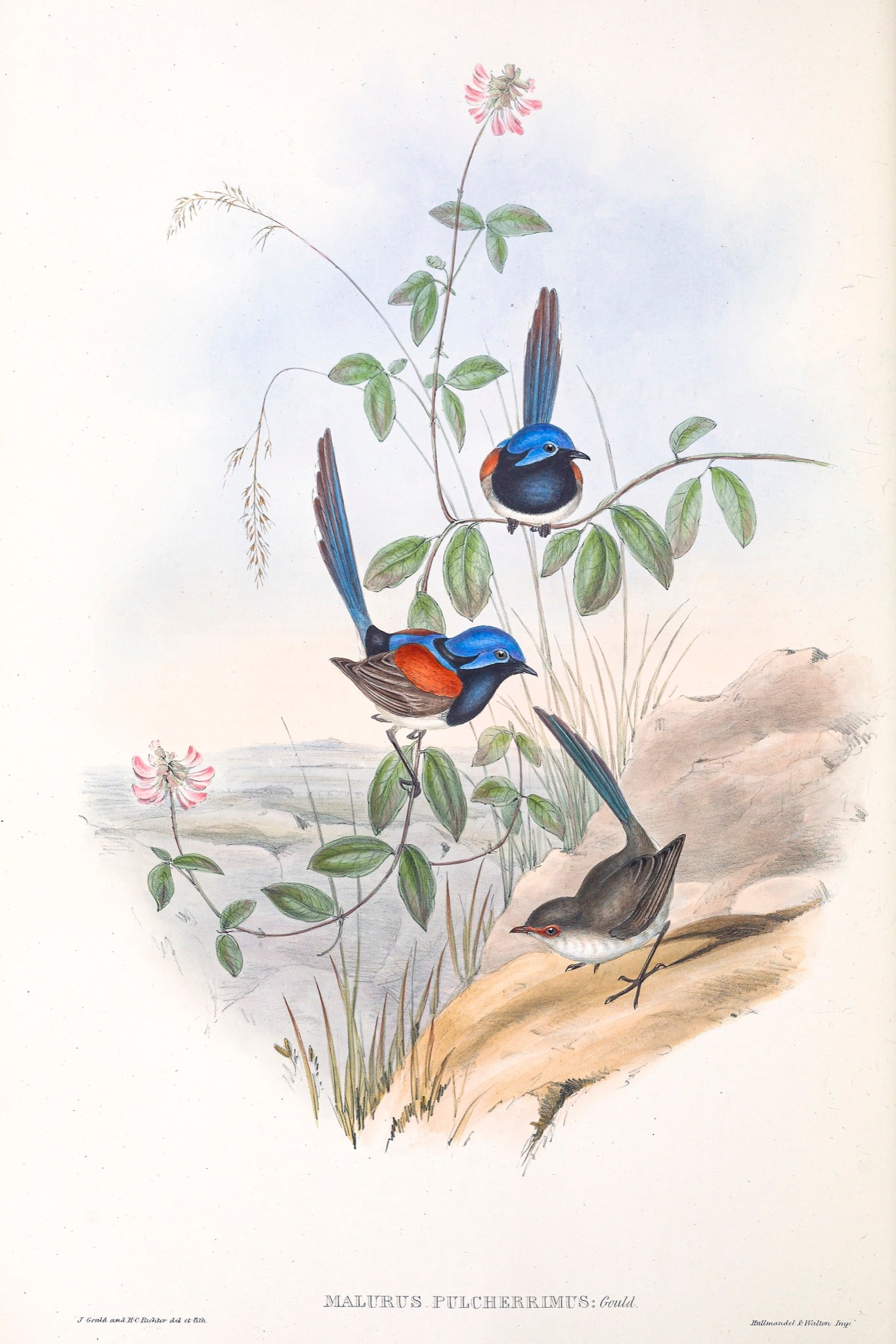 John Gould’s lavish publication, Birds of Australia, was the most ambitious and finest ever published of Australian birds, included a staggering 681 large folio sized plates, 328 of which were species new to science. The illustration work by Gould’s wife Elizabeth and H.C Richter are magnificent and charming works of art as well as highly accurate ornithological studies.