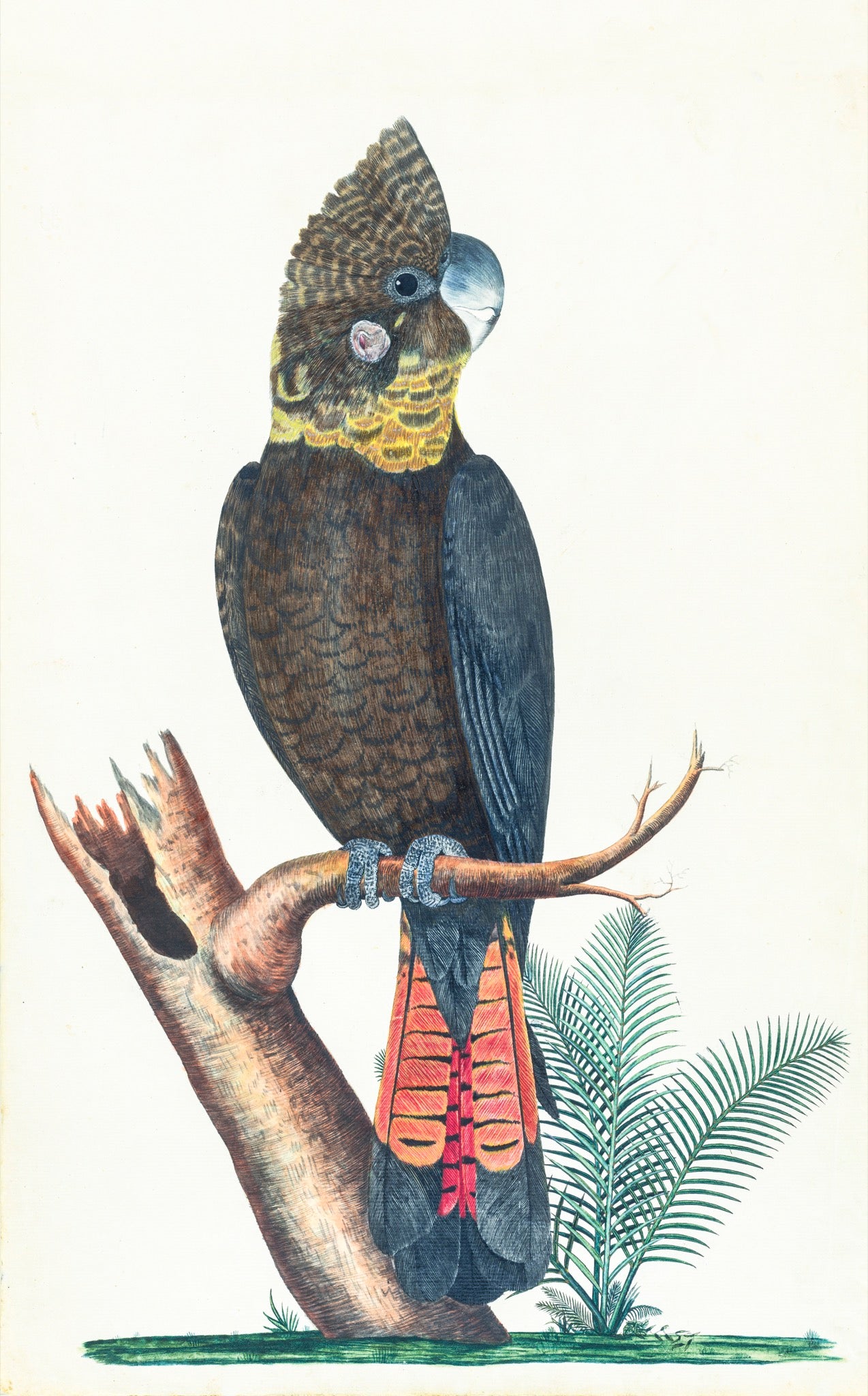 A superb colonial First Fleet era picture of a Red tailed cockatoo (Calyptorhynchus lathami)..The artist George Raper (1769-1796) was a Royal Navy officer on the HMS Sirius, serving under Captain John Hunter in the First Fleet. The young sailor produced a collection of fine water colours of birds, flowers, landscapes and maps. This charming red-tailed cockatoo is part of the collection of 'Papers of George Raper' held by the National Library of Australia and is counted amongst our national treasures.