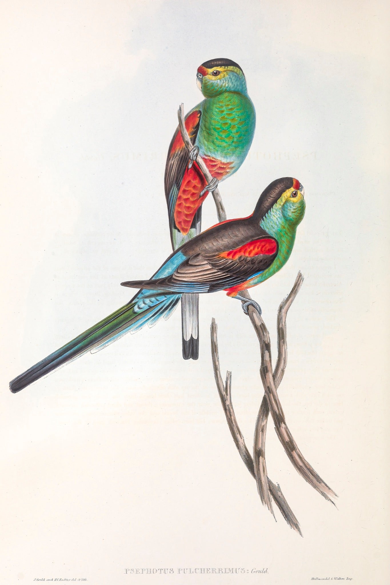 Extinct since 1927, was endemic to eastern Australia...John Gould’s lavish publication, Birds of Australia, was the most ambitious and finest ever published of Australian birds, included a staggering 681 large folio sized plates, 328 of which were species new to science. The illustration work by Gould’s wife Elizabeth and H.C Richter are magnificent and charming works of art as well as highly accurate ornithological studies.