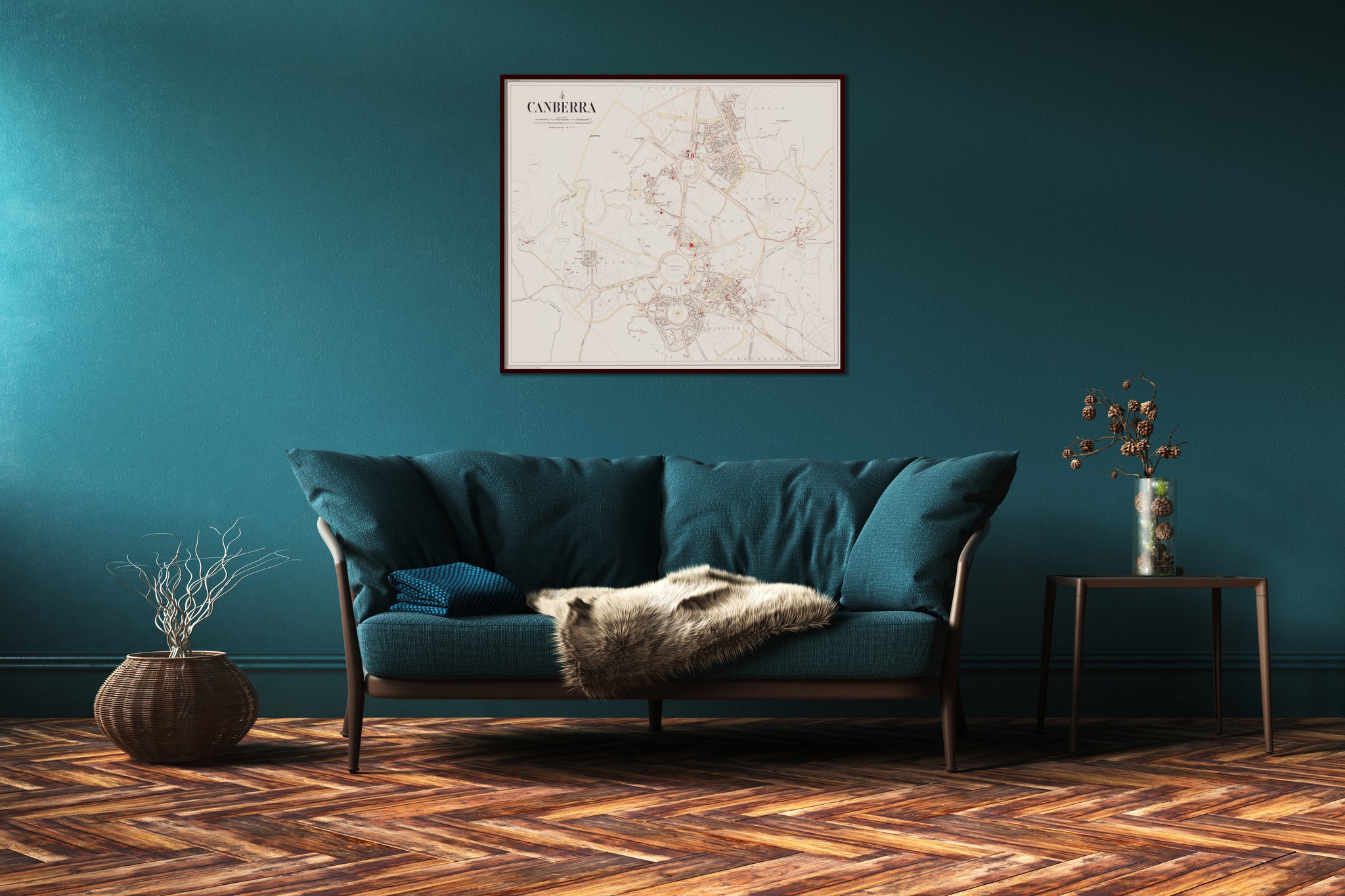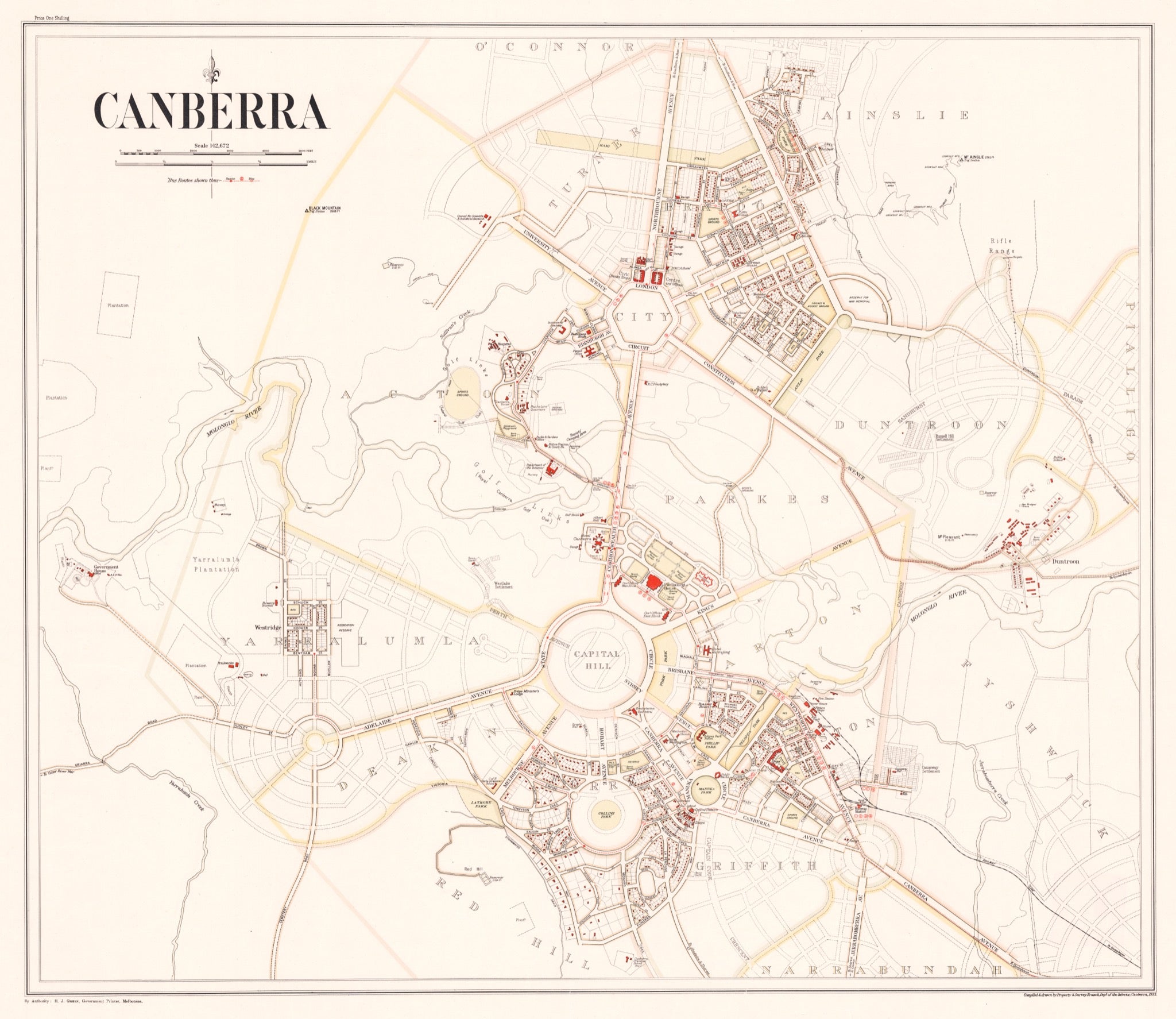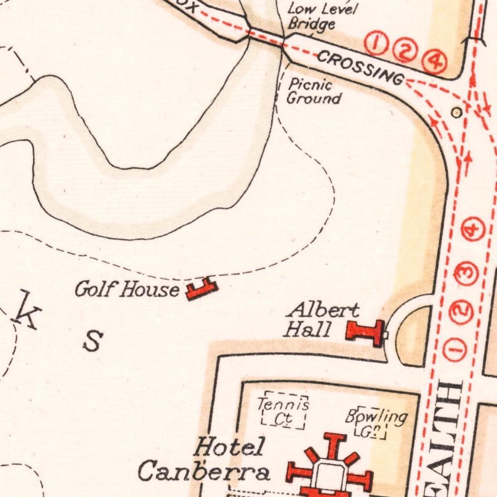 An informative map of early Canberra, 1933, showing the initial buildings of the fledgling national capital filling out the Griffin Plan. The first shops, schools, hotels, churches, parks and public buildings are shown; and the early bus routes.