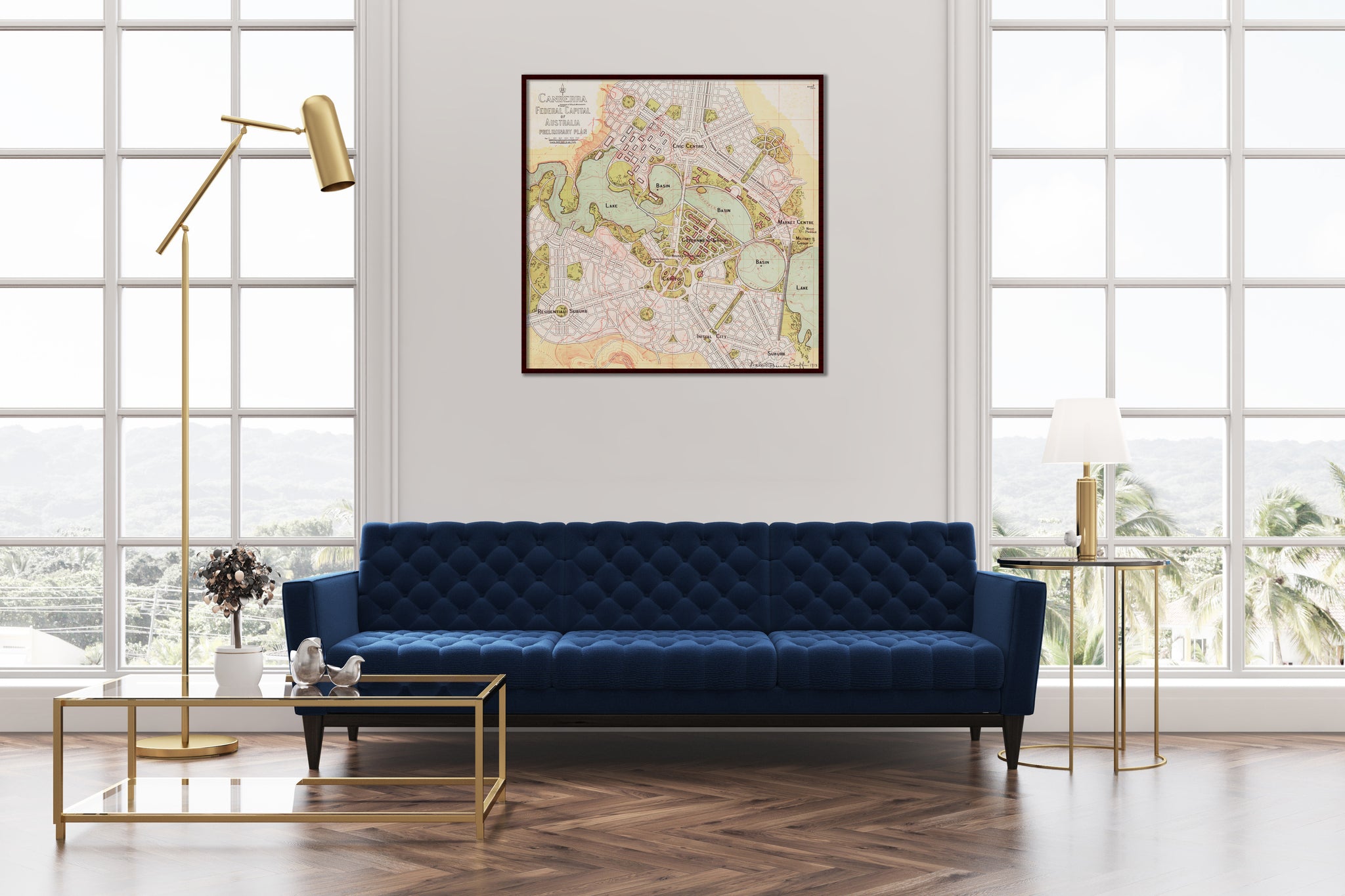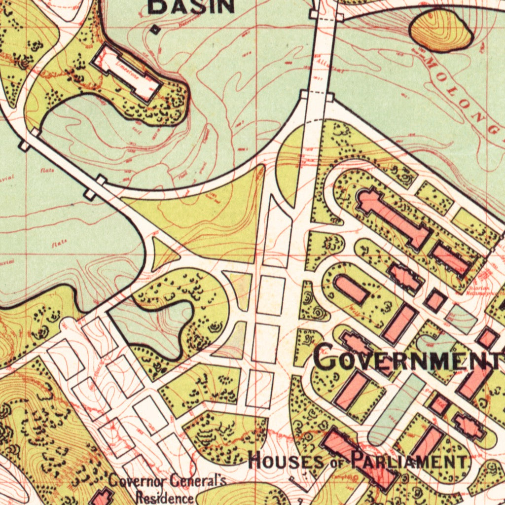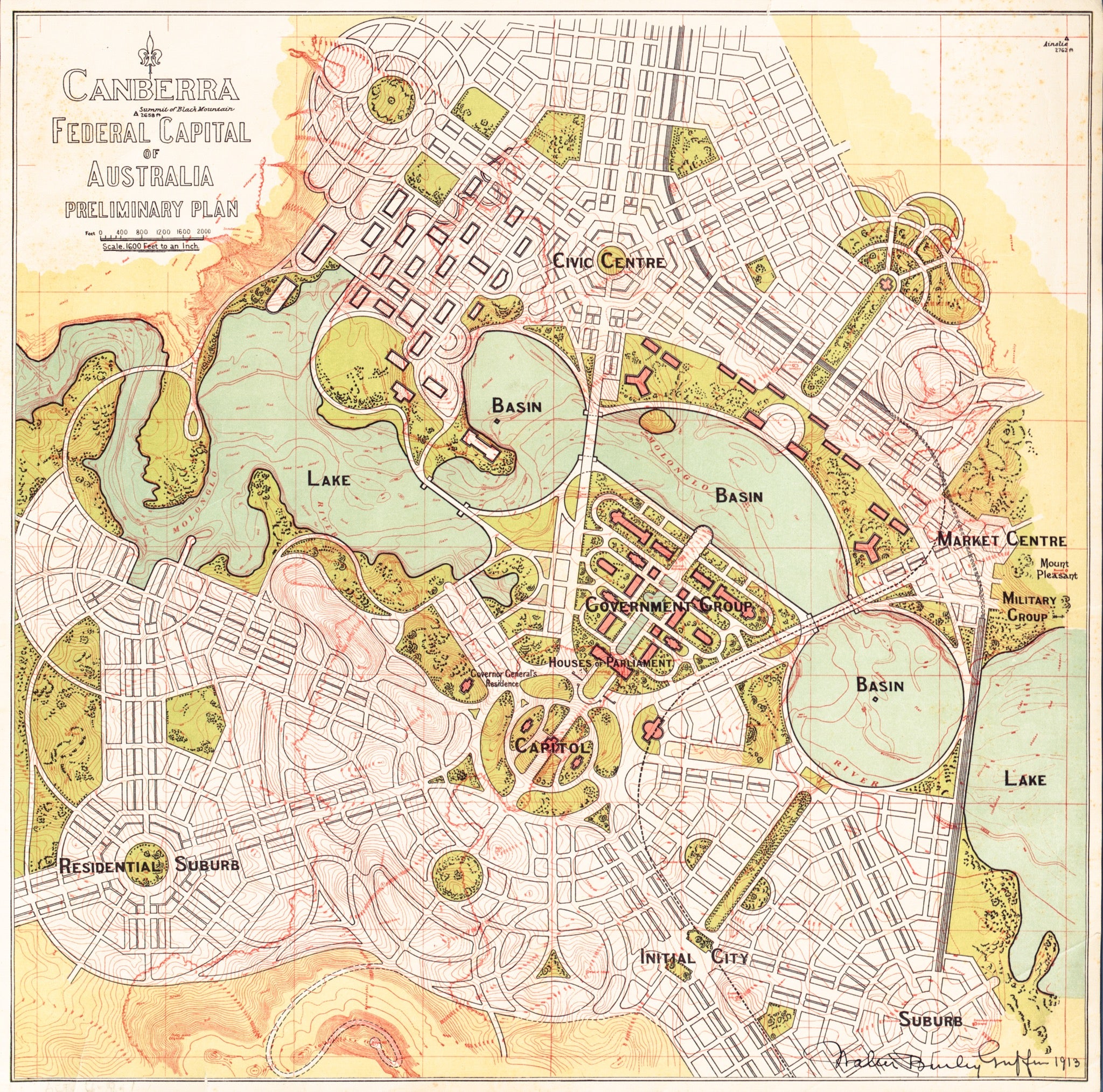 Griffin's 1913 Preliminary Plan was prepared a year after he and partner Marion Mahony Griffin won the international competition for the design of Australia's federal capital at Canberra. The previous version, the competition winning plan of 1912, was prepared site-unseen in a studio in snowy Chicago, whereas this 1913 plan followed Walter's first visit, the product of weeks of long walks around the site, and discussions with local officials. It's an easy to read plan which gives a clear picture of the Griffins' vision for the national capital before a century of changes ensued.