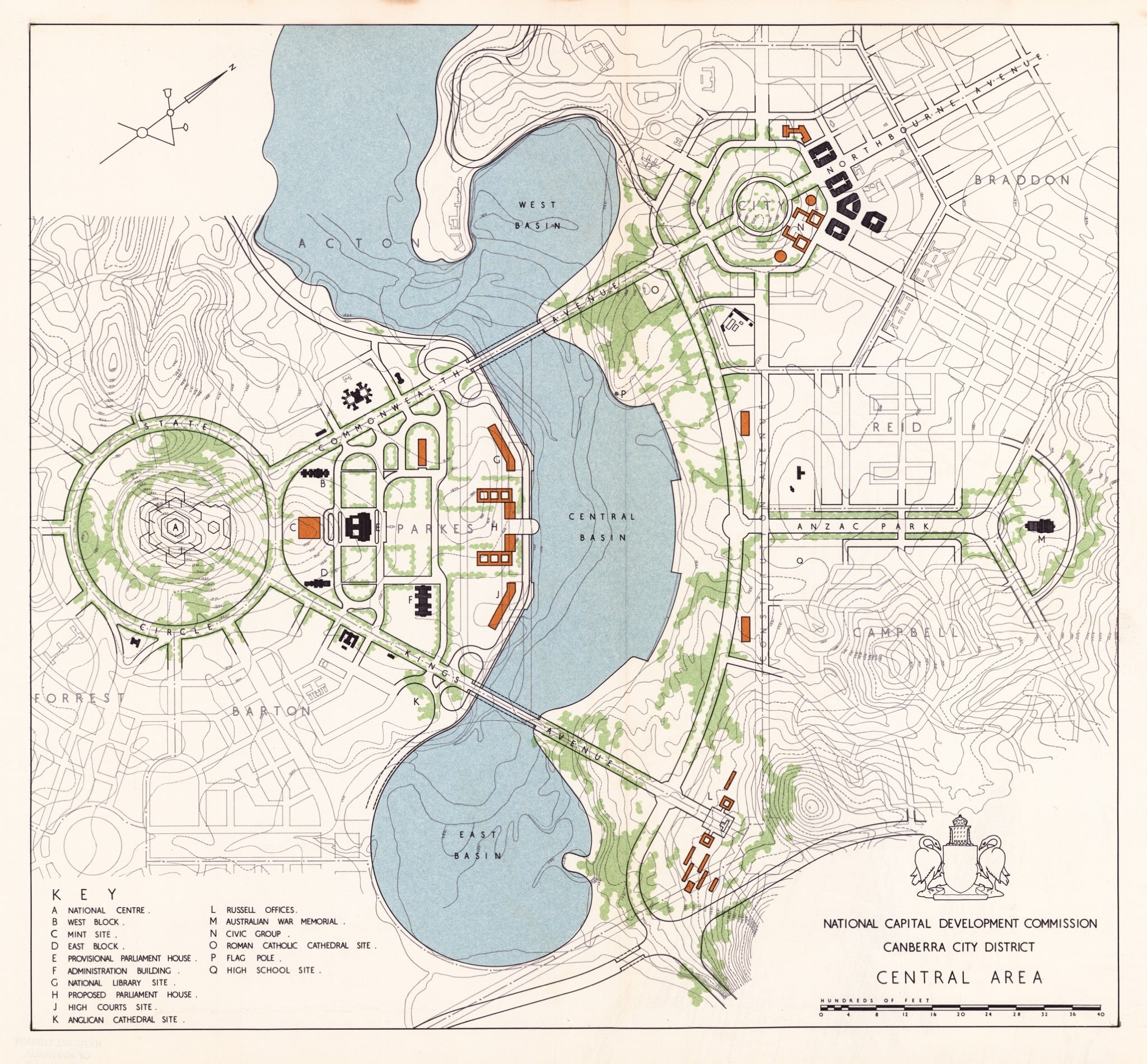 The NCDC's first major plan for the central areas of Canberra, was based on major revisions to the 1918 Griffin Plan (gazetted 1925), including a lakefront Parliament House and a car-based inner-city freeway system (which prevails today), in place of Griffin's tramways and railway network.