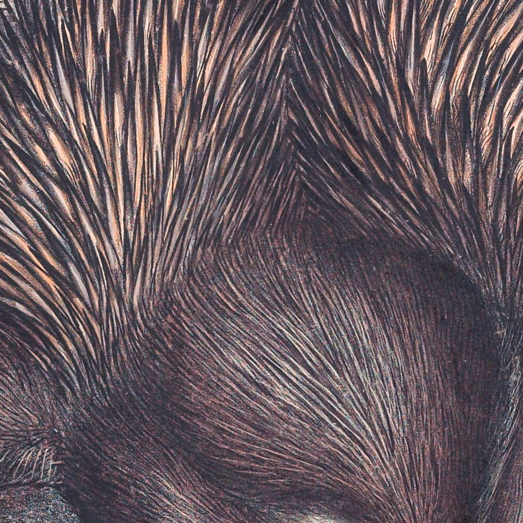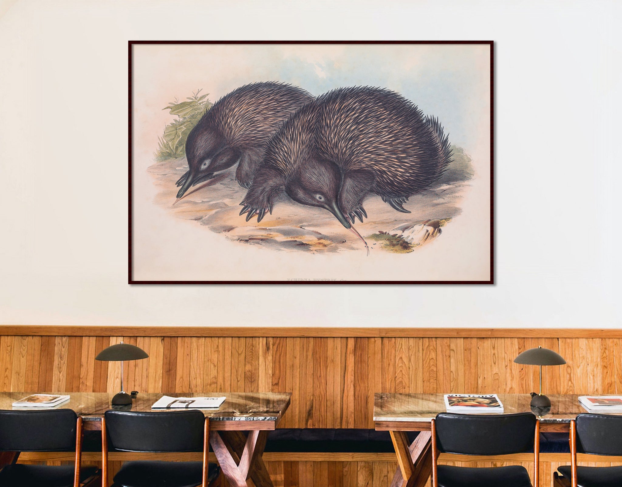 The Echidna, or Short-beaked echidna (Tachyglossus aculeatus), the most widespread native animal in Austrlia, is an egg-laying mammal or monotreme.It eats ants and other insects with a darting tounge, and has no fighting ability other than to curl up into a defensive ball of spines..(syn Echidna hystrix: Gould)
