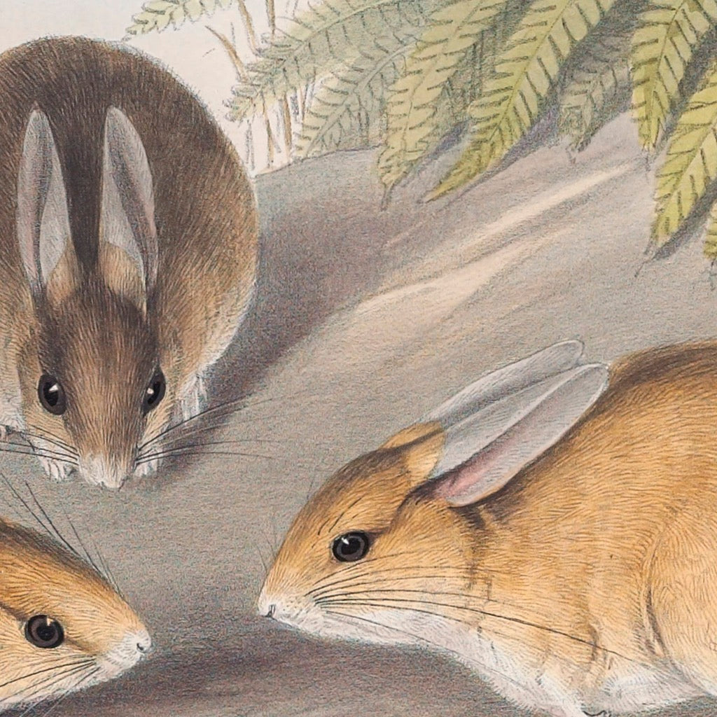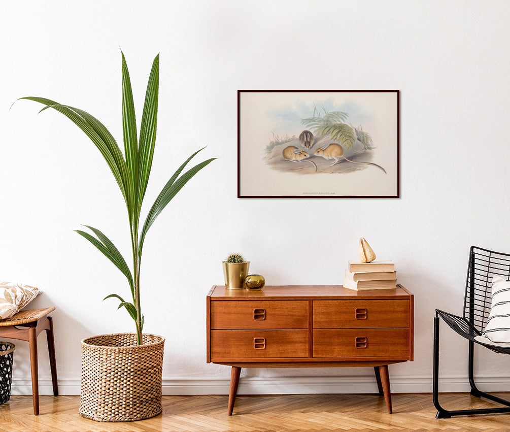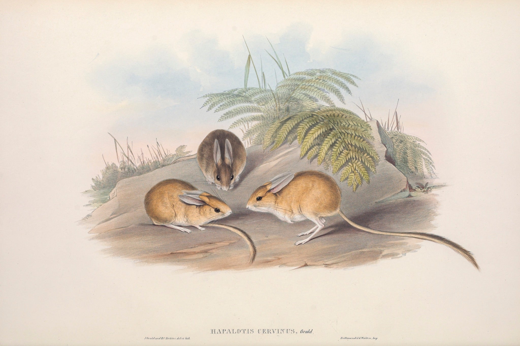 Fawn Hopping Mouse (Notomys cervinus) is native to the central Australian desert. Classified as a vulnerable species..Gould was charmed by the 'Fawn-coloured Hapalotis, Hapalotis cervinus', conceding 'that the present animal is the most graceful and elegant of the Jerboa-like Hapalotis' family, then he quotes explorer Sturt's encounter: 'This beautiful little animal burrows in the ground like a mouse, but their habitations have several passages leading straight, like radii of a circle, to a common centre, to which a shaft is sunk from above, so that there is a complete circulation of air along the whole. We fed our little captives on oats, on which they thrived and became exceedingly tame.'