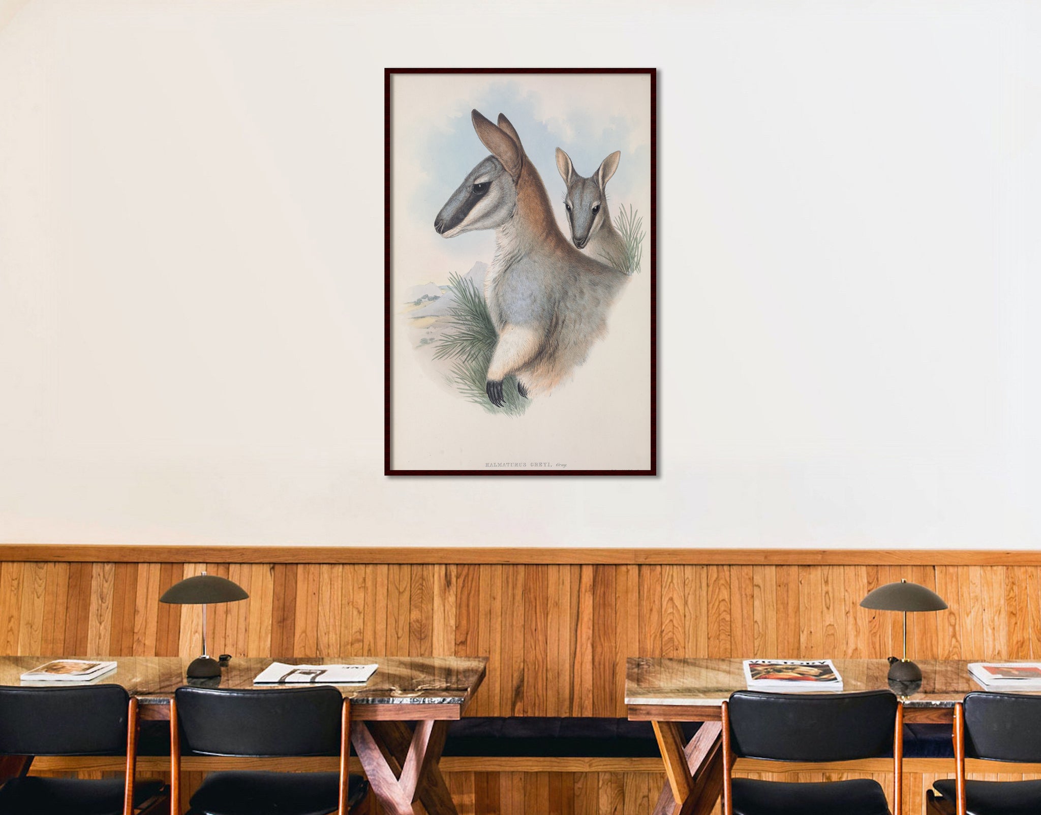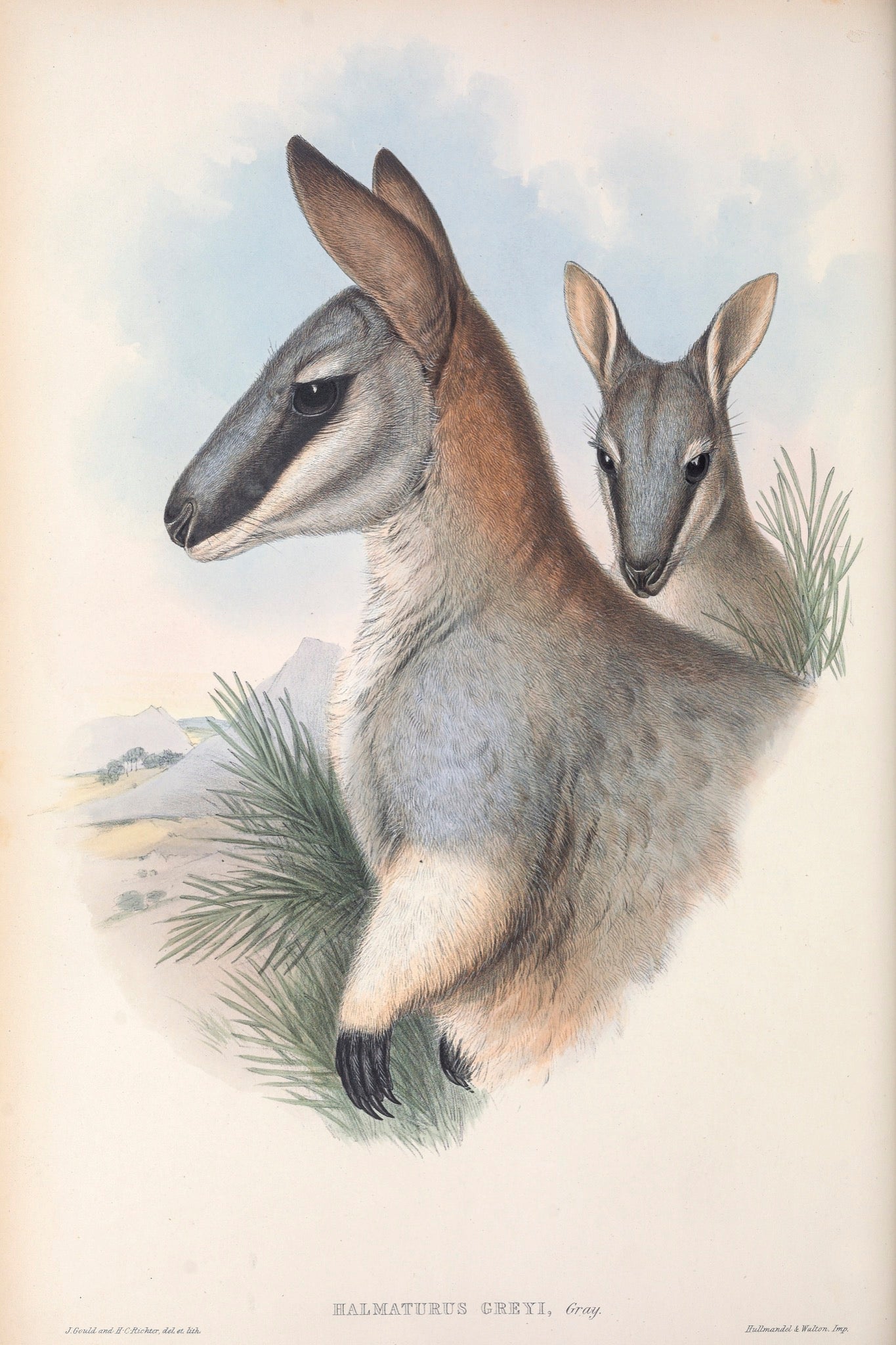 Grey's wallaby or Toolache wallaby (Macropus greyi) is an EXTINCT species of wallaby from southeastern South Australia and southwestern Victoria. A combination of numerous threats caused the decline and eventual extinction of the toolache wallaby. One of the largest factors was the destruction of its habitat. Since swamps were an important part of its habitat, once they were cleared out, much of the vegetation went with it. The introduction of predators such as the European Fox began to kill off the species as well. On top of all this, the animal was also hunted for sport and for its beautiful pelt...Gould found this wallaby, which he called Halmaturus Greyi, 'to be one of the most fleet and agile of its race', inhabiting the seashore, the scrub around lagoons and the sand dunes: 'I never saw anything so swift of foot as is this species: it does not appaear to hurry itself until the dogs have got pretty close, when it bounds away like an antelope, ... leaving the dogs far behind It. I have had twenty runs in a day with four swift dogs and not succeeded in getting one.'