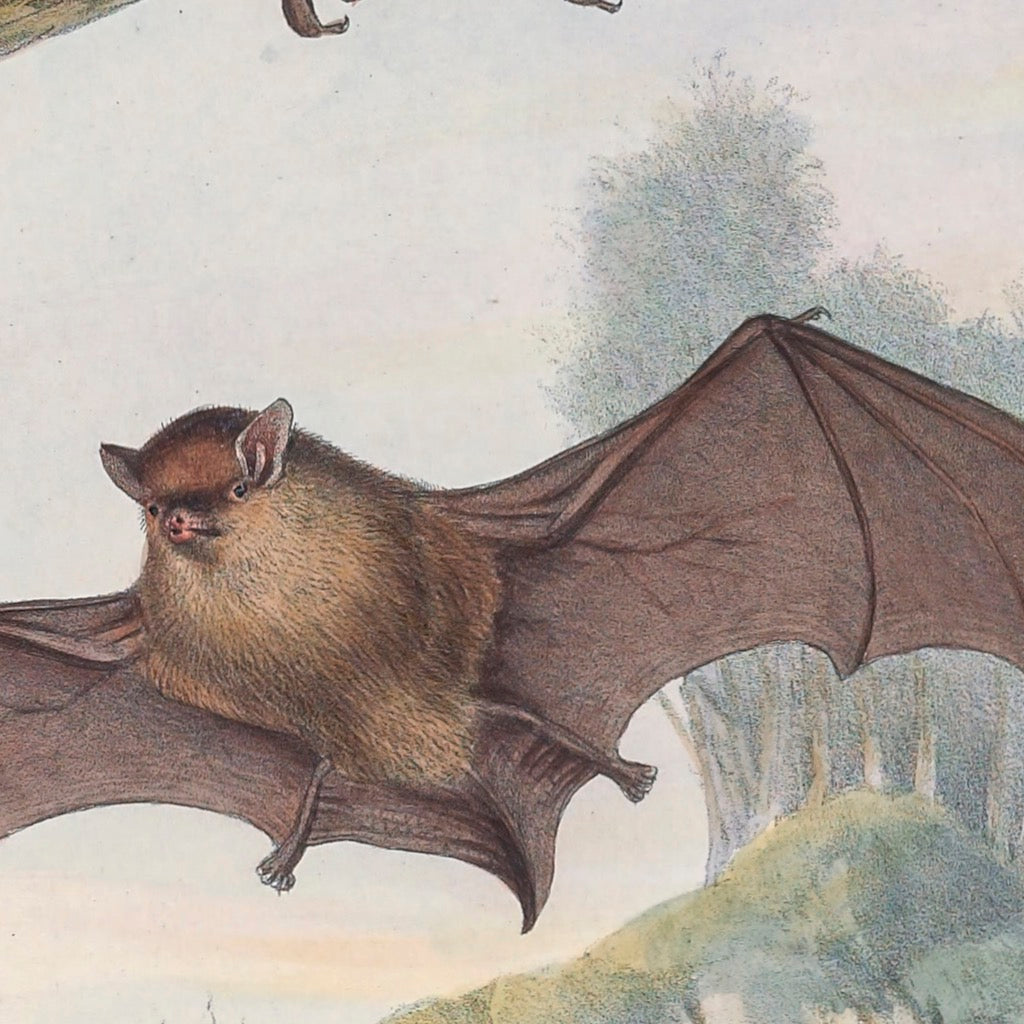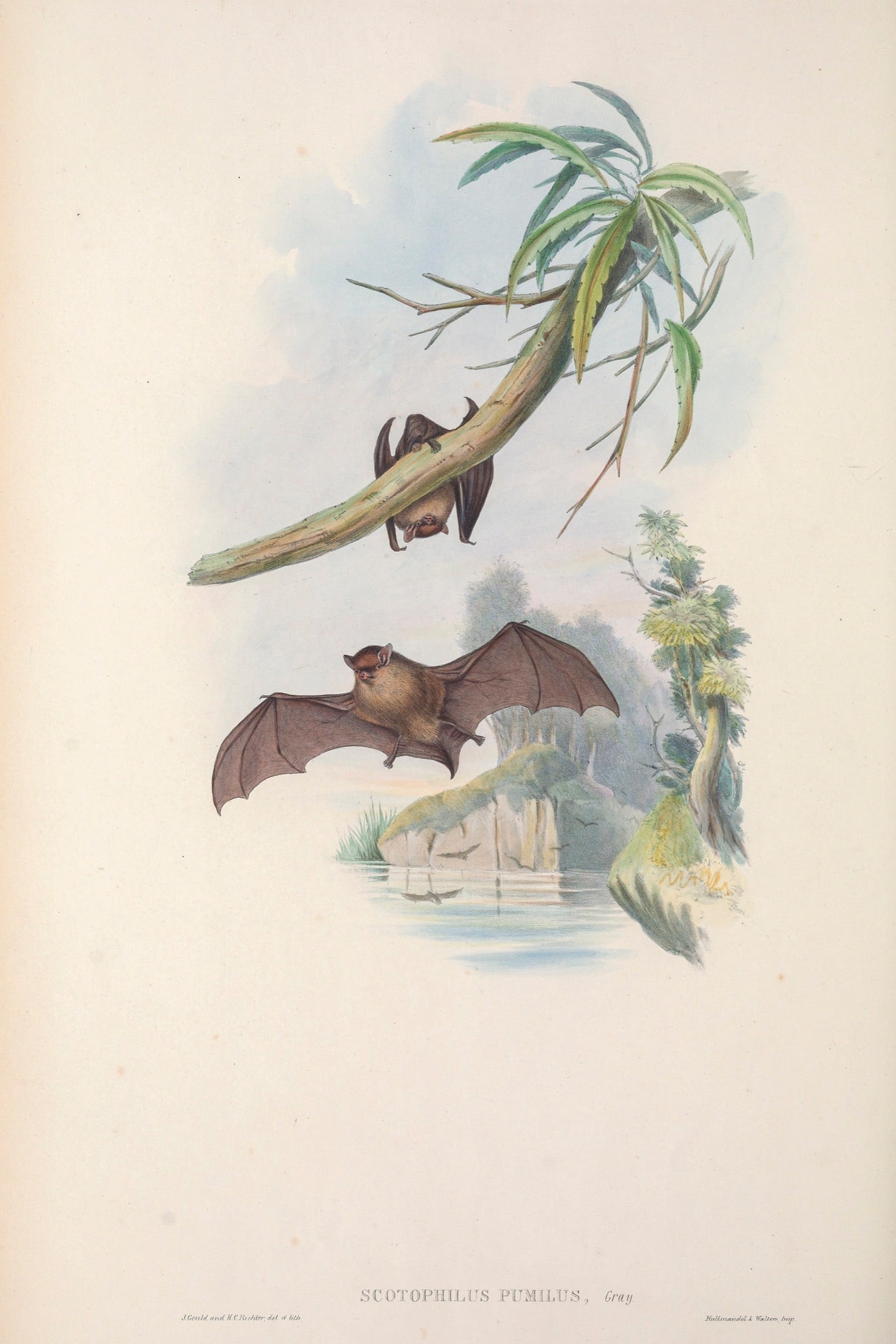 The Little bat 'Scotophilus pumulis' (Eastern Forest Bat, Vespadelus pumilus, endemic to eastern Australia in NSW and Qld). ..Gould wrote in Mammals of Australia: ..'Although the Vespertilionidae are fairly represented in Australia, the species inhabitating that country are not very numerous. The Bat here represented is certainly one he very least of the Australian members of the family, for it scarcely exceeds in size the European Pipistrelle. It was my usual practice to look around during the last half-hour of daylight for Bats, at which to discharge the contents of of my gun before retiring to my tent, and by this means several species were collected which might otherwise even now be unknown in Europe. It was not, however, always necessary to shoot this little animal, for it is very tame, and my black attendants often amused themselves by cutting it down with a switch [small branch] as it passed before them, or rapidly skimmed over the water, a frequent habit with it. I found it especially abundant on the upper part ot the River Hunter, particularly on the banks fo the rivulets descending from tht mountain ranges.'