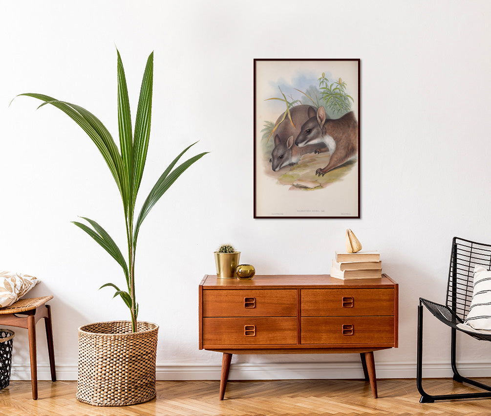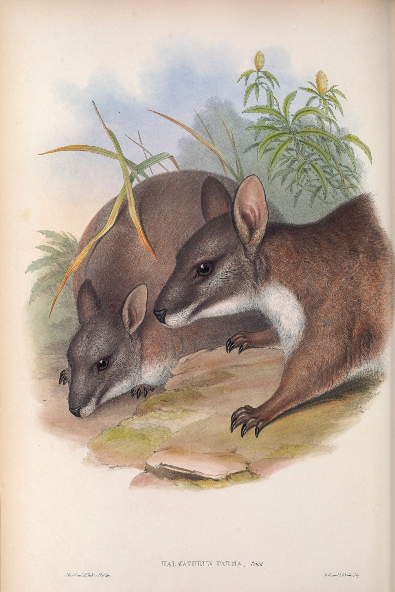 The Parma wallaby (Macropus parma) was first described by British naturalist John Gould in about 1840. A shy cryptic creature of the wet sclerophyll forests of northern New South Wales (Australia), it was never commonly encountered and, even before the end of the 19th century, it was believed to be extinct. (Gould syn: Parma Wallaby, Halmaturus parma)