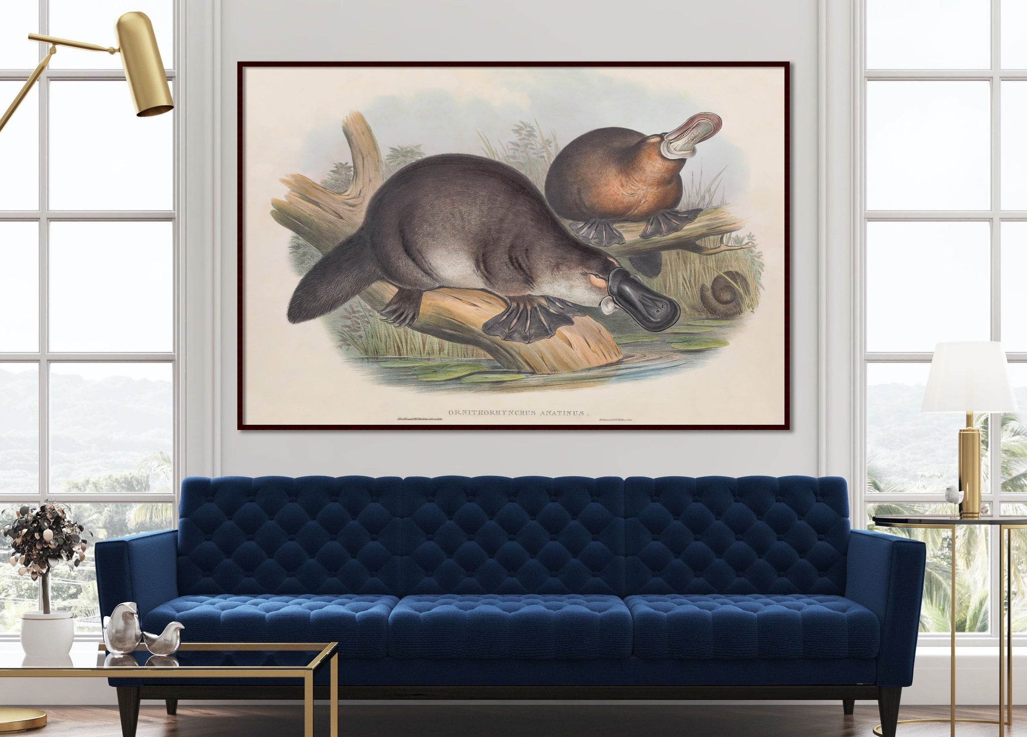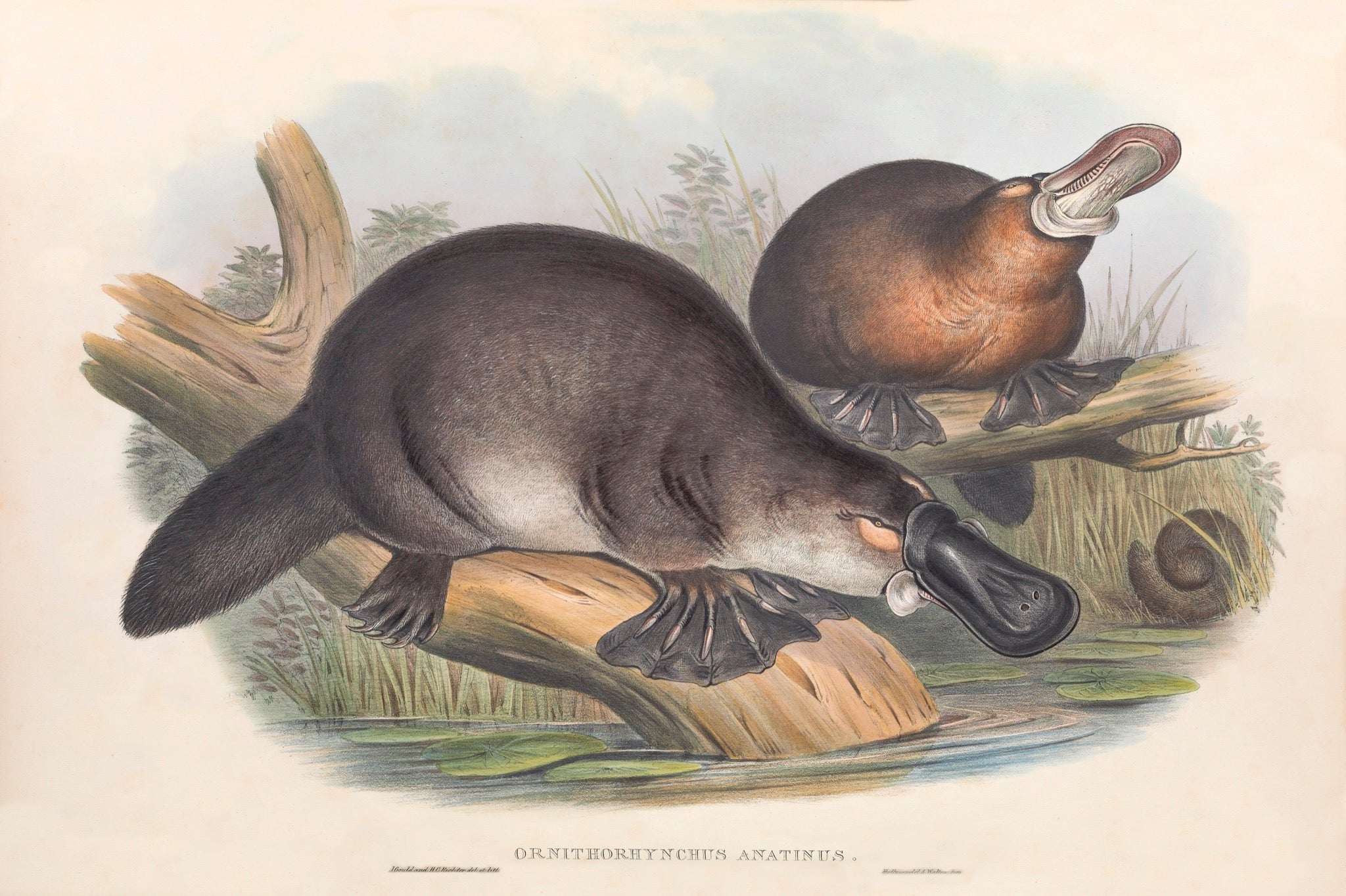 So enchanted by the Platypus (Ornithorhynchus anatinus) Gould made the remarkable monotreme Plate 1 of his Mammals of Australia, writing:. '...I frequently met with it both while ascending the rivers in Van Diemen’s Land and while encamped beside the quiet pools of New South Wales... it is common in the streams and rivers flowing from the mountain ranges to the sea, as well as in those descending towards the interior. It is equally numerous in all the tributaries which feed the great rivers Darling and Murray; and if it be not now plentiful in the Hawkesbury, Hunter, ... the diminution in its numbers is solely due to the wholesale destruction dealt out to it by the settlers, which, if not restrained, will ere long lead to the utter extirpation of this harmless and inoffensive animal, a circumstance which would be much to be regretted; it is in fact often killed from mere wantonness, or at most for no more useful purpose than to make slippers'