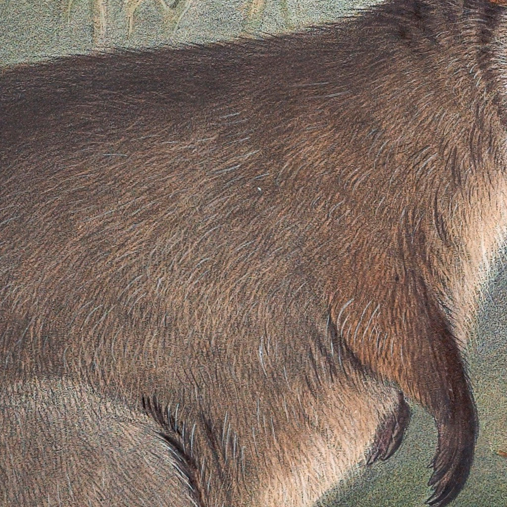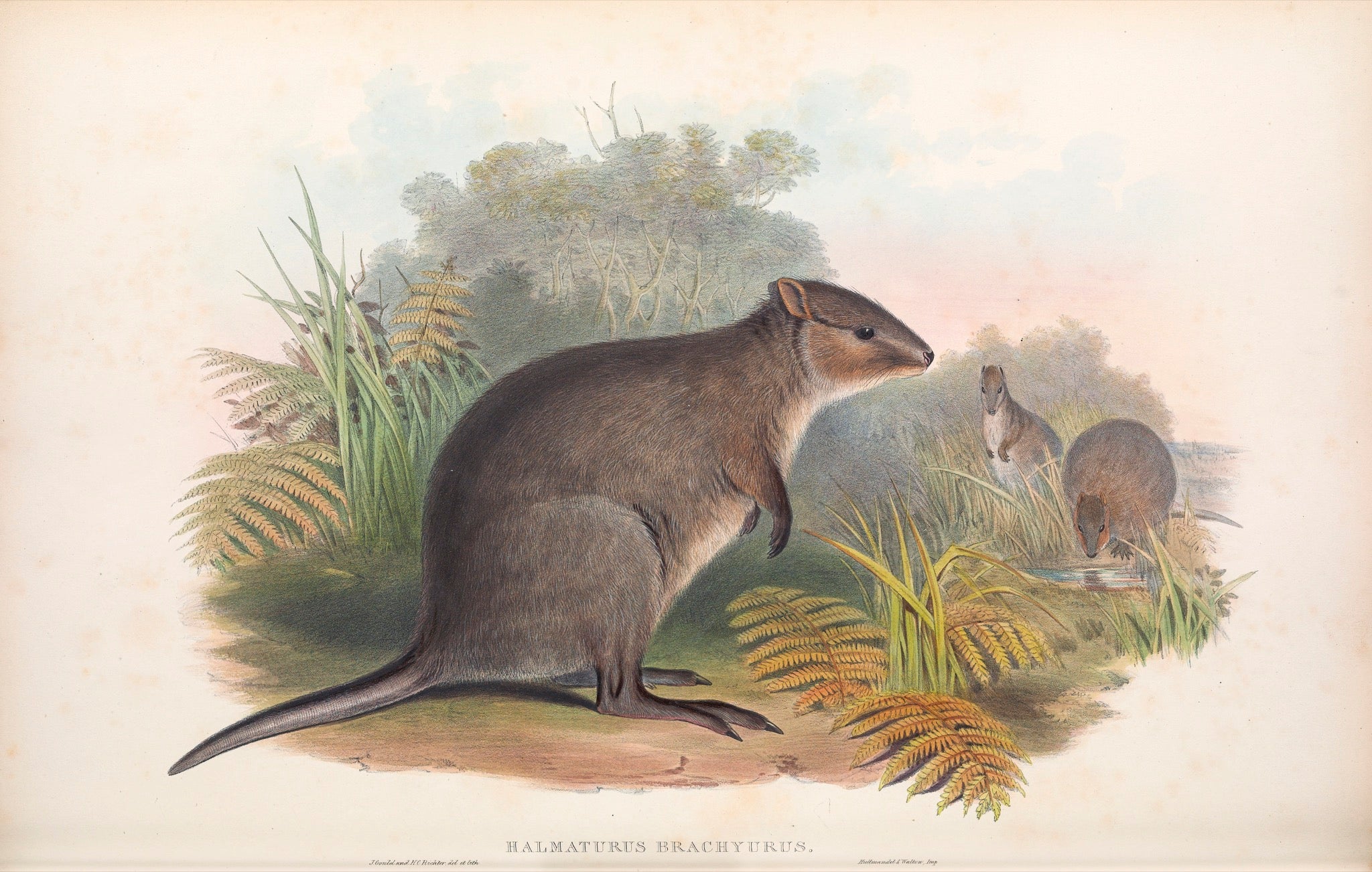 Quokka, or short-taled scrub wallaby, Setonix brachyurus, is a vulnerable threatened species, found in some isolated coastal areas and islands of south-western Australia. It is wll known at Rottnest Island, just off Perth, and at a small colony at Two Peoples Bay Nature Reserve, where they co-exist with the critically endangered Gilbert's potoroo.(Gould syn: Short-tailed wallaby Quokka, Halmaturus brachyurus).