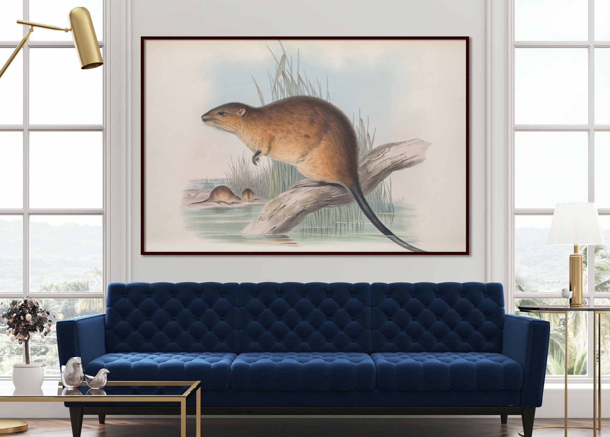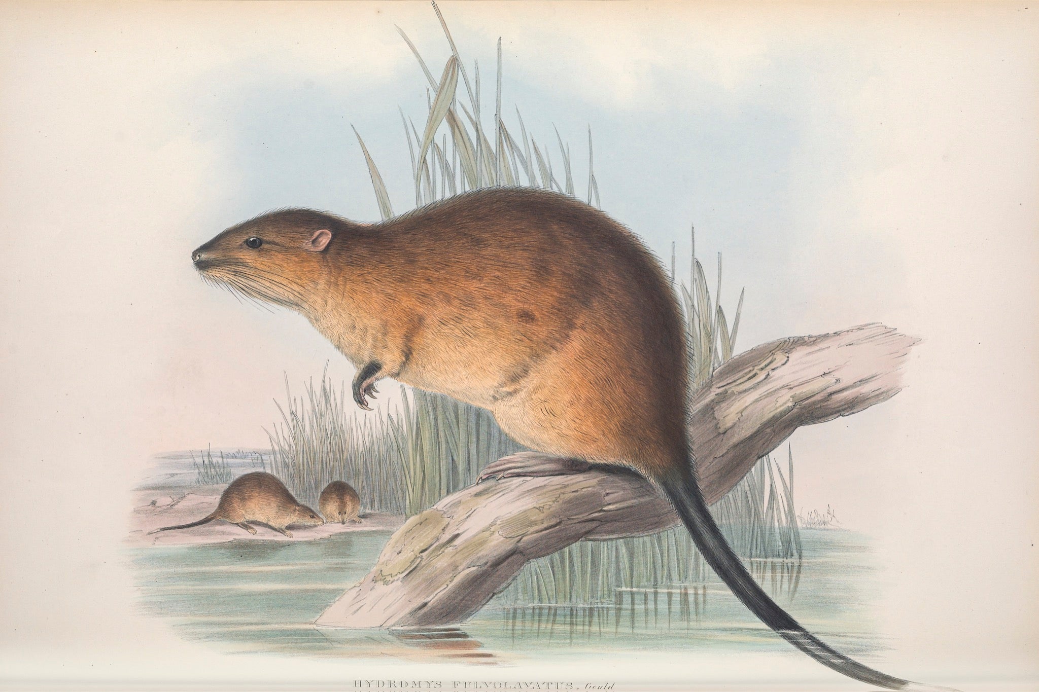 The Rakali, or Water Rat (Hydromys chrysogaster) was once hunted for its soft fur and considered a pest animal, until a protection order in 1938. A campaign in the 1980s to rename the water rat by indigenous name, Rakali, was successfully reversed the stigma attached to this native Australian rodent. With a body size of around 30cm, Rakalis live in burrows on the banks of rivers, lakes and estuaries and feed on aquatic insects, fish, crustaceans, mussels, snails, frogs, birds' eggs and water birds. They are widespread across Australia and New Guinea. (Syn Hydromus fulvolavatus: Gould)