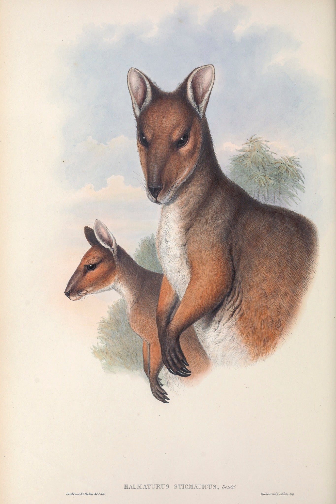 The red-legged pademelon (Thylogale stigmatica) is a is a small marsupial rainforest kangaroo found on the northeastern coast of Australia and in New Guinea. (Gould syn: Branded Wallaby, Halmaturus stigmaticus)