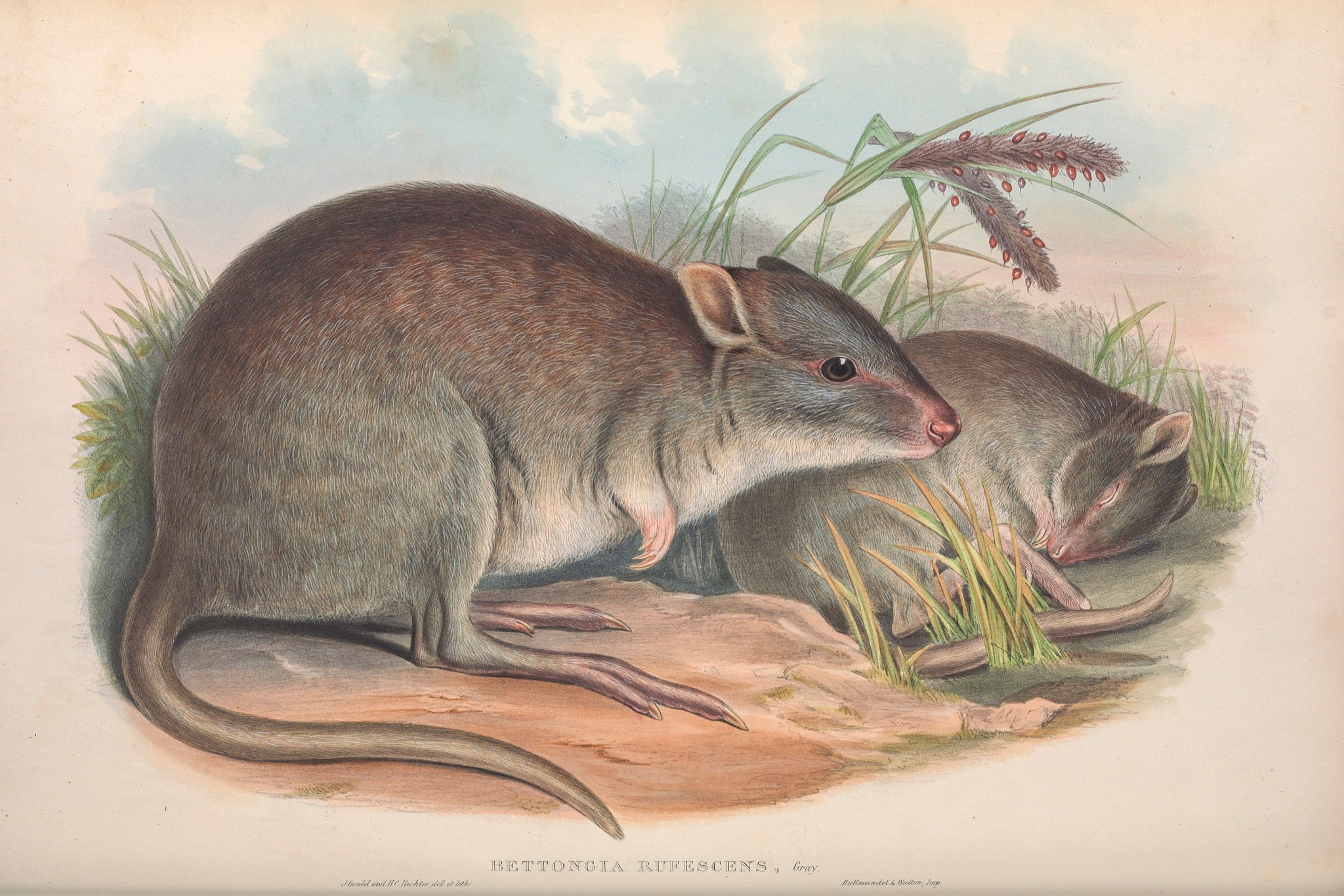 The Rufous bettong, or Rufous rat-kangaroo, is a small marsupial species of the family Potoroidae found in Australia. It is not classified as threatened. The rufous bettong is about the size of a full-grown rabbit. (Gould syn: Bettongia rufescens)