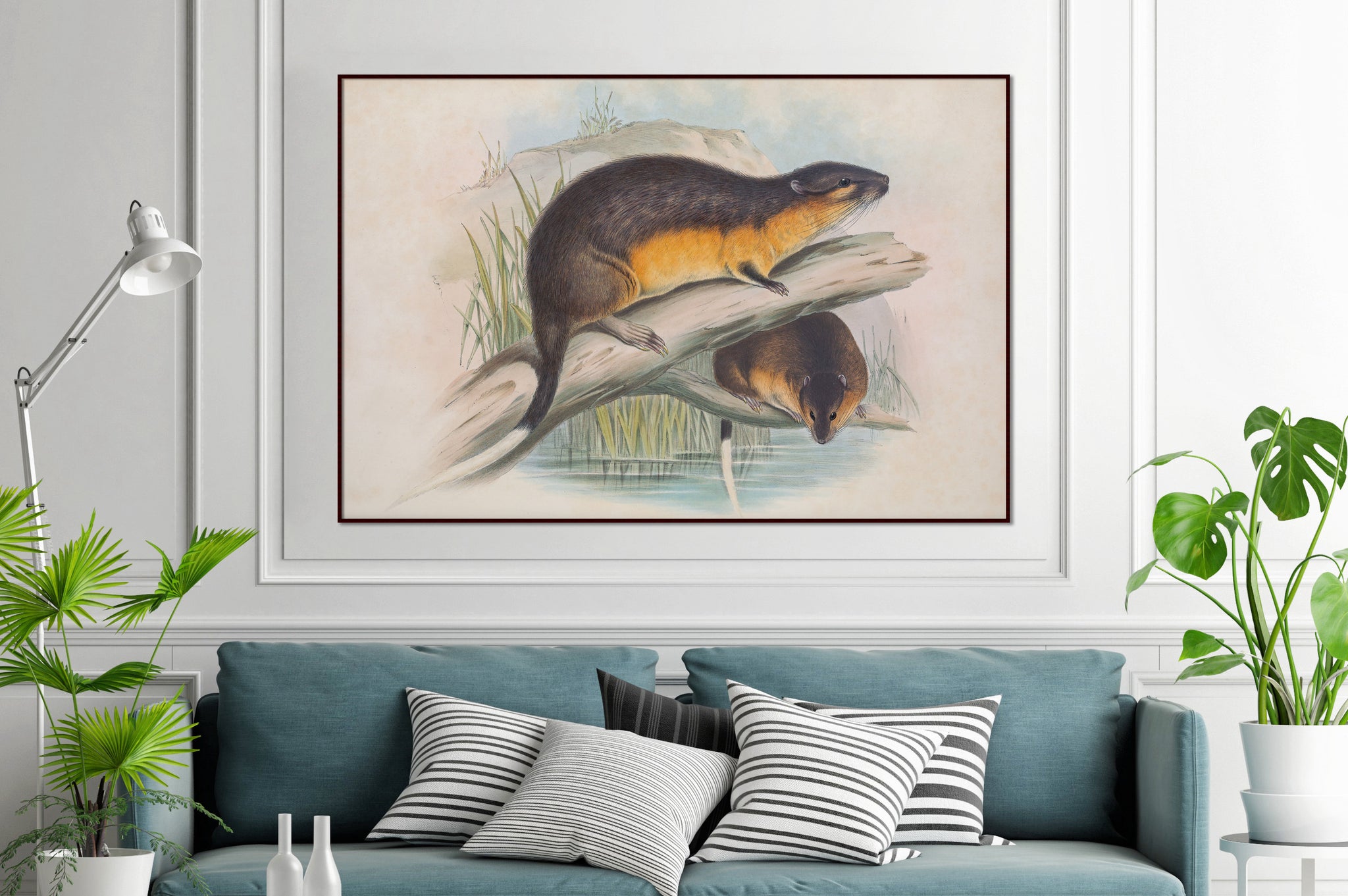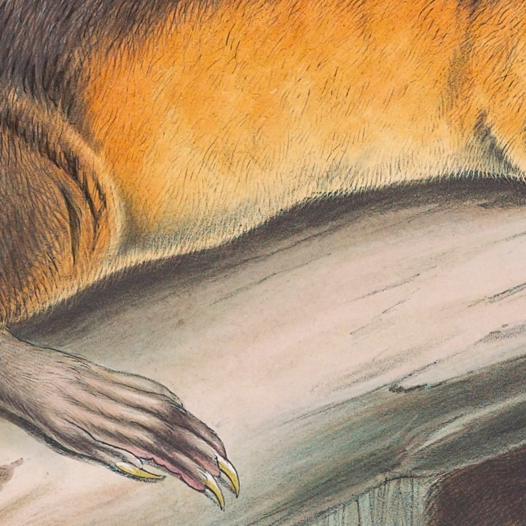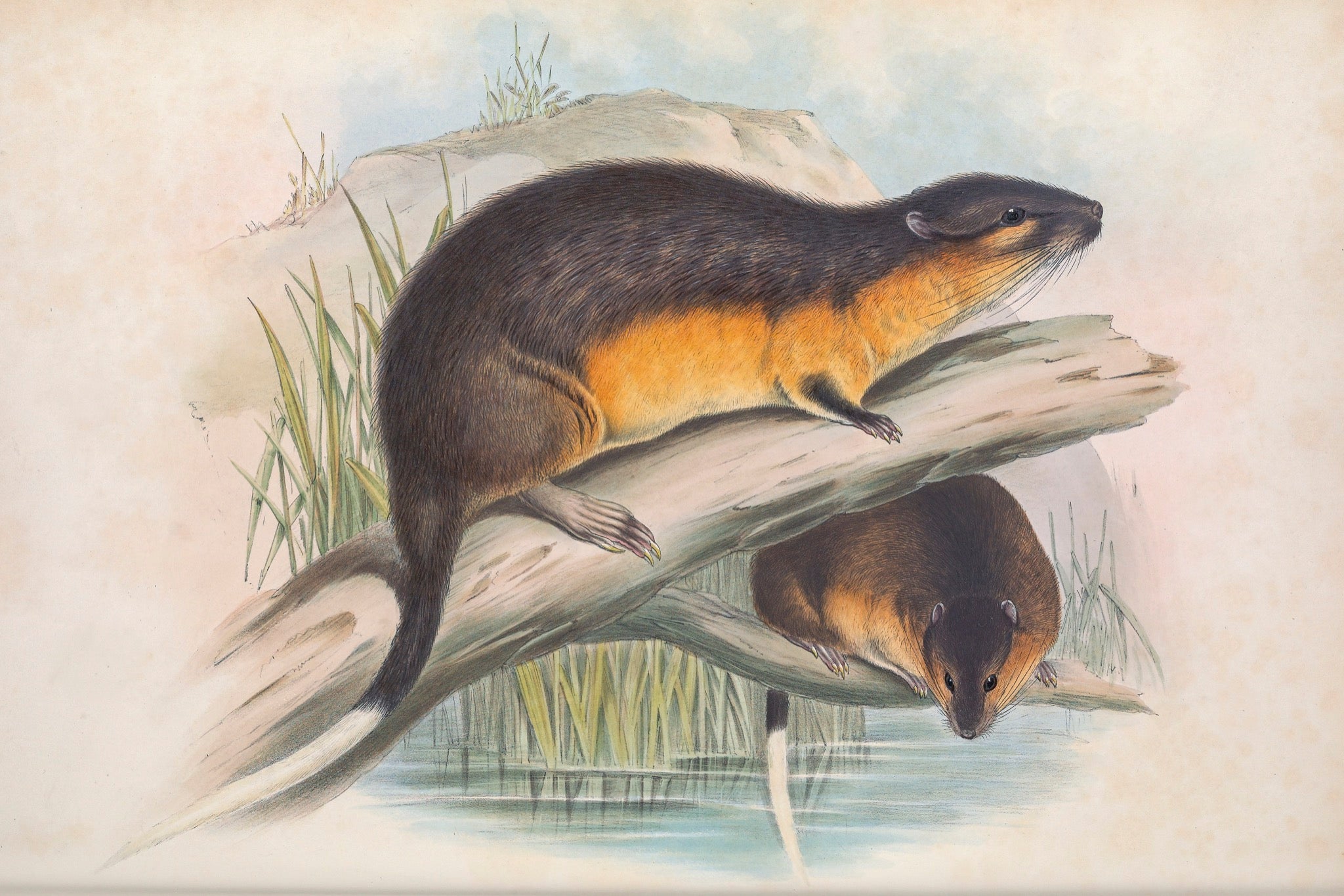 Gould wrote that the 'Golden-bellied Beaver-Rat' (Hydromys chrysogaster) was 'distinguished by the bright golden colouring of the sides of the face, lips, throat, shoulders, flanks and belly... The native habitat of the Hydromys chrysogaster is New South Wales or Van Diemen's Land... frequenting muddy sides of creeks and water-holes and the banks fo the larger rivers and inlets of the sea. The water is its native element; it swims and dives with the greatest facility, and easily secludes itself from view amidst sedges lining the waters edge, or by descending to its hole...'..Once hunted for its soft fur and considered a pest animal, until a protection order in 1938. A campaign in the 1980s to rename the water rat by indigenous name, Rakali, was successfully reversed the stigma attached to this native Australian rodent. With a body size of around 30cm, Rakalis live in burrows on the banks of rivers, lakes and estuaries and feed on aquatic insects, fish, crustaceans, mussels, snails, frogs, birds' eggs and water birds. They are widespread across Australia and New Guinea. (Syn Hydromus fulvolavatus: Gould)