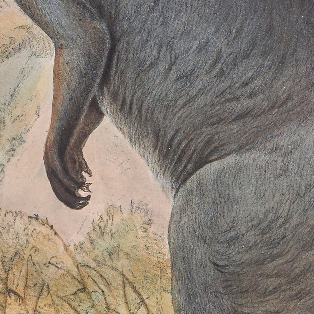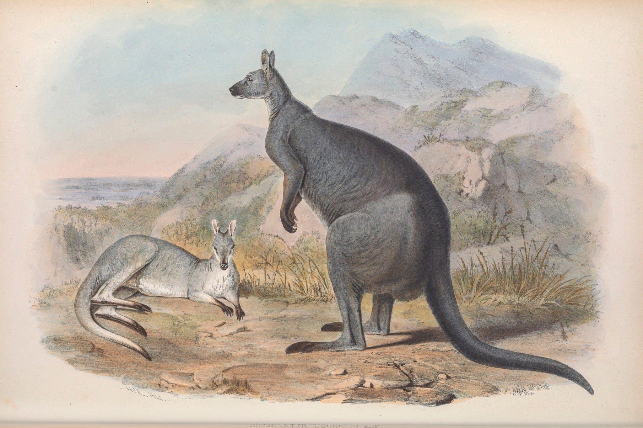 The common wallaroo (Osphranter robustus), also known as the euro, hill wallaroo, or simply wallaroo, is extant across most of Australia...Calling it a 'Black Wallaroo' Gould wrote:.'If there be any one of the Great Kangaroos the discovery of which afforded me more pleasure than another during my sojourn in Australia, it is the Great Black Wallaroo of the mountain districts of New South Wales. Surprising, indeed, it was that so large and conspicuous an animal had not been previously made known; and stil more suprising is the fact that, form the period of my visit in 1838-39 to the present time, 1863, few if any skins of the animal have been sent to Europe. Still I can assure my readers that the existence of the Black Wallaroo is not a myth.'