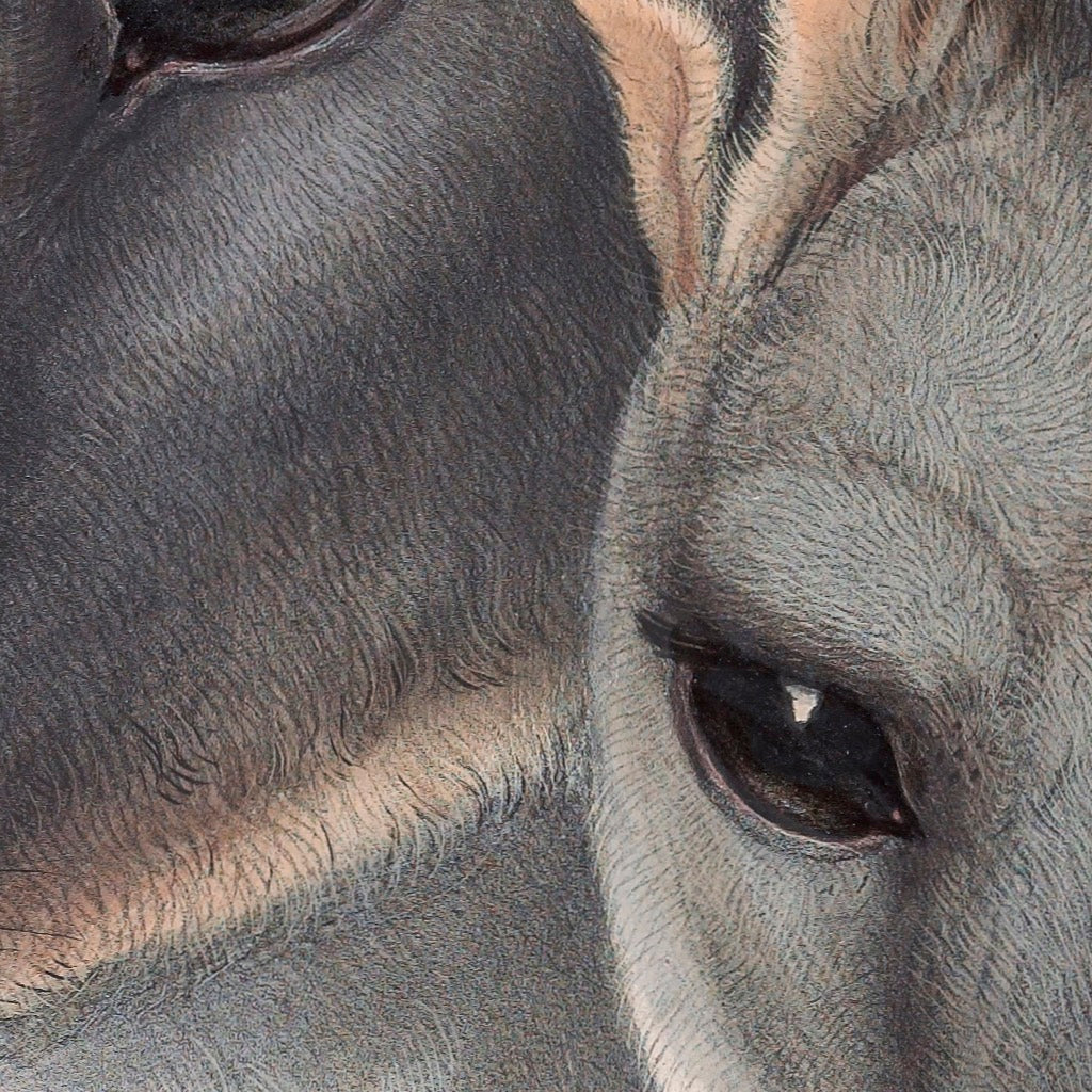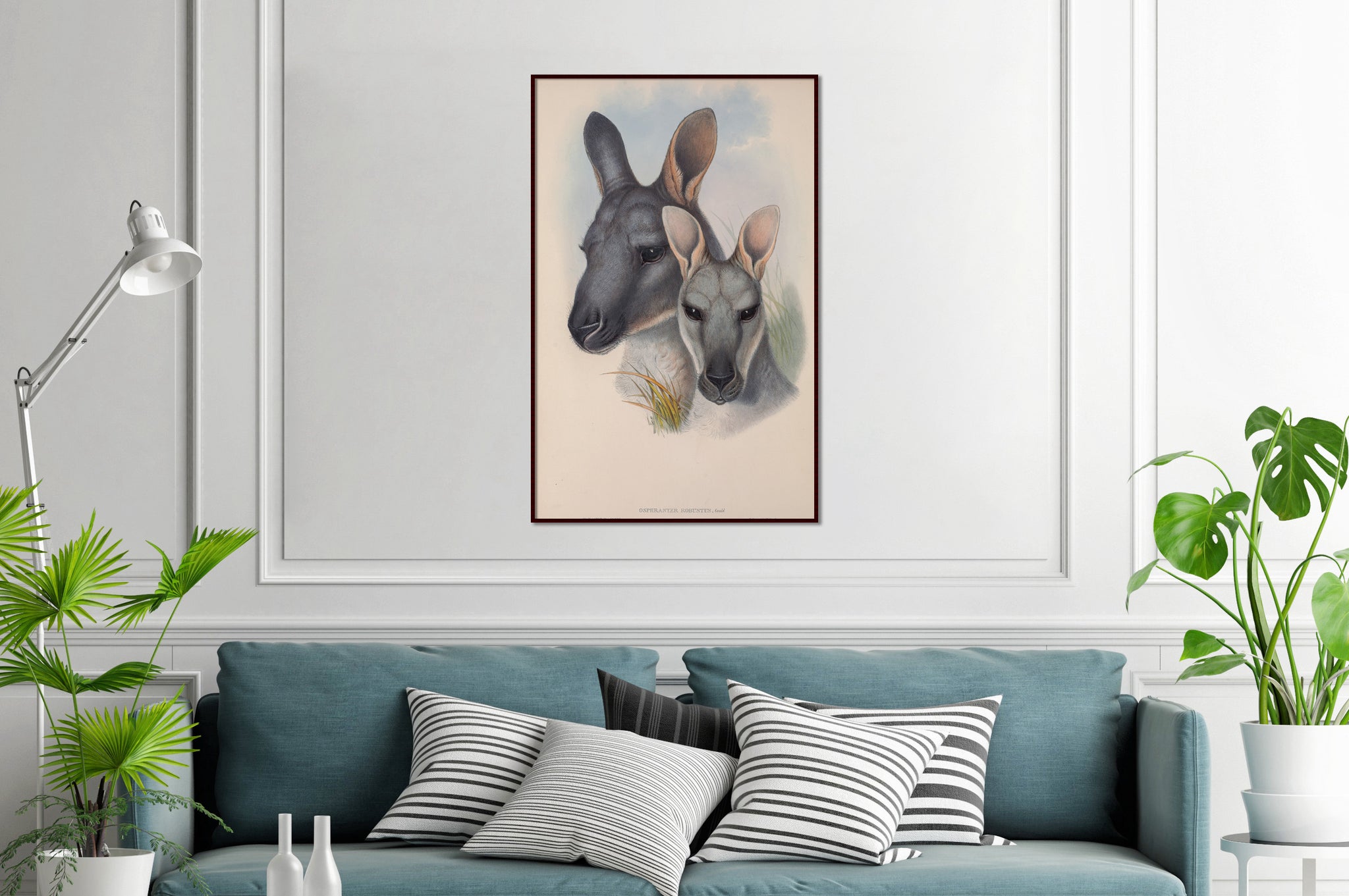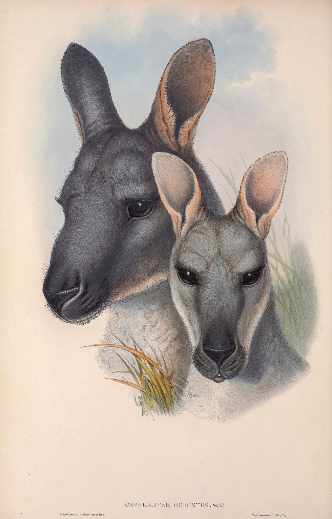 The common wallaroo (Osphranter robustus), also known as the euro, hill wallaroo, or simply wallaroo, is extant across most of Australia...Calling this plate 'Black Wallaroo - Head of a Male and of a Female' Gould wrote: 'If there be any oneof the Great Kangaroos the discovery of which afforded me more pleasure than another during my sojourn in Australia, it is the Great Black Wallaroo of the mountain districts of New South Wales. Surprising, indeed, it was that so large and conspicuous an animal had noe been previously made known; and stil more suprising it the fact that, form the preiod of my viist in 1838-39 to the present time, 1863, ferw if any skins of the animal have been sent to Europe. Still I can assure my readers that the existence of the Black Wallaroo is not a myth.