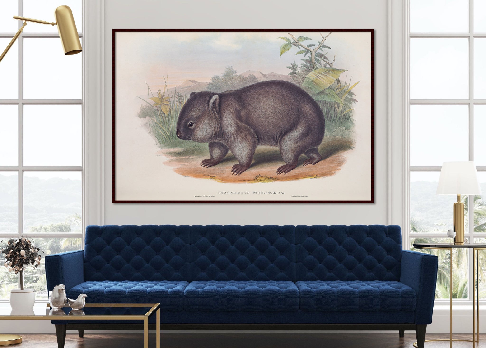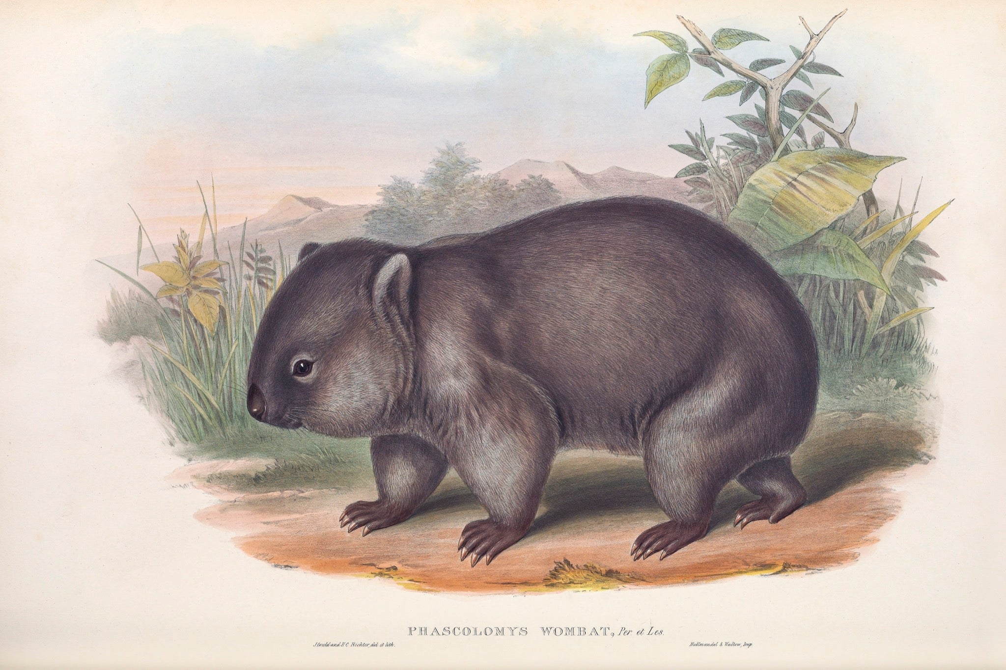The common wombat (Vombatus ursinus), called 'Phascolomys Wombat' by Gould, is common, found in southeastern Australia and Tasmania.