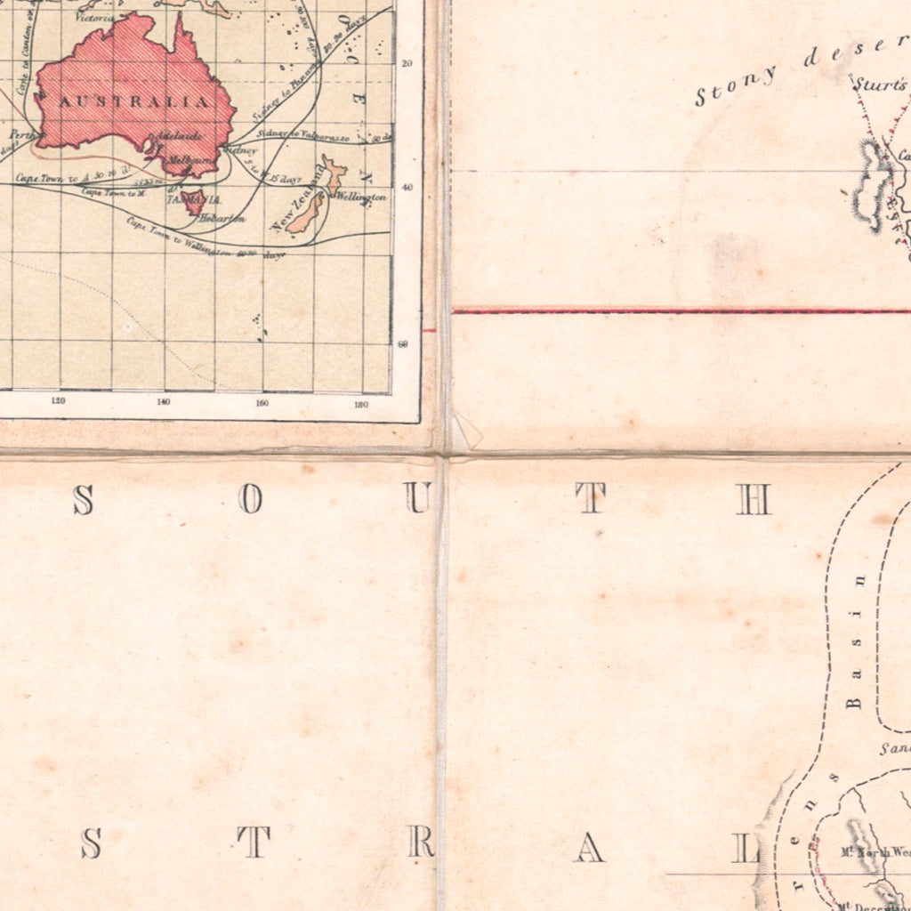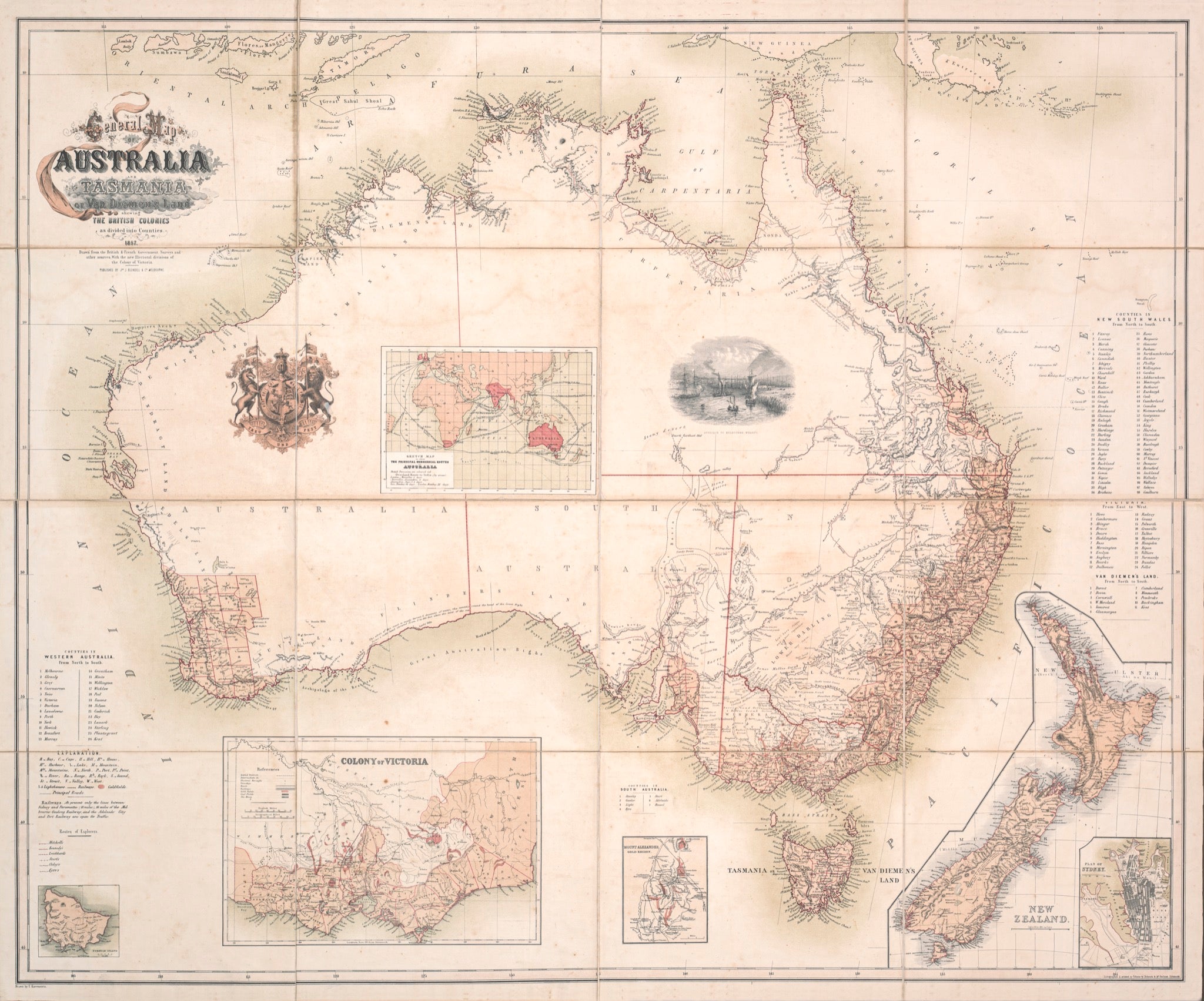 A finely detailed map of Australia, published in Melbourne in 1857 shortly after the Port Phillip District was separated from New South Wales to form the colony of Victoria in 1851, which achieved self government in 1855. Full title:.'Australia & Tasmania or Van Diemen's Land shewing the British Colonies as divided into Counties - 1857 - Drawin for the British & French Government Surveys adn othe sources, With the new Electoral divisions of the Colony of Victoria'.