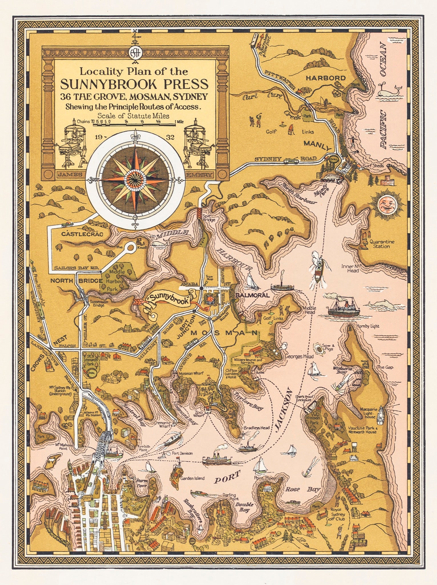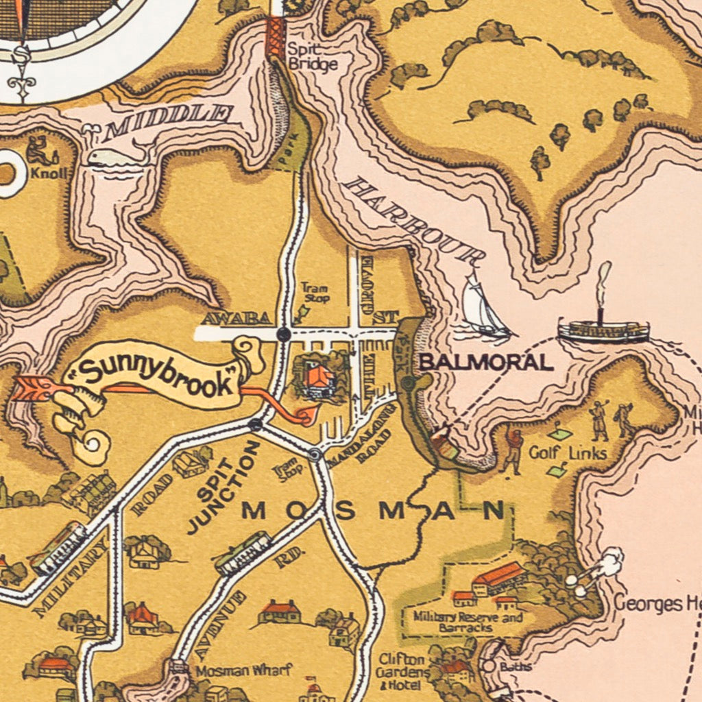 A fabulous illustrative birdseye map of Port Jackson - with the newly built Sydney Harbour Bridge linking the North Shore.