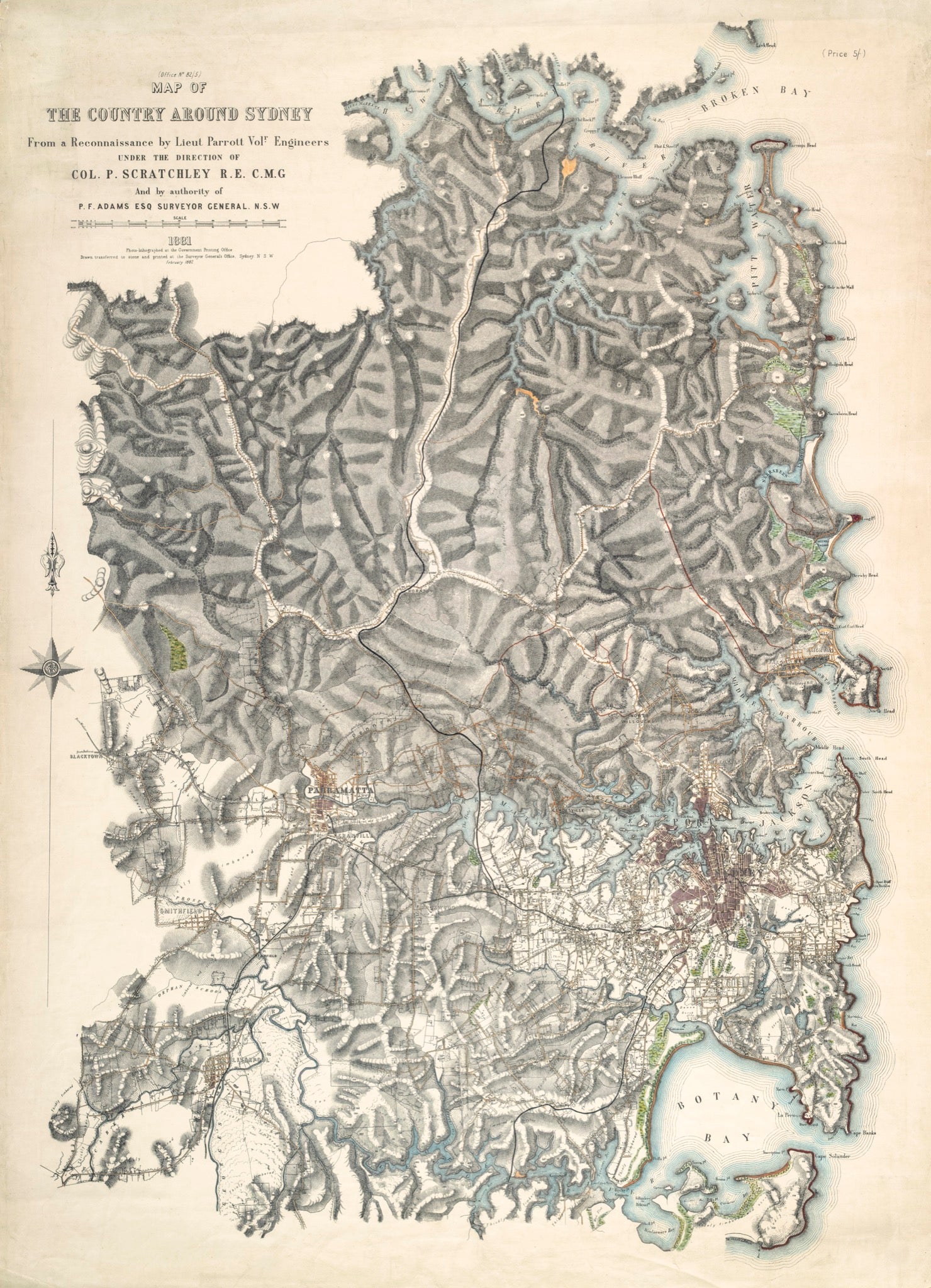 A large and exceptionally detailed map of Sydney in the 1880s, showing the natural topography of the surrounding country, particularly the North Shore all the way to Broken Bay, Kuringai Chase and the Northern Beaches. Early roads and rail lines generally follow the ridges, dictating the pattern of settlement to the present day.