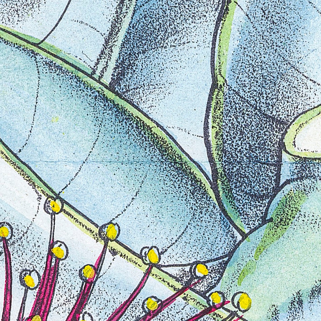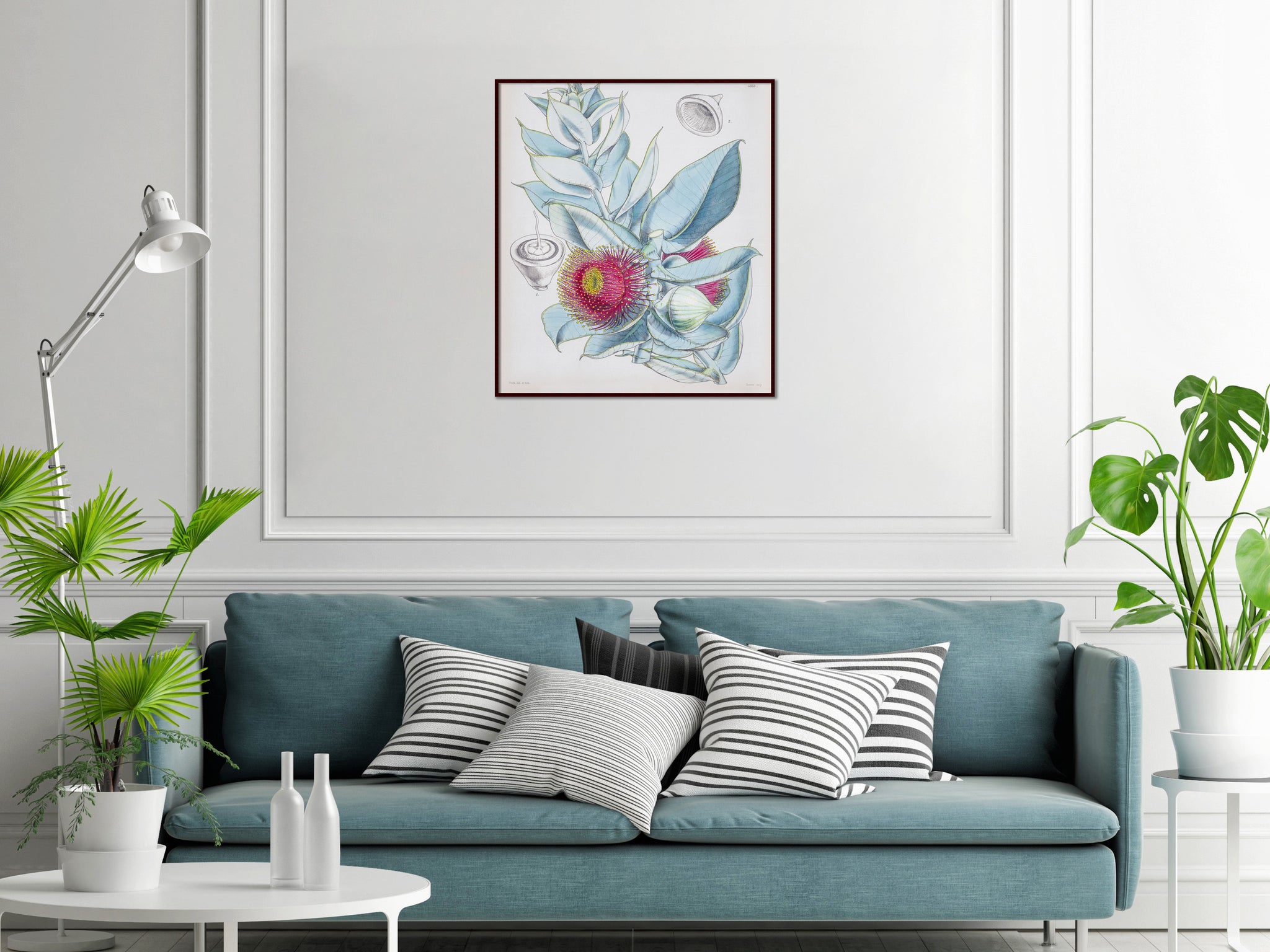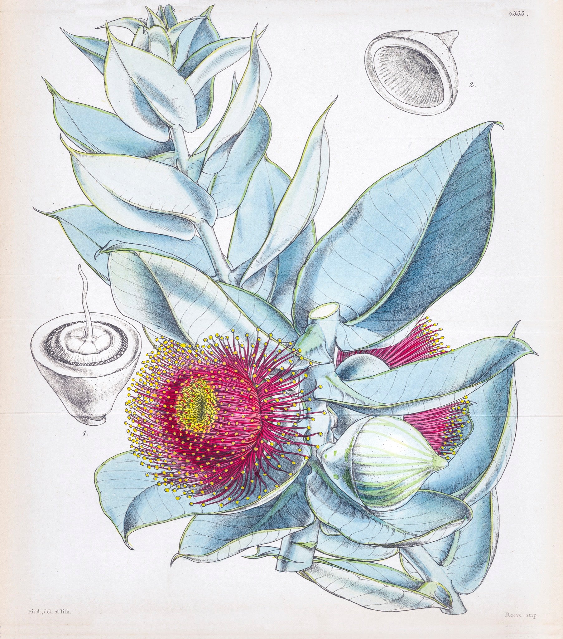 Native to southwestern Australia, also known as Rose of the West and Desert Mallee...Curtis Botanical Magazine, published in Kew Gardens, London since 1787 to today, recorded the latest botanical discoveries from around the world, including Australia. Joseph Banks was a major patron, sending botanists around the globe on plant hunting expeditions. The prints, which were originally hand-painted, are renowned for their botanical accuracy and superb colour.