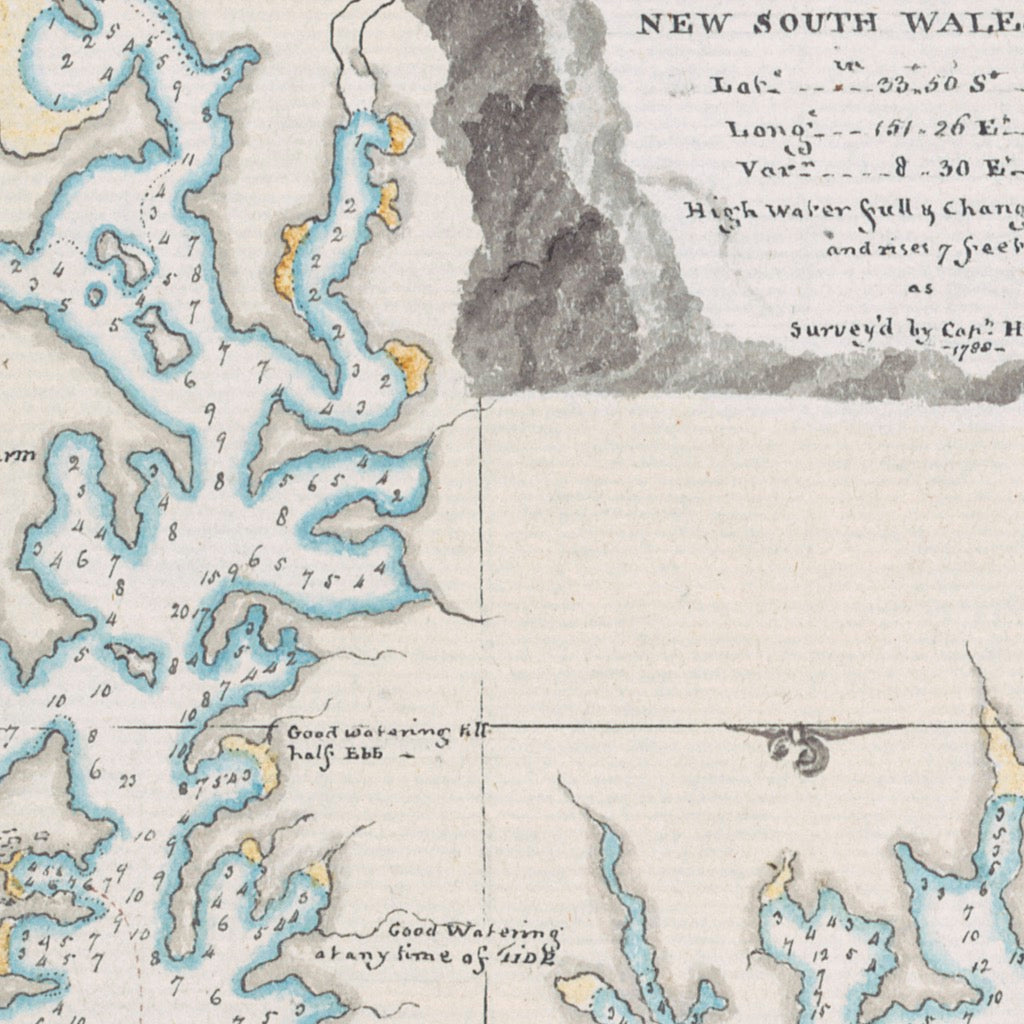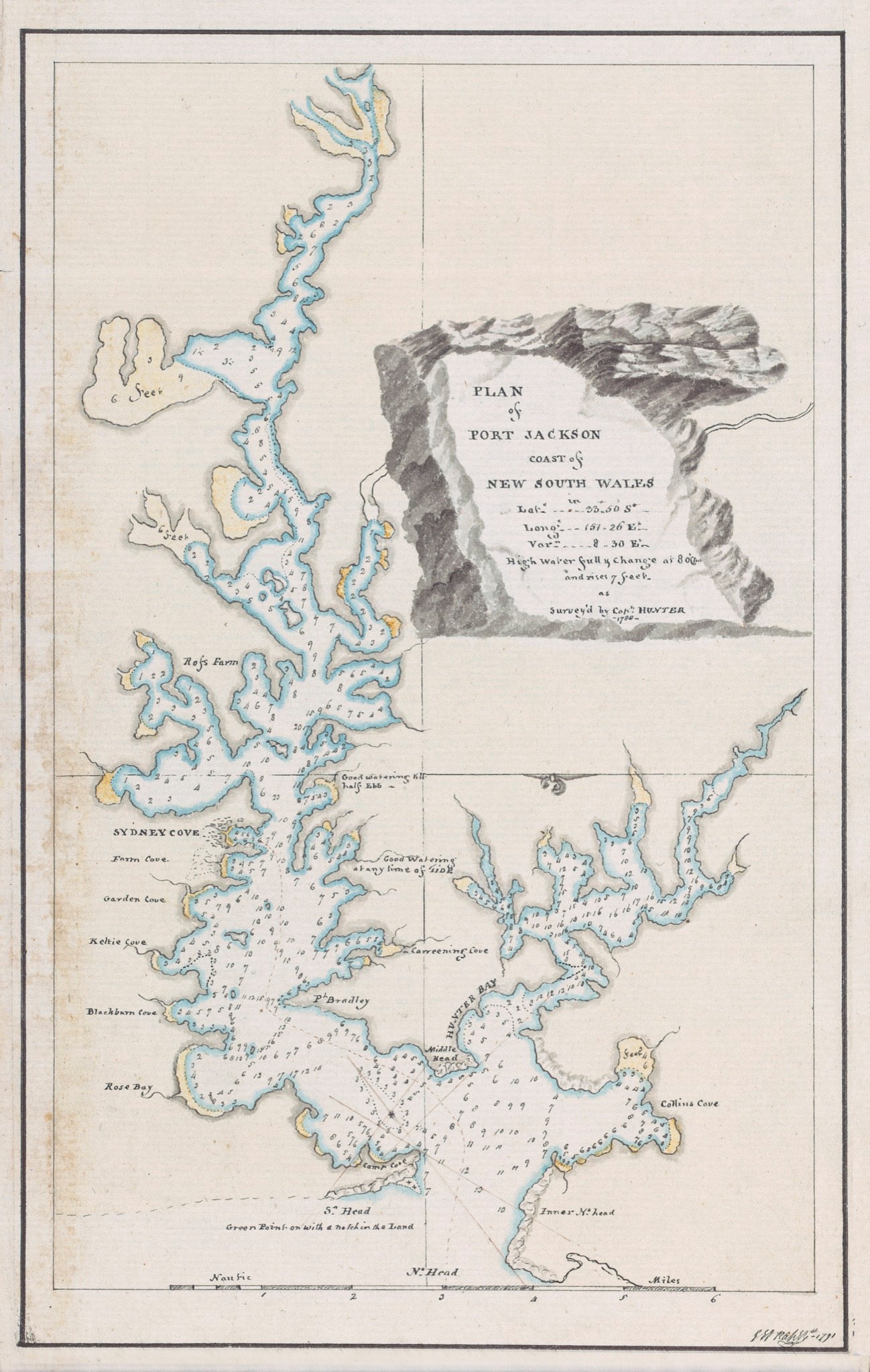 George Raper (1769-1796) was a Royal Navy officer on the HMS Sirius, serving under Captain John Hunter in the First Fleet. Young George Raper produced a collection of fine water colours of birds, flower and landscapes, and maps. This extremely charming plan of Port Jackson is part of the collection of 'Papers of George Raper' held by the National Library of Australia and is counted amongst our national treasures.