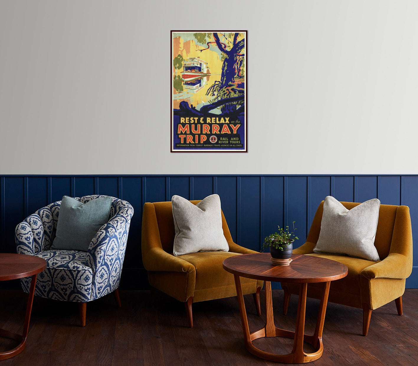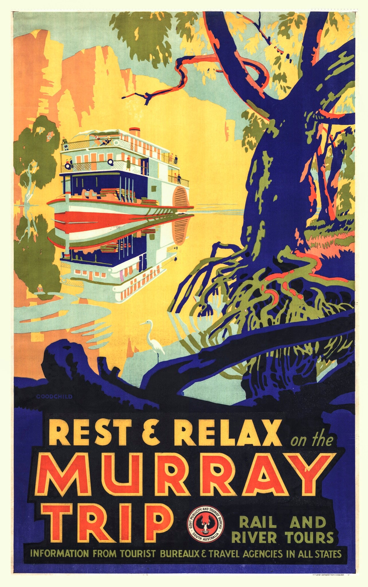 Vintage travel poster circa 1942 showing paddle steamer on the Murray River, South Australia, with backdrop of sunlit cliffs.