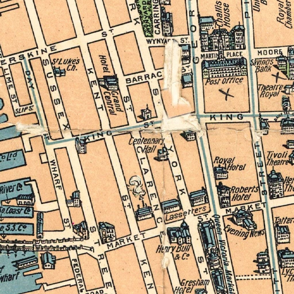A superb illustrative 1920s map of the Sydney, just prior to the Sydney Harbour Bridge. The reproduction shows some wear and tear, consistent with its age.