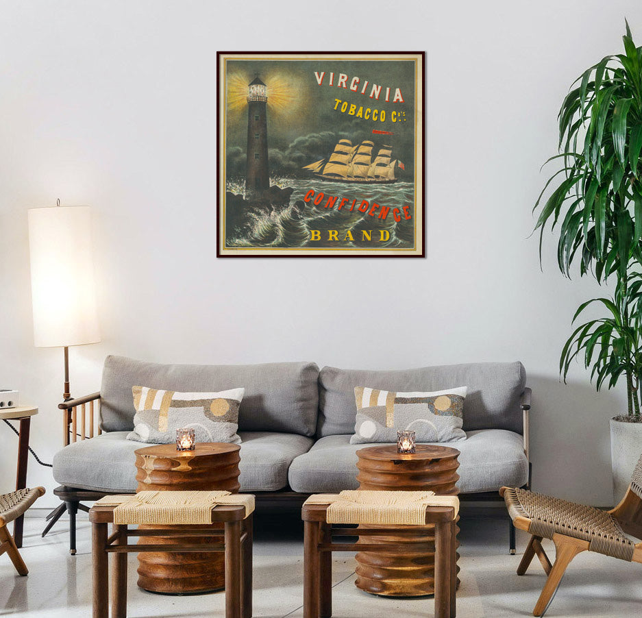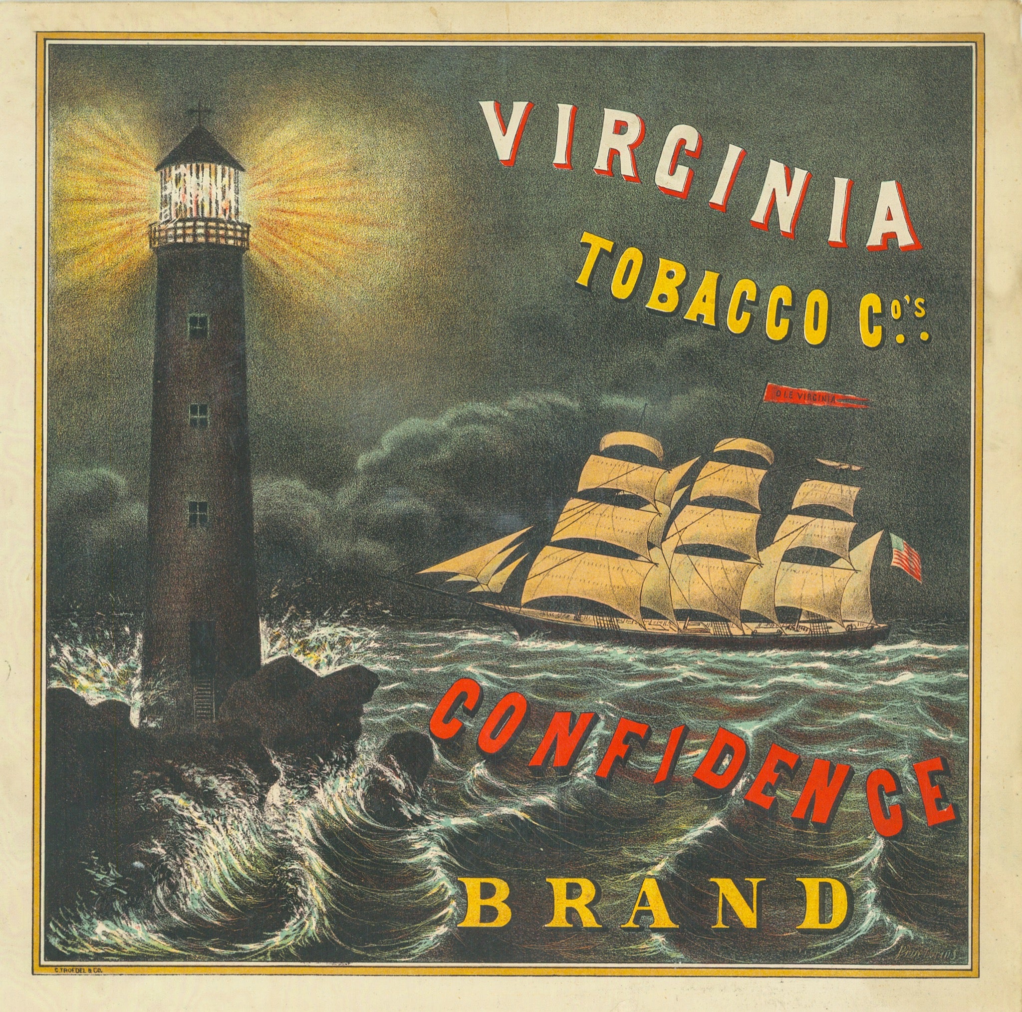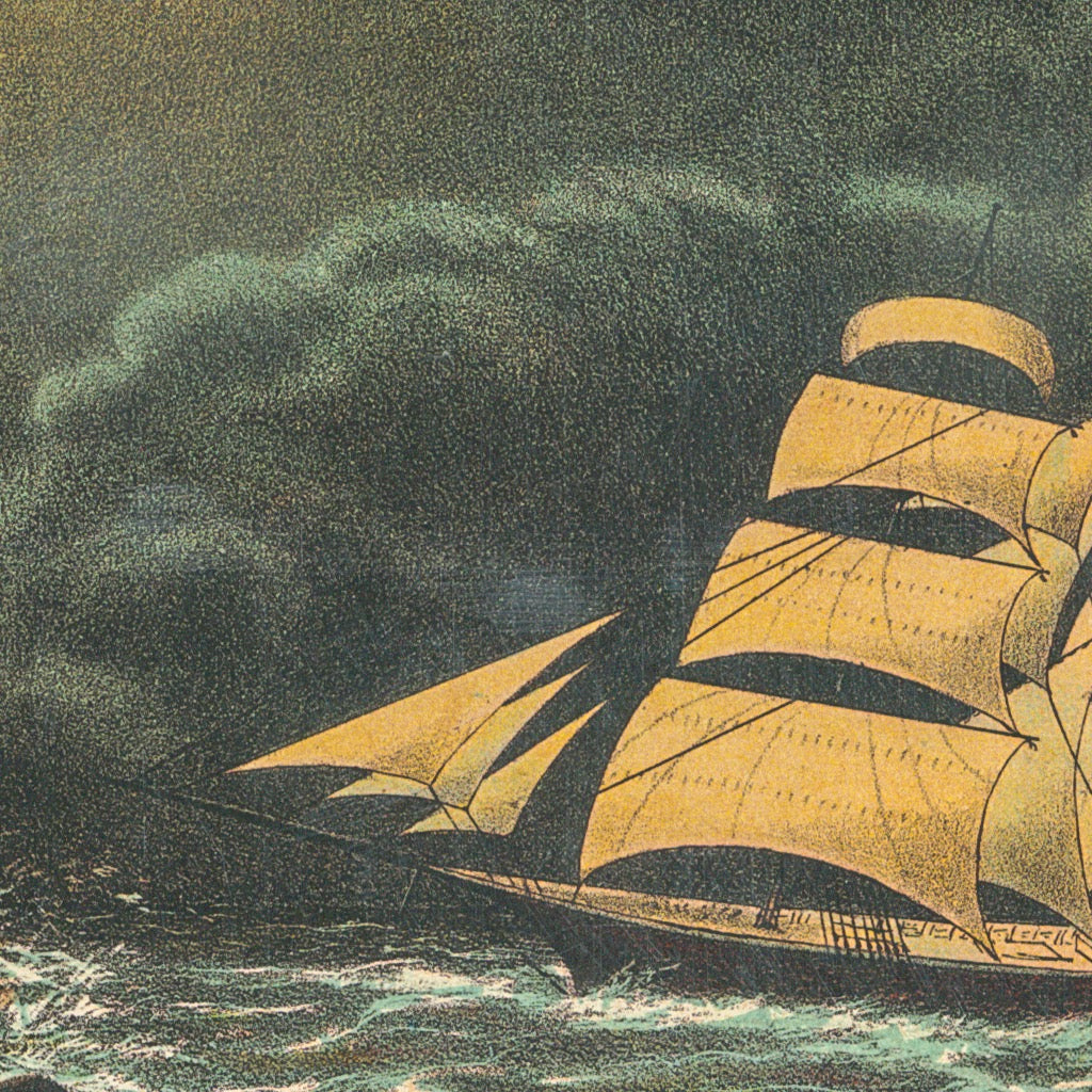 Lighthouse and ship in classic maritime setting, advertising poster printed in Melbourne pre 1880s.