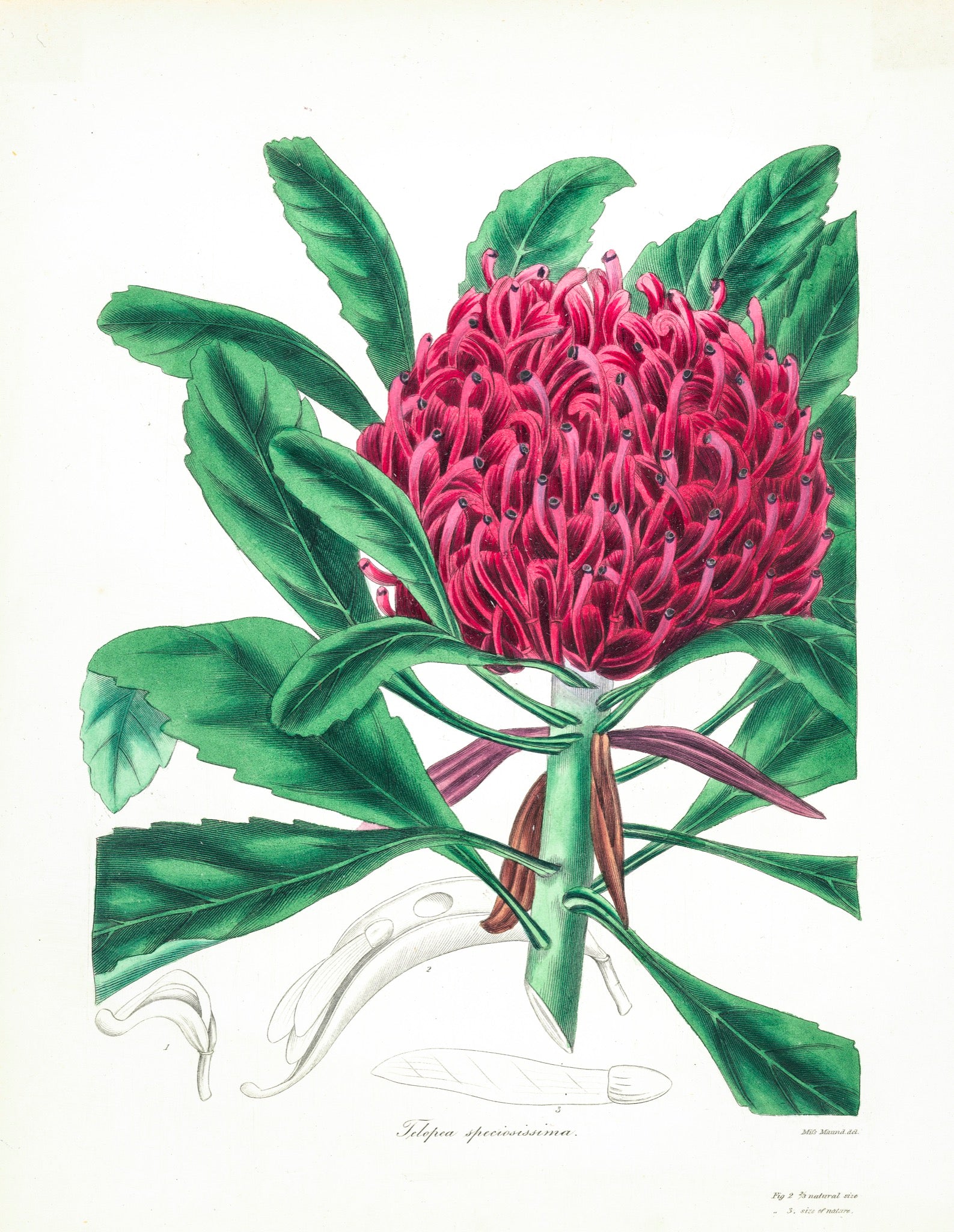 Native to southeastern Australia, the waratah is the floral emblem of New South Wales. The name 'waratah' comes from the Eora Aboriginal people, the original inhabitants of the Sydney area...The Showy Waratah from Benjamin Maund's 'The Botanist' (1836-1842). The illustrations for Maund's publication were prepared by several women artists, including his two daughters. This fine waratah engraving was originally drawn by Miss Maund. Little biographical information is recorded about these talented women.