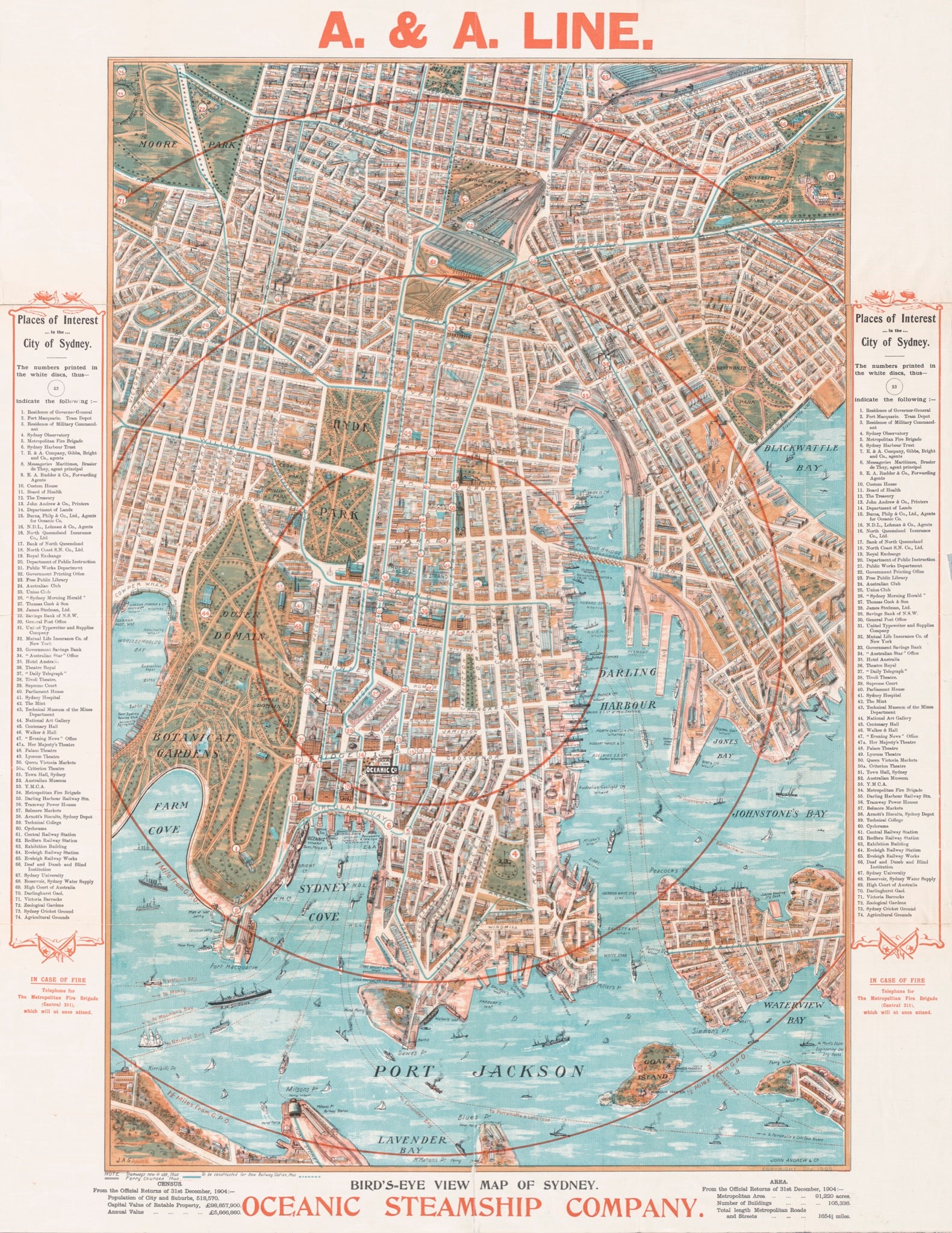 A. & A. Line. Bird's-eye View Map of Sydney, 1905