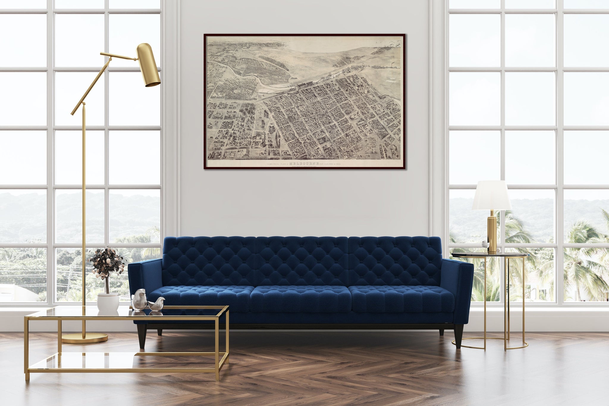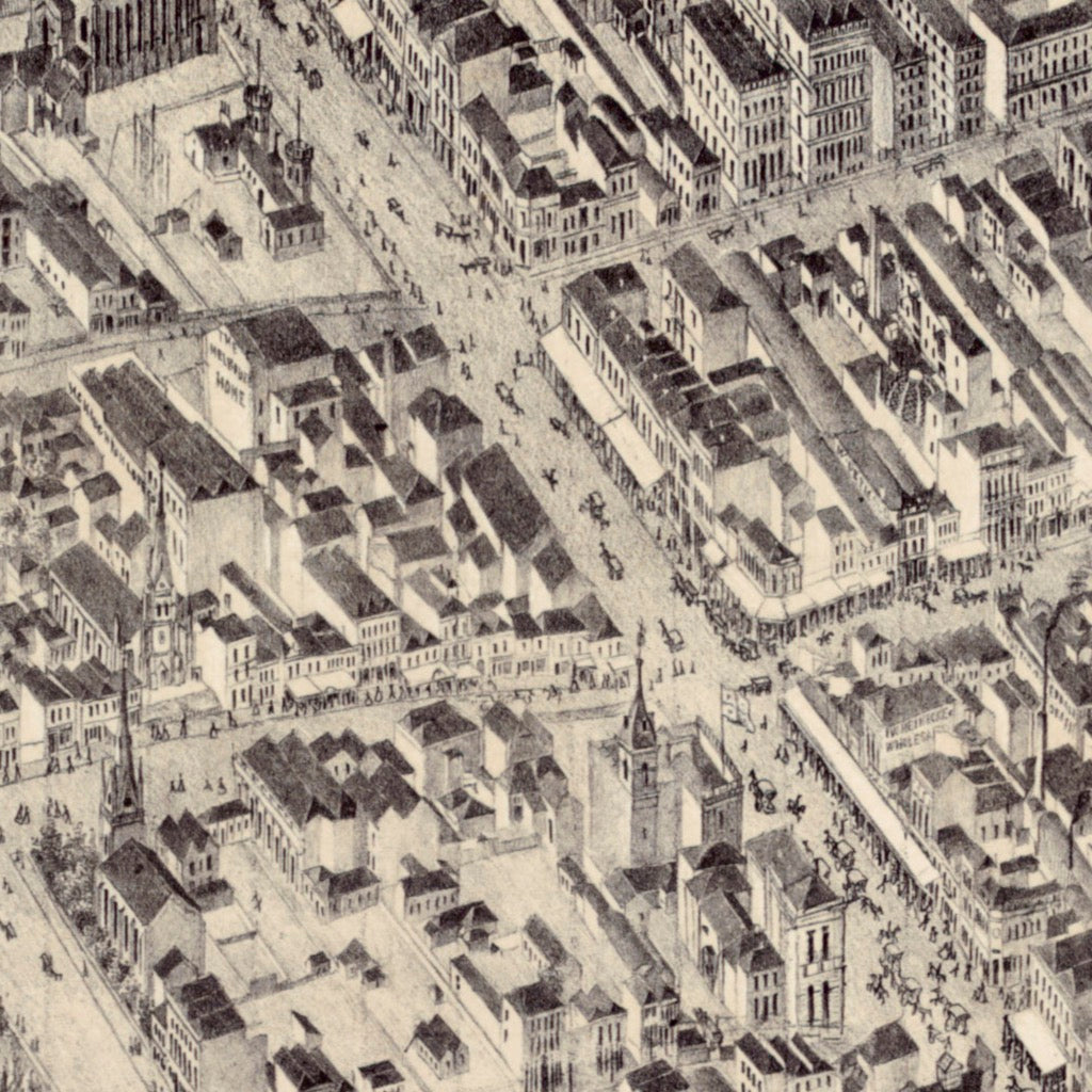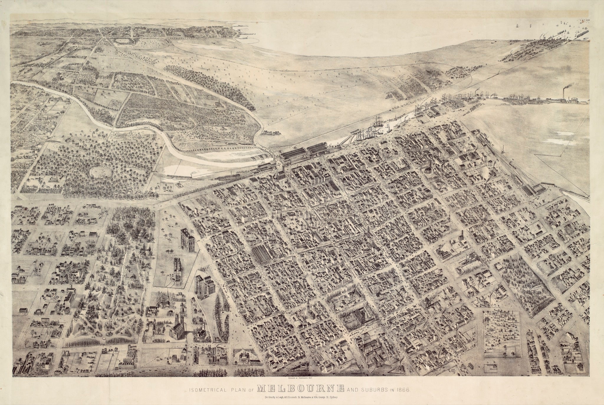 De Gruchy & Leigh's birdseye view of Melbourne at the height of the gold rush, looking towards Hobsons Bay. Tall ships can be seen docking in the Yarra, and trains approaching Flinders St Station and Hobson Bay. The MCG and Fitzroy Gardens to the left. Botanic gardens and St Kilda visible in the distance...Very detailed. (See also colour version).