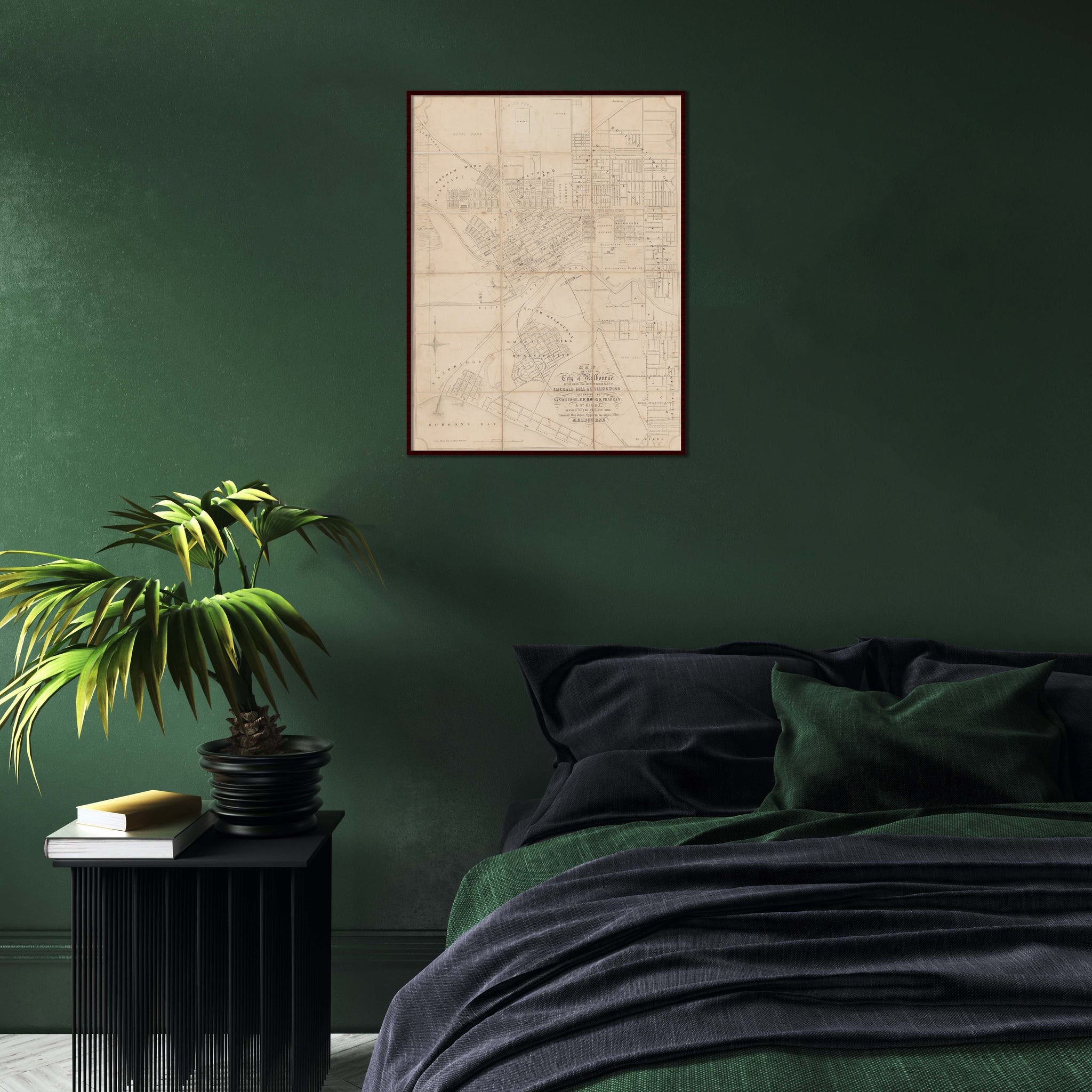 A fine sepia-toned map, with elegant title block, of Melbourne circa 1860, showing streets, railways, public buildings and churches, schools, parks and reserves, and names of wards.