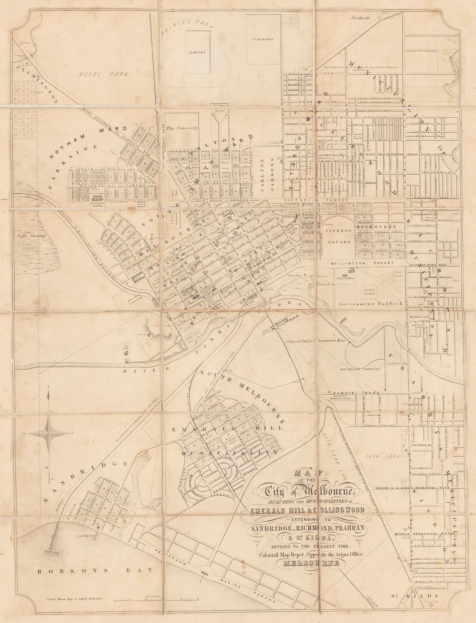 "Map of City of Melbourne including the Municipalities of Emeral Hill & Collingwood extending to Sandridge, Richmond, Prahran & St Kilda, revised to the present time."