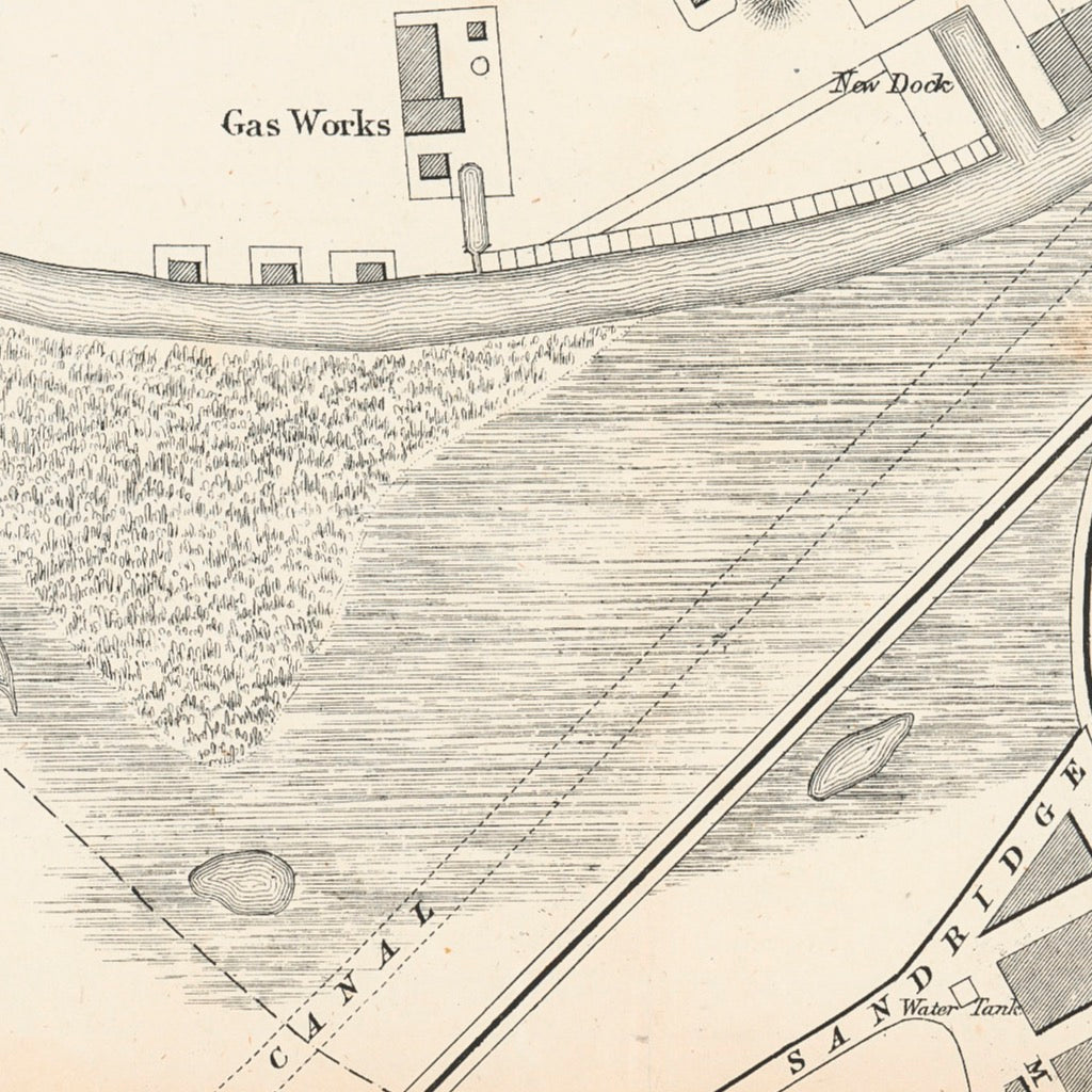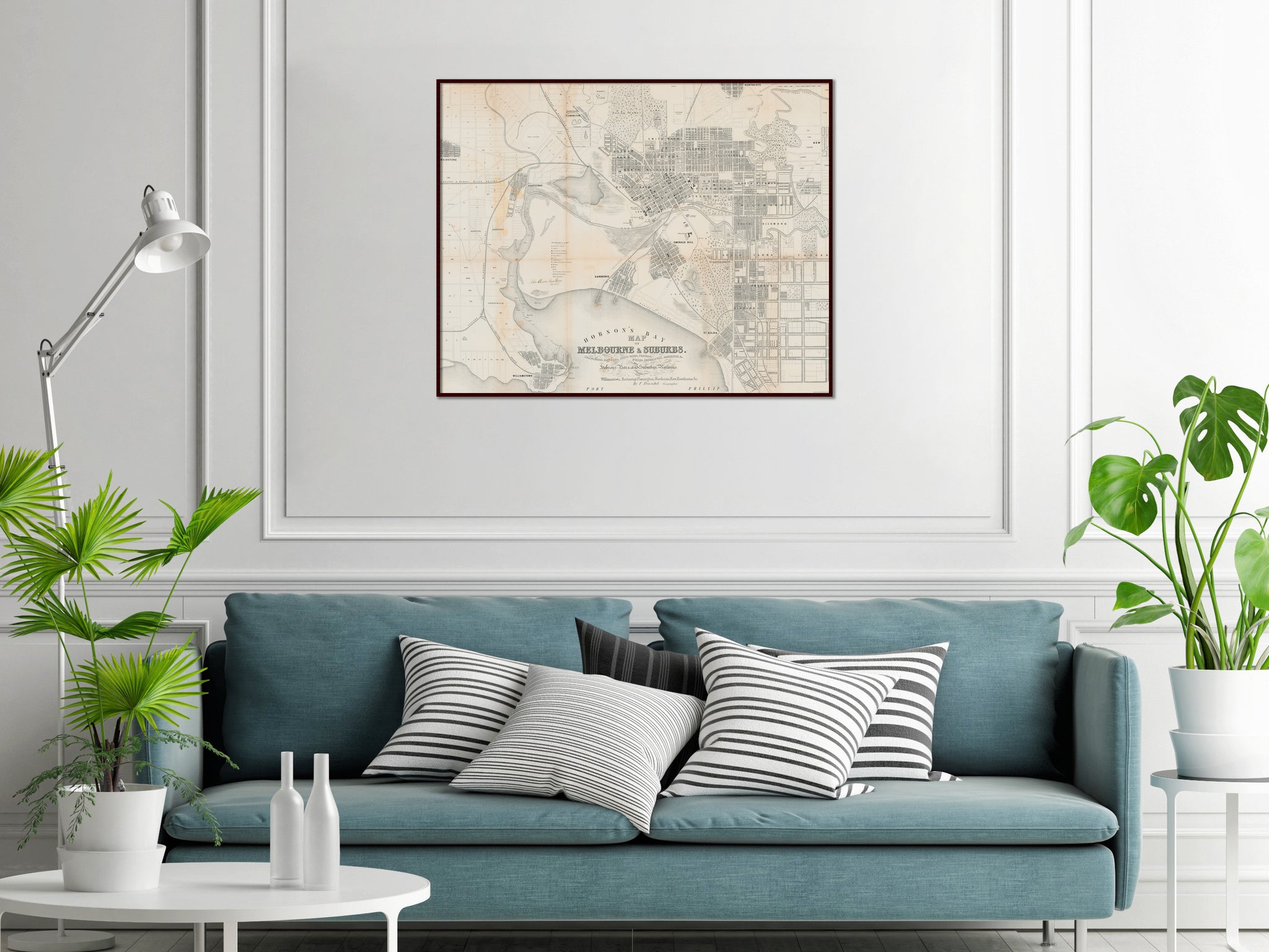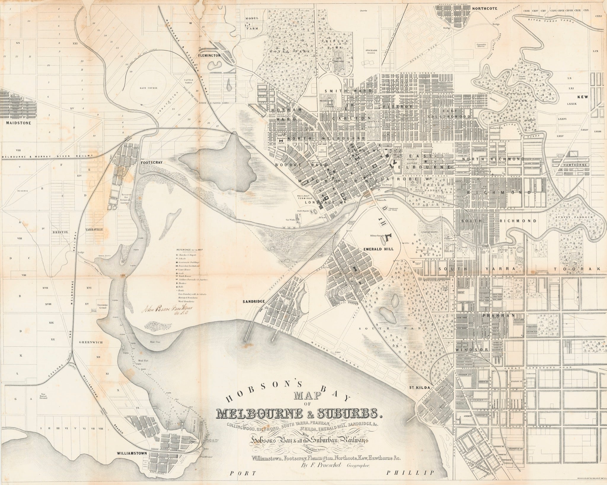Circa 1860 map, also showing: 'Collingwood, Richmond, South Yarra, Prahran, St Kilda, Emerald Hill, Sandridge, Etc with Hobsons Bay & all the Suburban Railways and Head of Inland Railways, Also Footscray, Flemington, Northcote, Kew, Hawthorn, Etc.'..An elegant black and white map of early Melbourne.