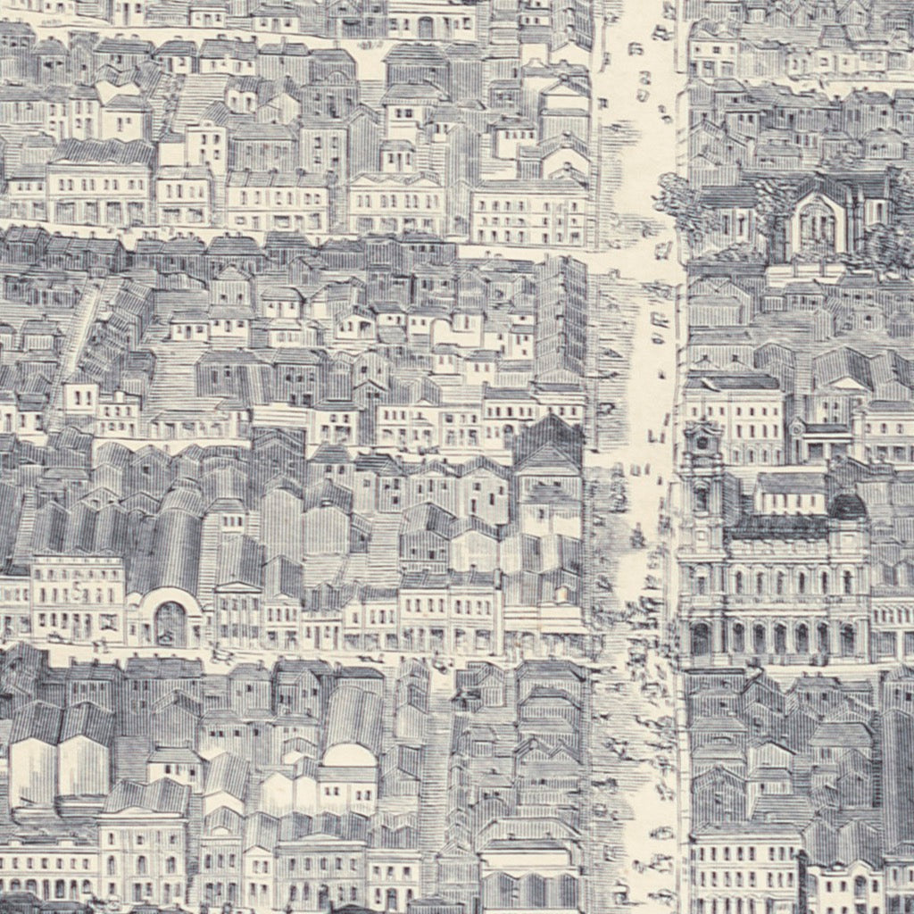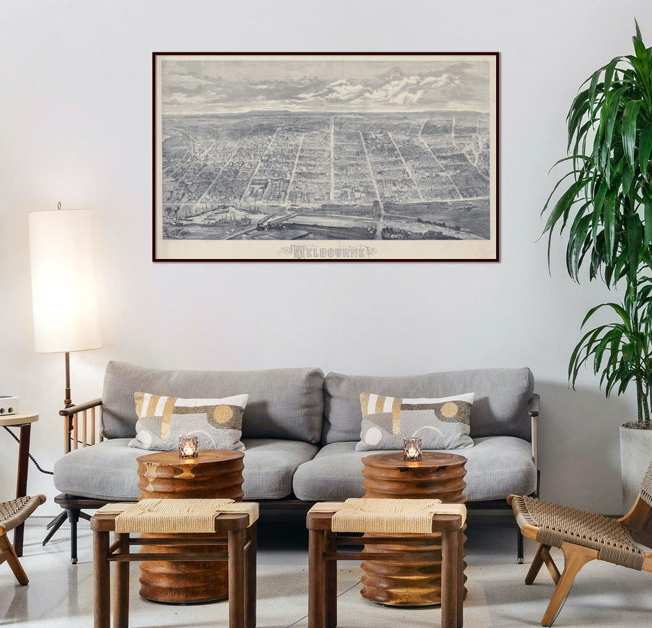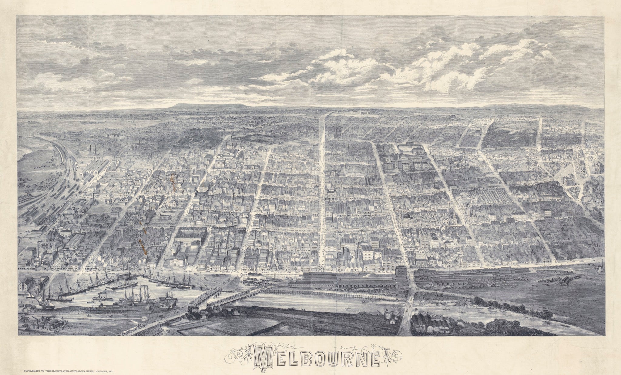Looking over the Yarra at Southbank northward, Elizabeth St and Flinders Street Station centre. This spectacular lithograph became the basis for De Gruchy & Leigh's birdseye a decade later 'Melbourne 1880', prepared for the International Exhibition. Comparing the views, it is fascinating to see the changes in the rapidly developing city.