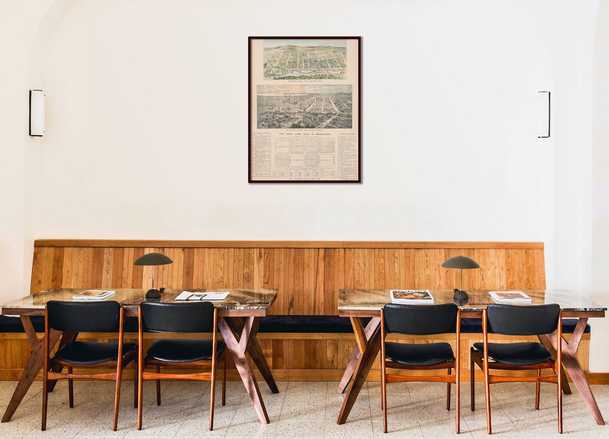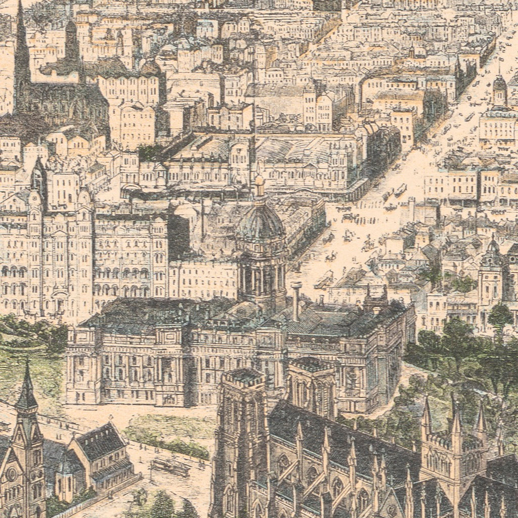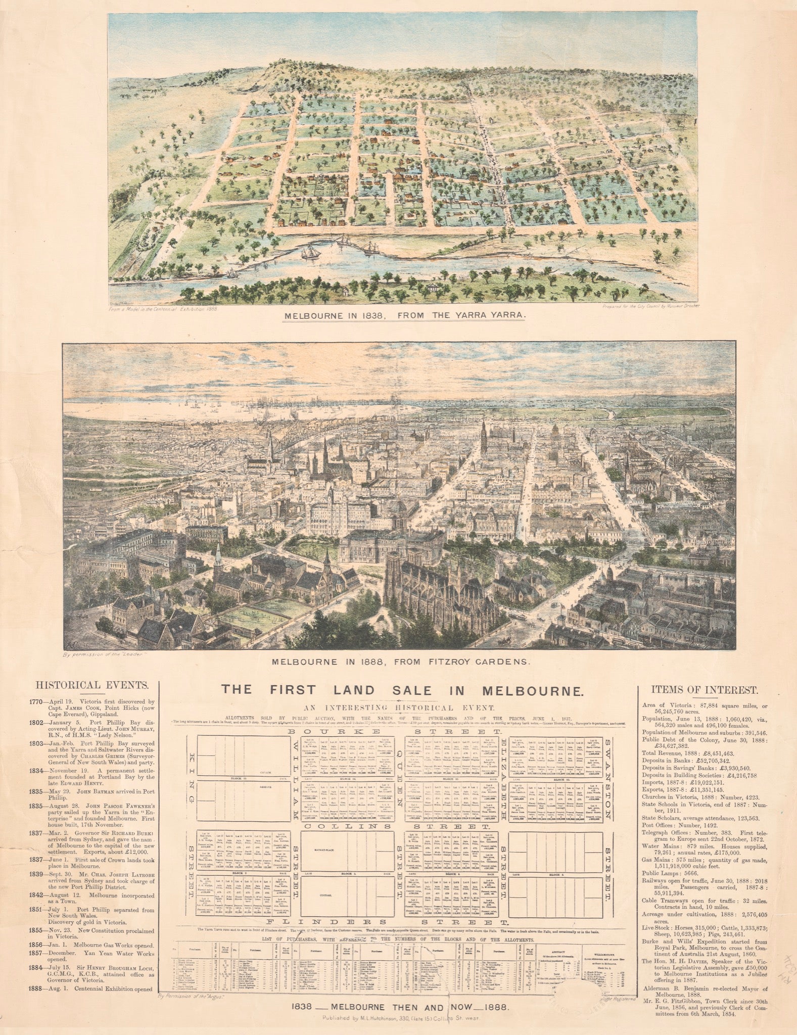 Birdseye views of Melbourne in 1838 from the Yarra compared to 1888 from the Fitzroy Gardens. Also includes details of the first land sale in Melbourne 1837 and current land values (eg J Batman paid 75 pounds in 1838 for a block on Flinders St worth 198,000 pounds 'present value' in 1888). Sheet includes lists of historical events and items of interest.