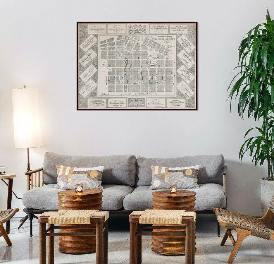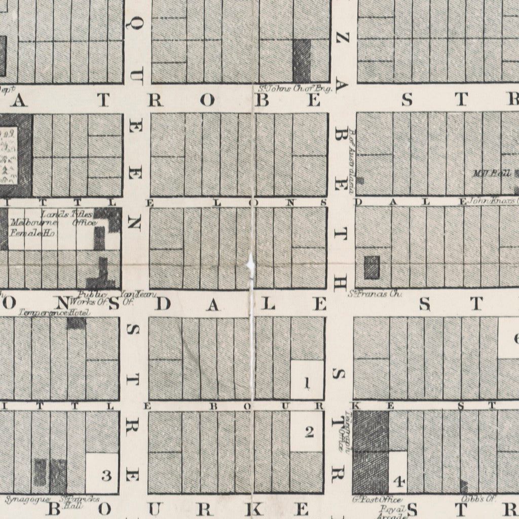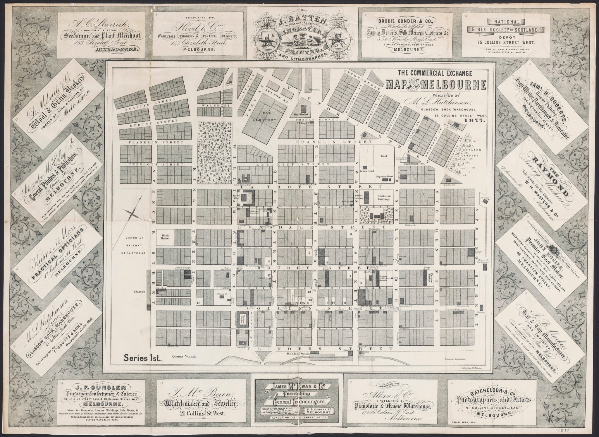Map of Melbourne central business district in 1870s with businesses advertised in margin.