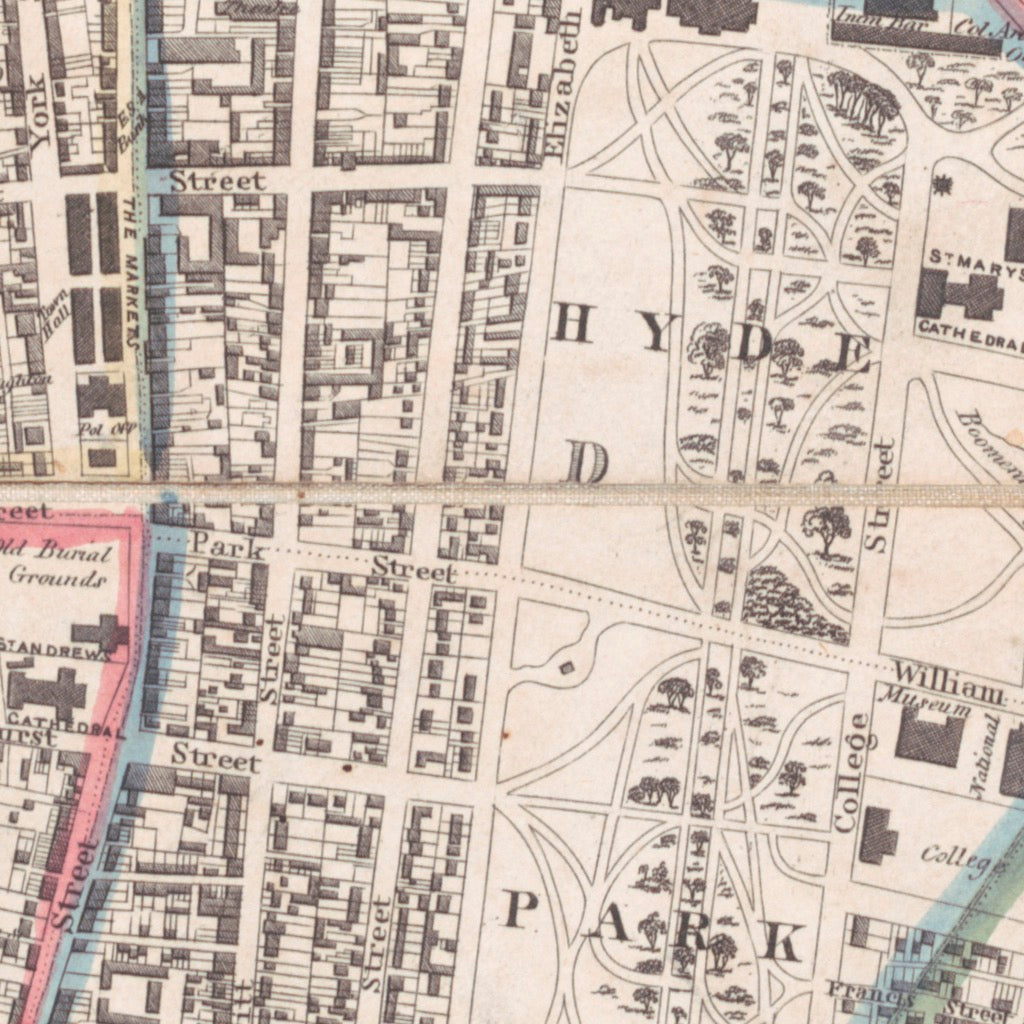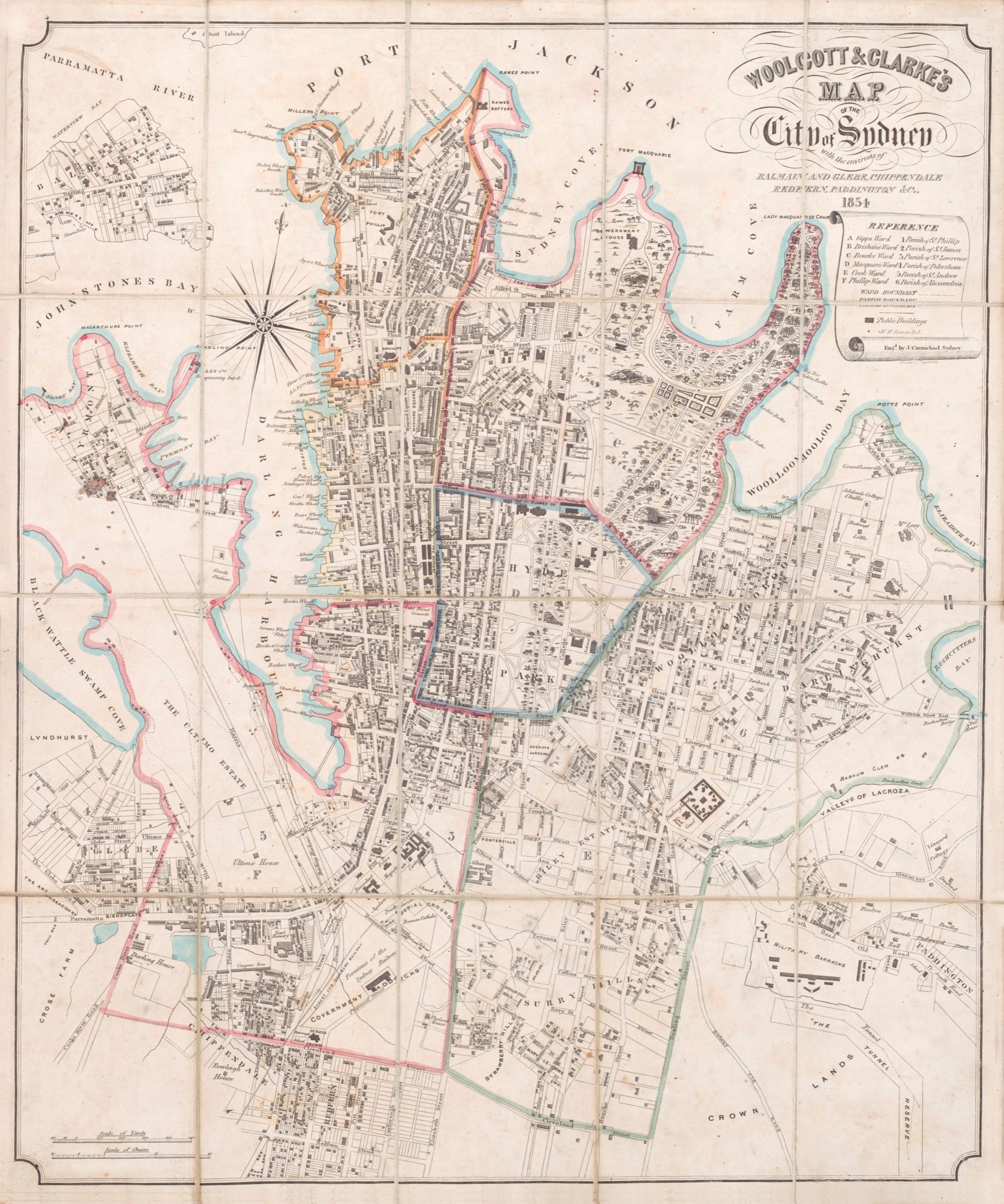 This is one of the great maps of Sydney, produced at the start of the gold rush and the subsequent boom in population and economic growth. This beautifully detailed map shows many of the great houses and estates surrounding the city beginning to be subdivided for housing, as new suburbs like Balmain, Glebe, Redfern, Chippendale and Paddington emerge on the city fringes. The first stage of the Sydney to Goulburn railway, the Parramatta passenger service, is under construction, and opened the following year in 1855.